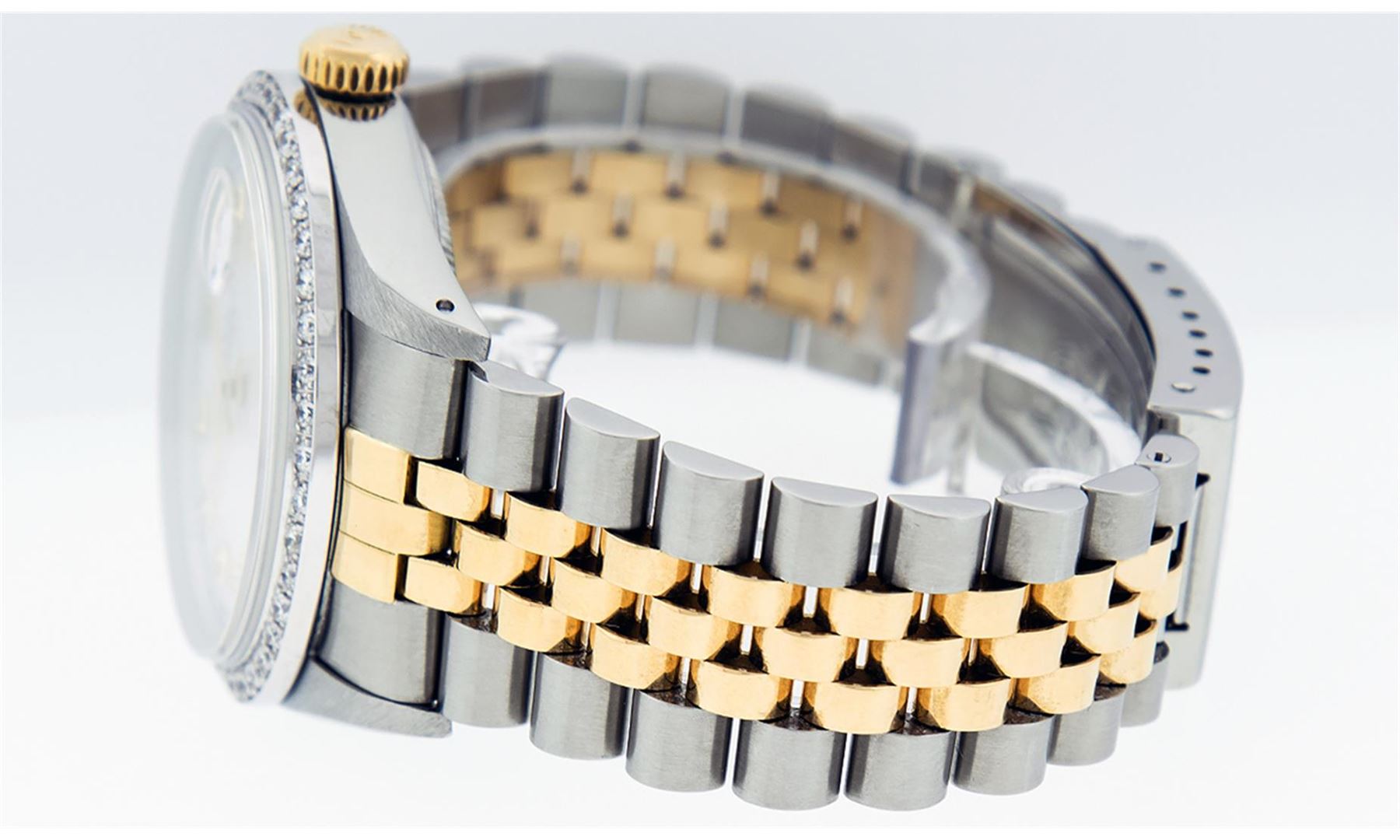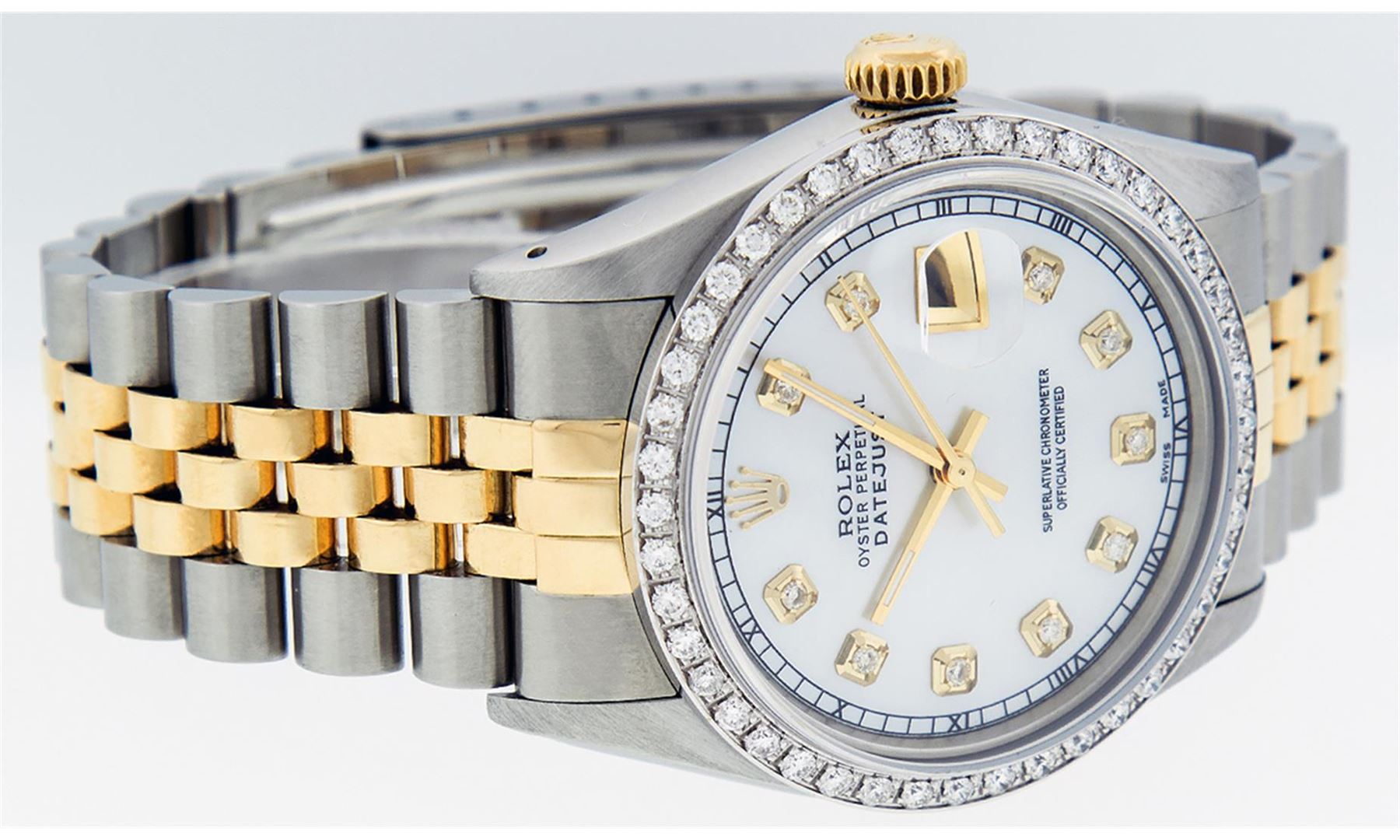 One Mens 14K Yellow Gold Two Tone Rolex Datejust Polished, Serviced & Electronically Tested, 14K Yellow Gold & Stainless Steel Case: 36mm, 14K Yellow Gold Crown, Custom Bezel: 18K White Gold Beadset Diamond Bezel, Diamond Count: 44 Diamonds, Total Weight 1.00 Carat, Clarity: SI-VS, Color: G to H. Custom Crystal: New Synthetic Sapphire Cyclops Lens. Custom Hands: New Luminecent Hands. Movement: Automatic Winding Movement Caliber 3035. Custom Dial: Mother Of Pearl Diamond Dial, 10 Diamonds in Dial G To H In Color, SI-VS Clarity, Date Window: 3 O'Clock Position Date Display, Quickset, Model: 16013 Datejust. Condition: G-6 Extra Fine. Bracelet:Two Tone 14K Yellow Gold & Stainless Steel Jubilee. Bright Polish. 7.0 Inch Length, Adjustable. Standard Clasp, With Rolex Logo. This Watch Has Been Serviced Time Tested And Is In Excellent Condition It Is Free Of All Scratches And Dents.