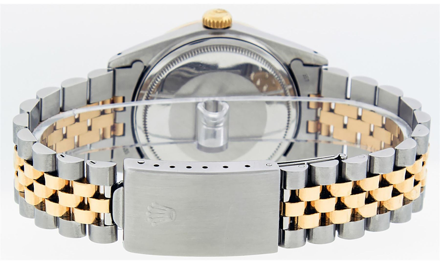 One Men's 14K Yellow Gold Two Tone Rolex Datejust Polished, Serviced & Electronically Tested, 14K Yellow Gold & Stainless Steel Case: 36mm, 14K Yellow Gold Crown, Custom Bezel: New 18K Yellow Gold Beadset Diamond Bezel, Diamond Count: 44 Diamonds, Total Weight 1.00 Carat, Clarity: SI-VS, Color: G to H. Custom Crystal: New Synthetic Sapphire Cyclops Lens. Movement: Automatic Winding Movement Caliber 3035. Custom Dial: Mother Of Pearl Dial Set With Diamond Hour Markers and Synthetic Sapphire Baguette Markers On 6 and 9, Diamond Count: 8 + 2 Synthetic Sapphire Baguettes, Color: G To H In Color, Clarity: SI-VS, Date Window: 3 O'clock Position Date Display, Quickset, Model: 16013 Condition: G-6 Extra Fine. Bracelet: Two Tone 14K Yellow Gold & Stainless Steel Jubilee. Bright Polish. 7.0 Inch Length, Adjustable. Standard Clasp, With Rolex Logo. This Watch Has Been Serviced Time Tested And Is In Excellent Condition It Is Free Of All Scratches And Dents.