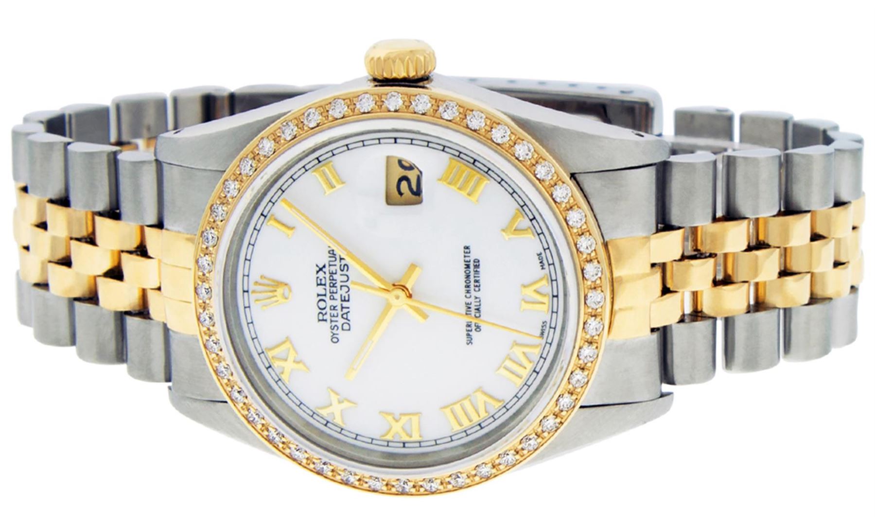 One Mens 14K Yellow Gold Two Tone Rolex Datejust Polished, Serviced & Electronically Tested, 14K Yellow Gold & Stainless Steel Case: 36mm, 14K Yellow Gold Crown, Custom Bezel: 18K Yellow Gold Beadset Diamond Bezel, Diamond Count: 44 Diamonds, Total Weight 1.00 Carat, Clarity: SI-VS, Color: G to H. Custom Crystal: New Synthetic Sapphire Cyclops Lens. Custom Hands: New Luminecent Hands. Movement: Automatic Winding Movement Caliber 3035. Custom Dial: Mother Of Pearl Roman Dial. Date Window: 3 O'Clock Position Date Display, Quickset, Model: 16013 Condition: G-6 Extra Fine. Bracelet: Two Tone 14K Yellow Gold & Stainless Steel Jubilee. Bright Polish. 7.0 Inch Length, Adjustable. Standard Clasp, With Rolex Logo. This Watch Has Been Serviced Time Tested And Is In Excellent Condition It Is Free Of All Scratches And Dents.