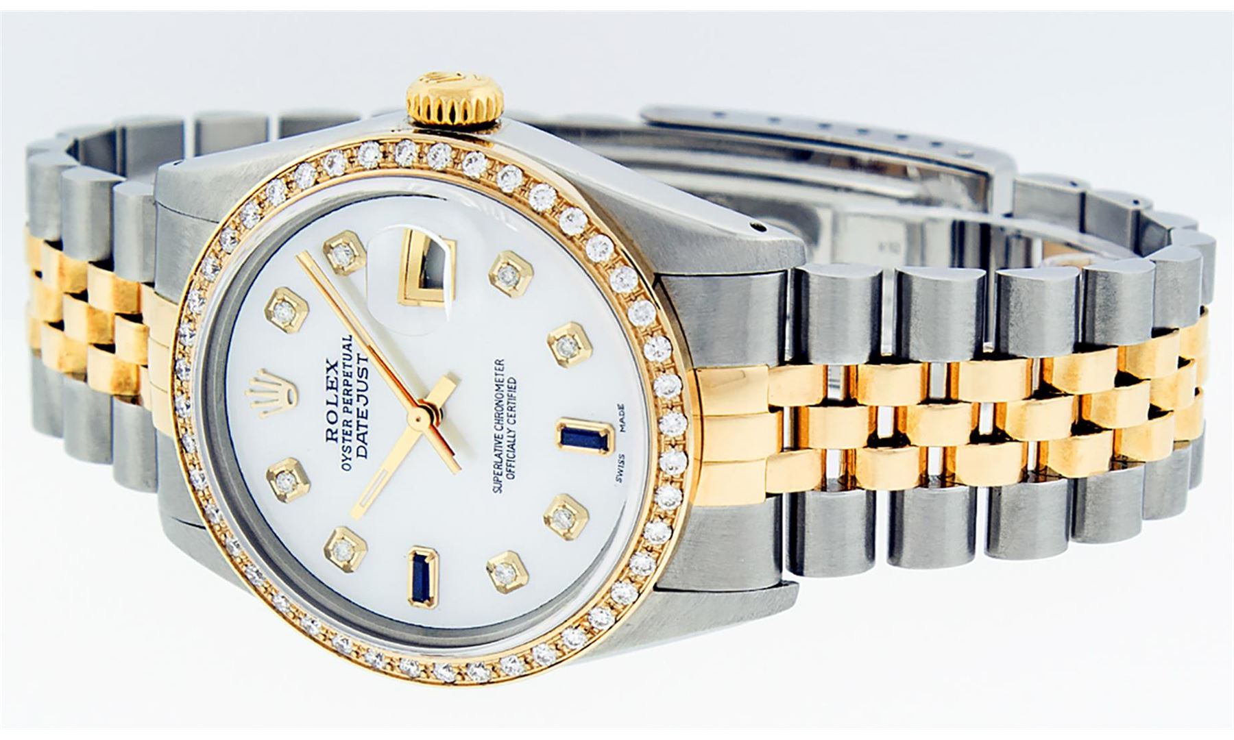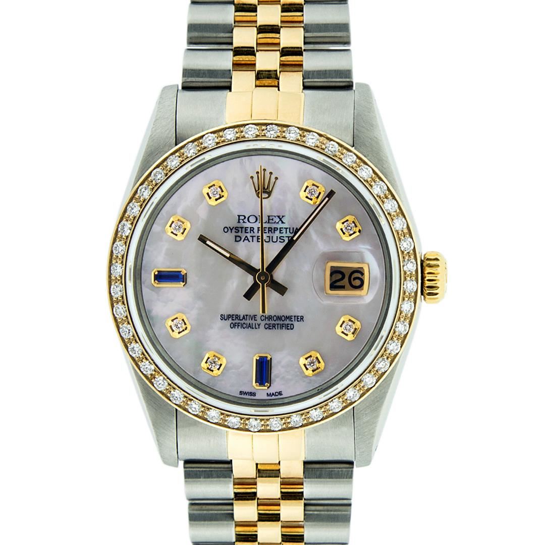 One Men's 14K Yellow Gold Two Tone Rolex Datejust Polished, Serviced & Electronically Tested, 14K Yellow Gold & Stainless Steel Case: 36mm, 14K Yellow Gold Crown, Custom Bezel: New 18K Yellow Gold Beadset Diamond Bezel, Diamond Count: 44 Diamonds, Total Weight 1.00 Carat, Clarity: SI-VS, Color: G to H. Custom Crystal: New Synthetic Sapphire Cyclops Lens. Movement: Automatic Winding Movement Caliber 3035. Custom Dial: Mother Of Pearl Dial Set With Diamond Hour Markers and Synthetic Sapphire Baguette Markers On 6 and 9, Diamond Count: 8 + 2 Synthetic Sapphire Baguettes, Color: G To H In Color, Clarity: SI-VS, Date Window: 3 O'clock Position Date Display, Quickset, Model: 16013 Condition: G-6 Extra Fine. Bracelet: Two Tone 14K Yellow Gold & Stainless Steel Jubilee. Bright Polish. 7.0 Inch Length, Adjustable. Standard Clasp, With Rolex Logo. This Watch Has Been Serviced Time Tested And Is In Excellent Condition It Is Free Of All Scratches And Dents.