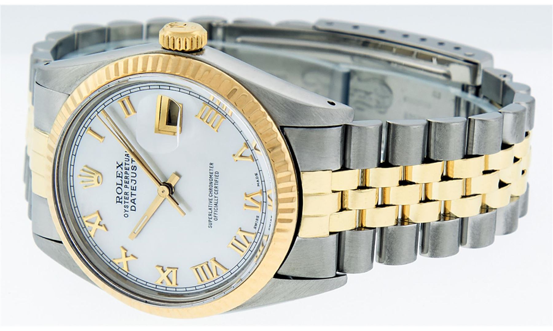 One Mens 14K Yellow Gold Two Tone Rolex Datejust Polished, Serviced & Electronically Tested, 14K Yellow Gold & Stainless Steel Case: 36mm,14K Yellow Gold Crown, Bezel: 14K Yellow Gold Fluted Bezel. Custom Crystal: New Acrylic Cyclops Lens. Custom Hands: New Luminecent Hands. Movement: Automatic Winding Movement Caliber 3035. Custom Dial: Mother Of Pearl Roman With Square Track. Date Window: 3 O'Clock Position Date Display, Quickset, Model: 16013 Datejust. Condition: G-6 Extra Fine. Bracelet:Two Tone 14K Yellow Gold & Stainless Steel Jubilee. Bright Polish. 7.0 Inch Length, Adjustable. Standard Clasp, With Rolex Logo. This Watch Has Been Serviced Time Tested And Is In Excellent Condition It Is Free Of All Scratches And Dents.