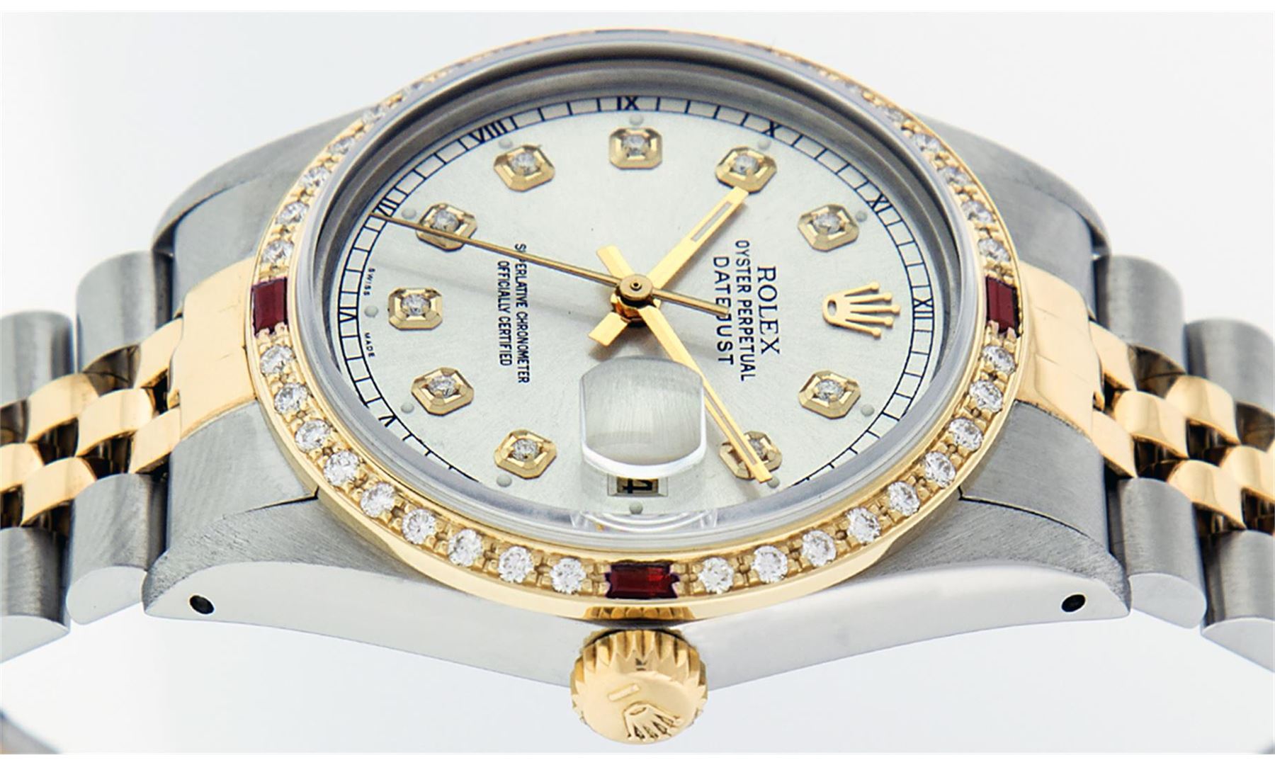 One Mens 14K Yellow Gold Two Tone Rolex Datejust Polished, Fully Serviced & Electronically Tested, 14K Yellow Gold & Stainless Steel Case: 36mm, 14K Yellow Gold Crown, Custom Bezel: 18K Yellow Gold Ruby Beadset Diamond Bezel, Diamond Count: 36 Diamonds + 4 Rubies, Total Weight 1.0 Carat, Clarity: Si-VS, Color: G to H. Custom Crystal: New Synthetic Sapphire Cyclops Lens. Custom Hands: New Luminecent Hands. Movement: Automatic Winding Movement Caliber 3035. Custom Dial: Silver Diamond Dial With Square Roman Track and Luminescent Dots , Diamond Count: 10 Diamonds In Dial, Color: G to H, Clarity: SI-VS. Date Window: 3 O'Clock Position Date Display, Quickset, Model: 16013 Datejust. Condition: G-6 Extra Fine. Bracelet: Two Tone 14K Yellow Gold & Stainless Steel Jubilee. Bright Polish. 7.0 Inch Length, Adjustable. Standard Clasp, With Rolex Logo. This Watch Has Been Serviced Time Tested And Is In Excellent Condition It Is Free Of All Scratches And Dents.