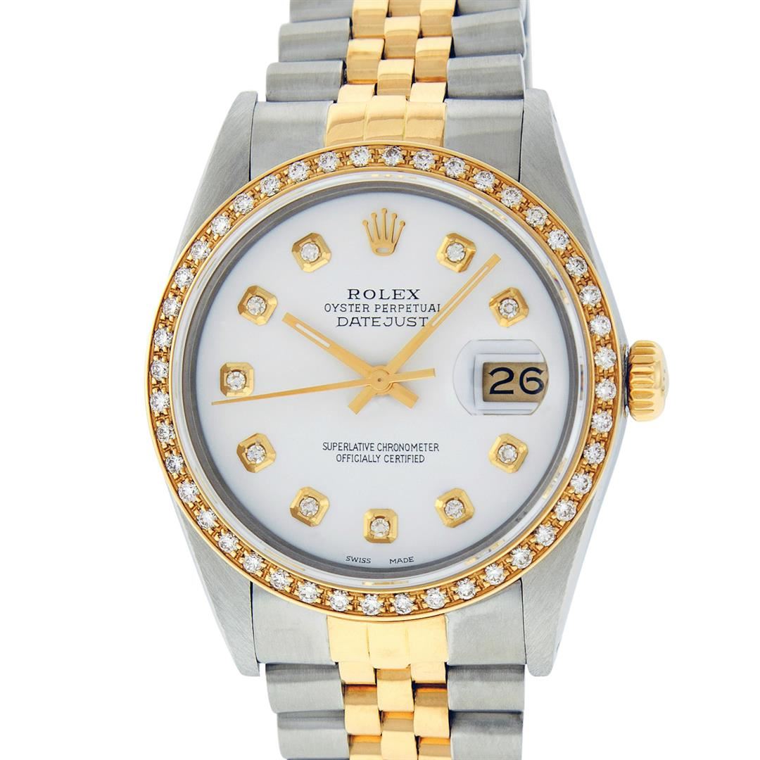 One Men's 14K Yellow Gold Two Tone Rolex Datejust Polished, Serviced & Electronically Tested, 14K Yellow Gold & Stainless Steel Case: 36mm, 14K Yellow Gold Crown, Custom Bezel: New 18K Yellow Gold Beadset Diamond Bezel, Diamond Count: 44 Diamonds, Total Weight 1.00 Carat, Clarity: SI-VS, Color: G to H. Custom Crystal: New Synthetic Sapphire Cyclops Lens. Movement: Automatic Winding Movement Caliber 3035. Custom Dial: White Diamond Dial, Diamond Count: 10 Diamonds In Dial, Color: G To H In Color, Clarity: SI-VS, Date Window: 3 O'clock Position Date Display, Quickset, Model: 16013 Datejust, Condition: G-6 Extra Fine. Bracelet: Two Tone 14K Yellow Gold & Stainless Steel Jubilee. Bright Polish. 7.0 Inch Length, Adjustable. Standard Clasp, With Rolex Logo. This Watch Has Been Serviced Time Tested And Is In Excellent Condition It Is Free Of All Scratches And Dents.