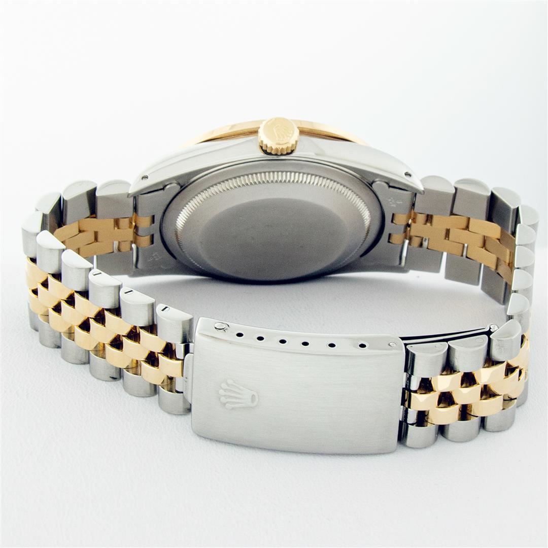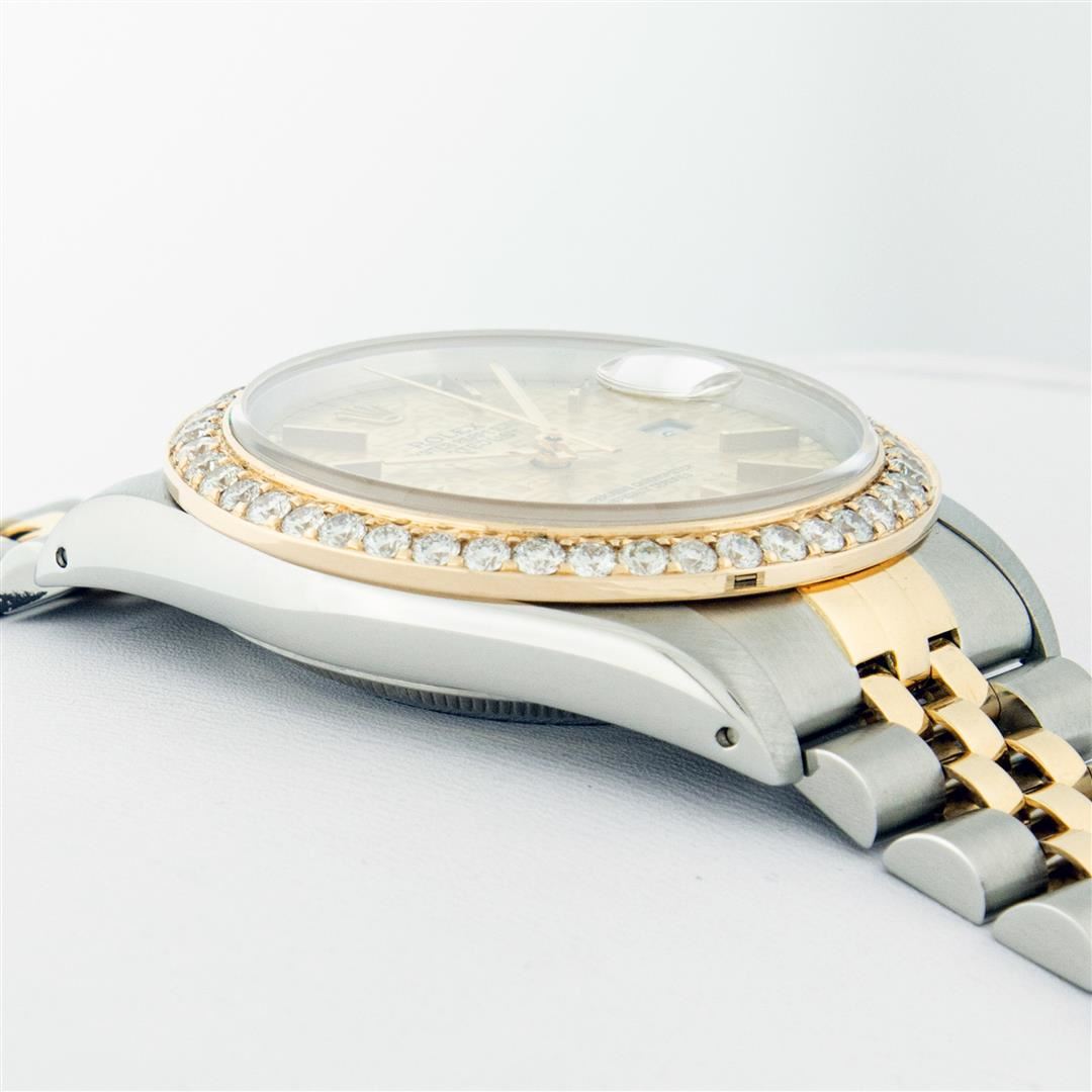 One Men's Pre Owned Yellow Gold Two Tone Rolex Datejust Polished, Serviced & Electronically Tested, Rolex Yellow Gold & Stainless Steel Case: 36mm,Rolex Yellow Gold Crown, Custom Bezel: New 18K Yellow Gold Beadset Diamond Bezel, Diamond Count: 40 Diamonds On Bezel, Total Bezel Weight 2.5 Carat, Clarity: SI-VS, Color: G to H. Custom Crystal: New Scratch Resistant Synthetic Sapphire Cyclops Lens. Custom Hands: New Luminescent Hands. Rolex Movement: Automatic Winding Movement. Rolex Dial: Champagne Jubilee Dial With Index Hour Markers and Small Track With Lumi Dots. Date Window: 3 O'Clock Position Date Display, Quickset, Model: Datejust. Condition: G-6 Extra Fine. Rolex Bracelet: Two Tone Yellow Gold & Stainless Steel Jubilee Band. Bright Polish. 7.0 Inch Length, Adjustable. Standard Clasp, With Rolex Logo. This Watch Has Been Serviced Time Tested And Is In Excellent Condition It Is Free Of All Scratches And Dents.