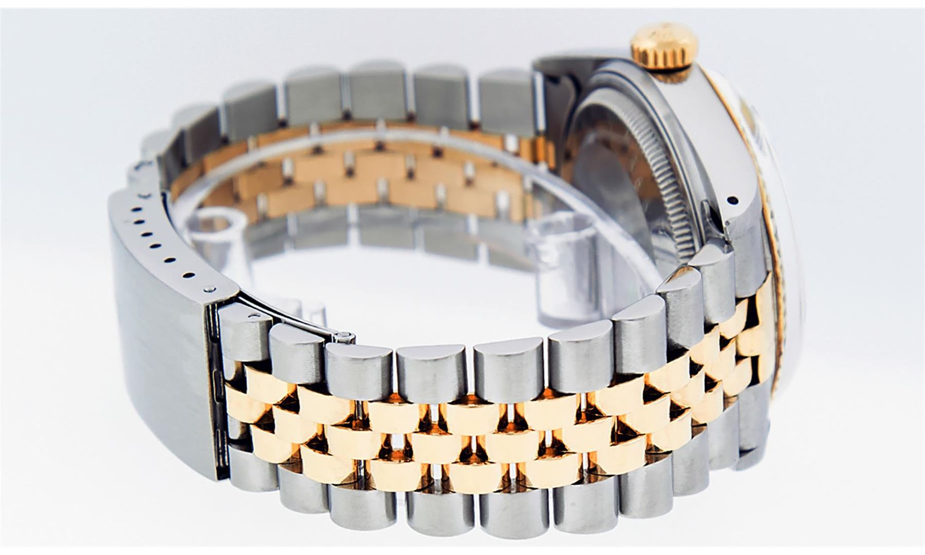 One Men's Yellow Gold Two Tone Rolex Datejust Polished, Serviced & Electronically Tested, Yellow Gold & Stainless Steel Case: 36mm, Yellow Gold Crown, Bezel: 18K Yellow Gold Fluted Bezel. Custom Crystal: New Acrylic Cyclops Lens. Custom Hands: New Luminescent Hands. Movement: Automatic Winding Movement.. Custom Dial: Black Dial Set With Diamond Hour Markers And Square Roman Track, Diamond Count: 10 Diamonds in Dial G To H In Color, Si-VS Clarity. Date Window: 3 O'clock Position Date Display, Quickset, Model: 16013 Condition: G-6 Extra Fine. Bracelet: Two Tone Yellow Gold & Stainless Steel Jubilee. Bright Polish. 7.0 Inch Length, Adjustable. Standard Clasp, With Rolex Logo. This Watch Has Been Serviced And Polished It Is Free Of All Scratches And Dents.