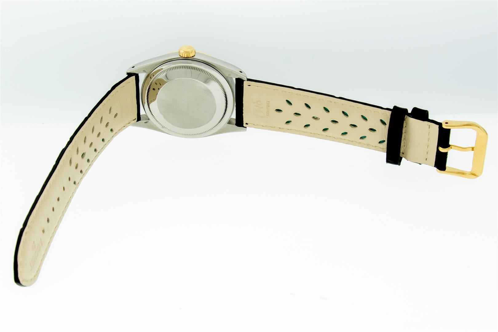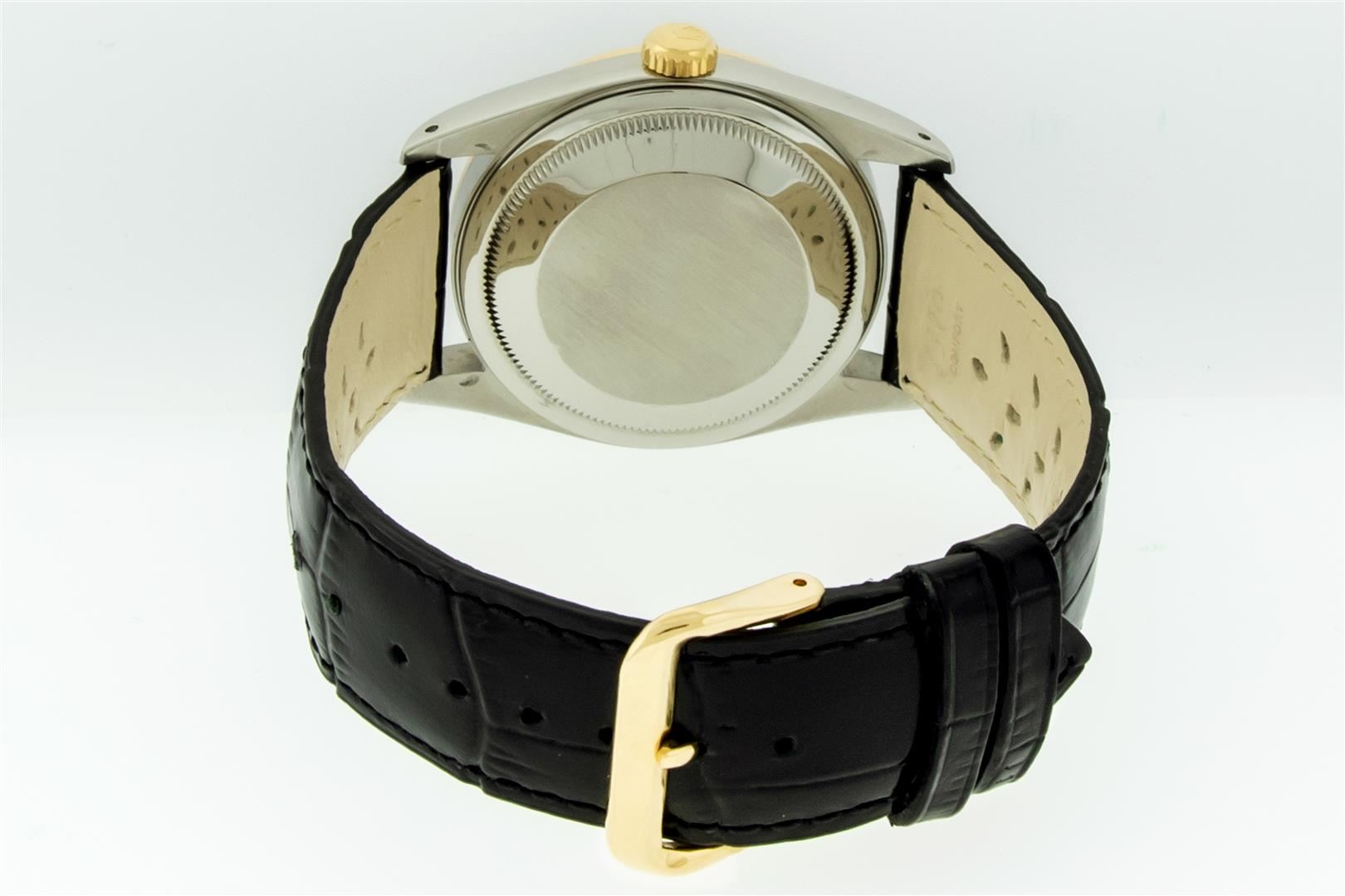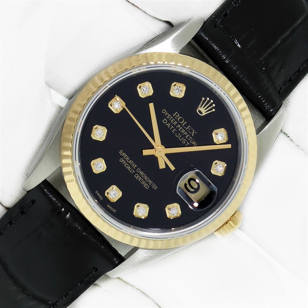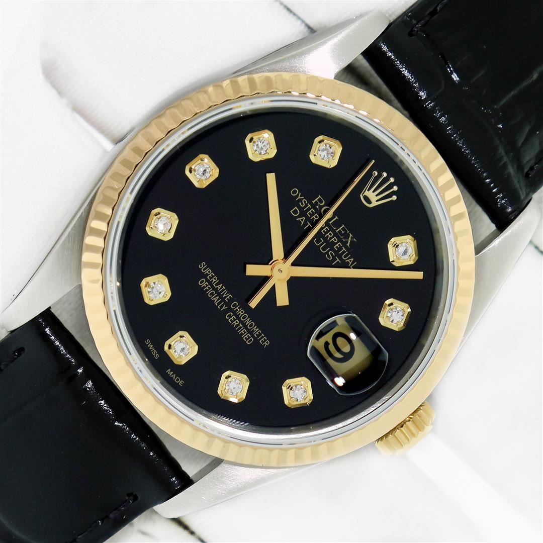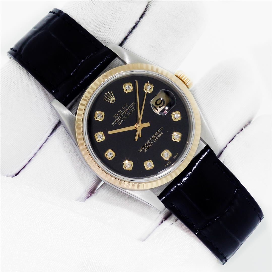 One Men's Yellow Gold Two Tone Rolex Datejust Polished, Serviced & Electronically Tested, Rolex Yellow Gold & Stainless Steel Case: 36mm, Rolex Yellow Gold Crown, Rolex Bezel: 18K Yellow Gold Fluted Bezel. Custom Crystal: New Acrylic With Magnified Date Window. Custom Hands: New Gold Hands. Rolex Movement: Automatic Winding Movement. Custom Dial: Refinished To Black Dial With Added Diamond Hour Markers, Diamond Count: 10 Diamonds in Dial G To H In Color, SI-VS Clarity. Date Window: 3 O'clock Position Date Display, Quickset, Model: Datejust. Condition: G-6 Extra Fine. Custom Band: New Black Leather Band 7.0 Inch Length with New Custom Pin Buckle Clasp. This Watch Has Been Serviced And Polished It Is Free Of All Scratches And Dents.