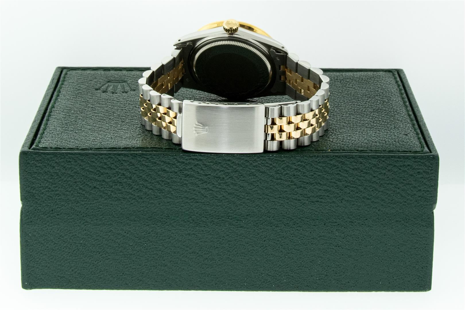 One Men's Yellow Gold Rolex Datejust Polished Bright with Satin Finish, Serviced & Electronically Tested, Stainless Steel Case: 36mm, Rolex Yellow Gold Crown, Custom Bezel: New 18K Yellow Gold Pyramid Diamond Bezel, Diamond Count: 24 Diamonds, Total Weight .75 Carat, Clarity: SI-VS, Color: G to H. Custom Crystal: New Sapphire With Magnified Date Window. Custom Hands: New Luminescent Hands. Rolex Movement: Automatic Winding Movement. Custom Dial: Refinished To Black With Diamond Dial, Diamond Count: 10 Diamonds In Dial, Color: G to H, Clarity: VS. Date Window: 3 O'clock Position Date Display, Quickset, Model: Datejust. Condition: G-6 Extra Fine. Rolex Bracelet: Yellow Gold And Stainless Steel Jubilee Band. Bright Polish & Satin Finish. 7.0 Inch Length, Adjustable. Standard Clasp, With Rolex Logo. This Pre Owned Watch Has Been Serviced And Polished It Is Free Of All Scratches And Dents. This Watch Comes With A Rolex Box