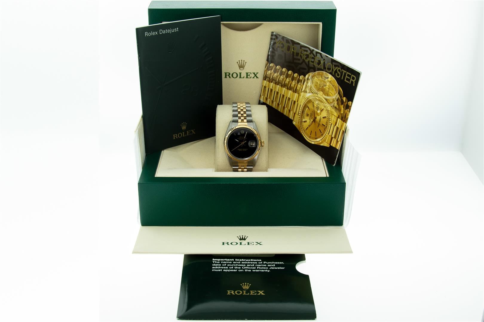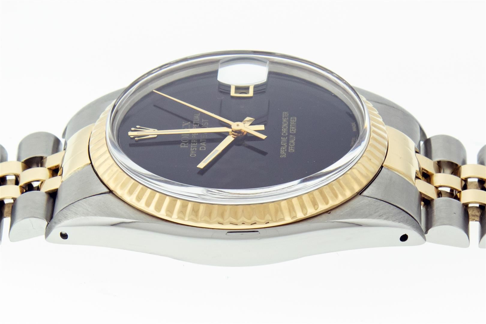 One Men's Pre Owned Yellow Gold Two Tone Rolex Datejust Polished, Serviced & Electronically Tested, Rolex Yellow Gold & Stainless Steel Case: 36mm, Rolex Yellow Gold Crown, Original Rolex Bezel: Yellow Gold Fluted Bezel. Custom Crystal: New Acrylic Crystal With Cyclops Lens. Custom Hands: New Luminescent Hands. Rolex Movement: Automatic Winding Movement. Custom Dial: Refinished To Black Onyx. Date Window: 3 O'Clock Position Date Display, Quickset, Model: Datejust. Condition: G-6 Extra Fine. Rolex Band: Yellow Gold And Stainless Steel Rolex Jubilee Band, 7.0 Inch Length. This Watch Has Been Serviced Time Tested And Is In Excellent Condition It Is Free Of All Scratches And Dents. This Watch Comes With A Rolex Box And Booklets.
