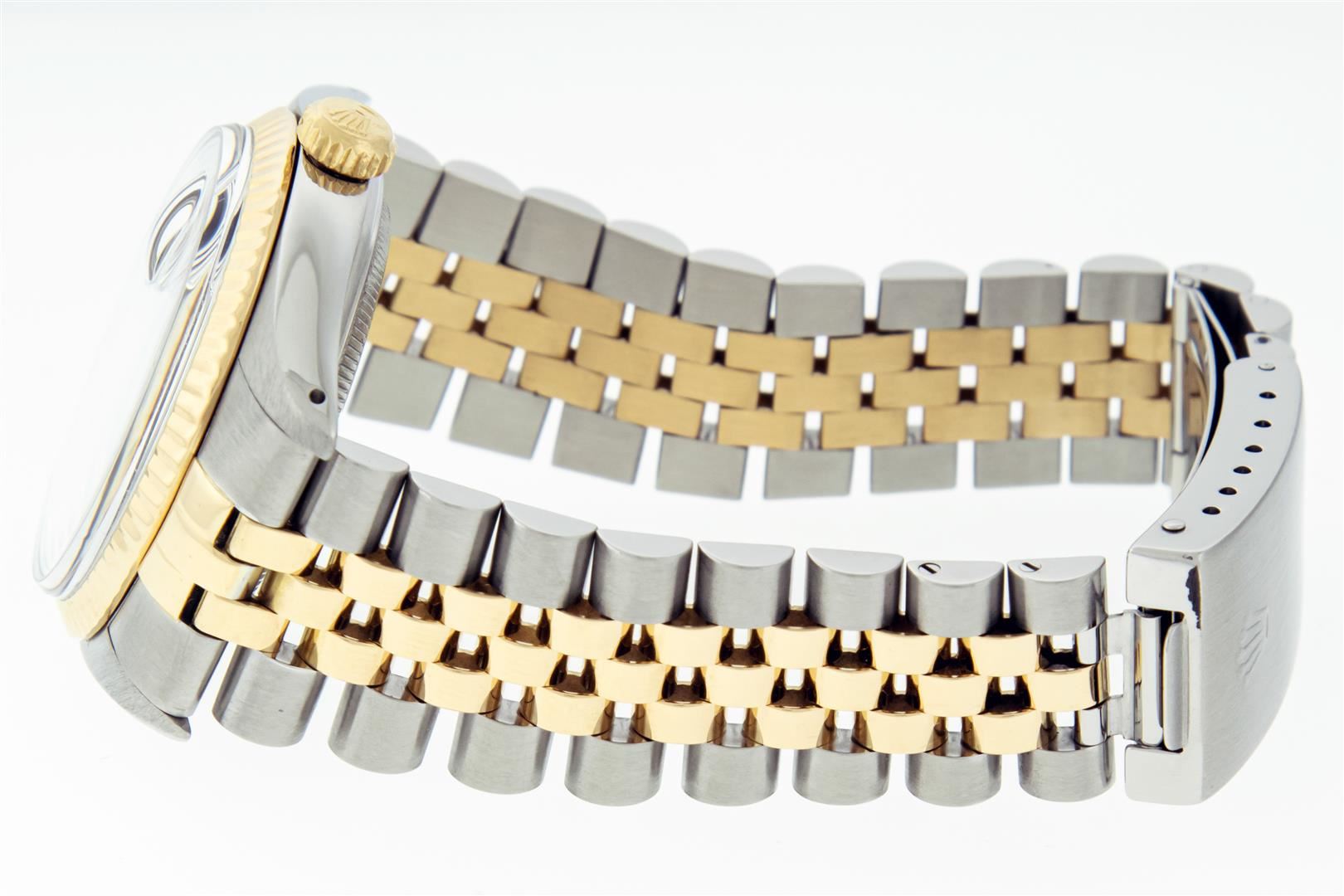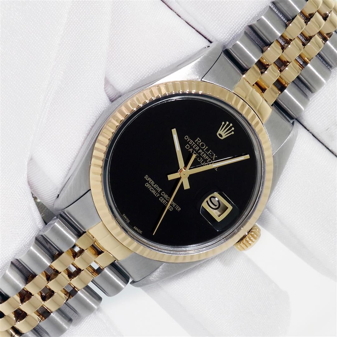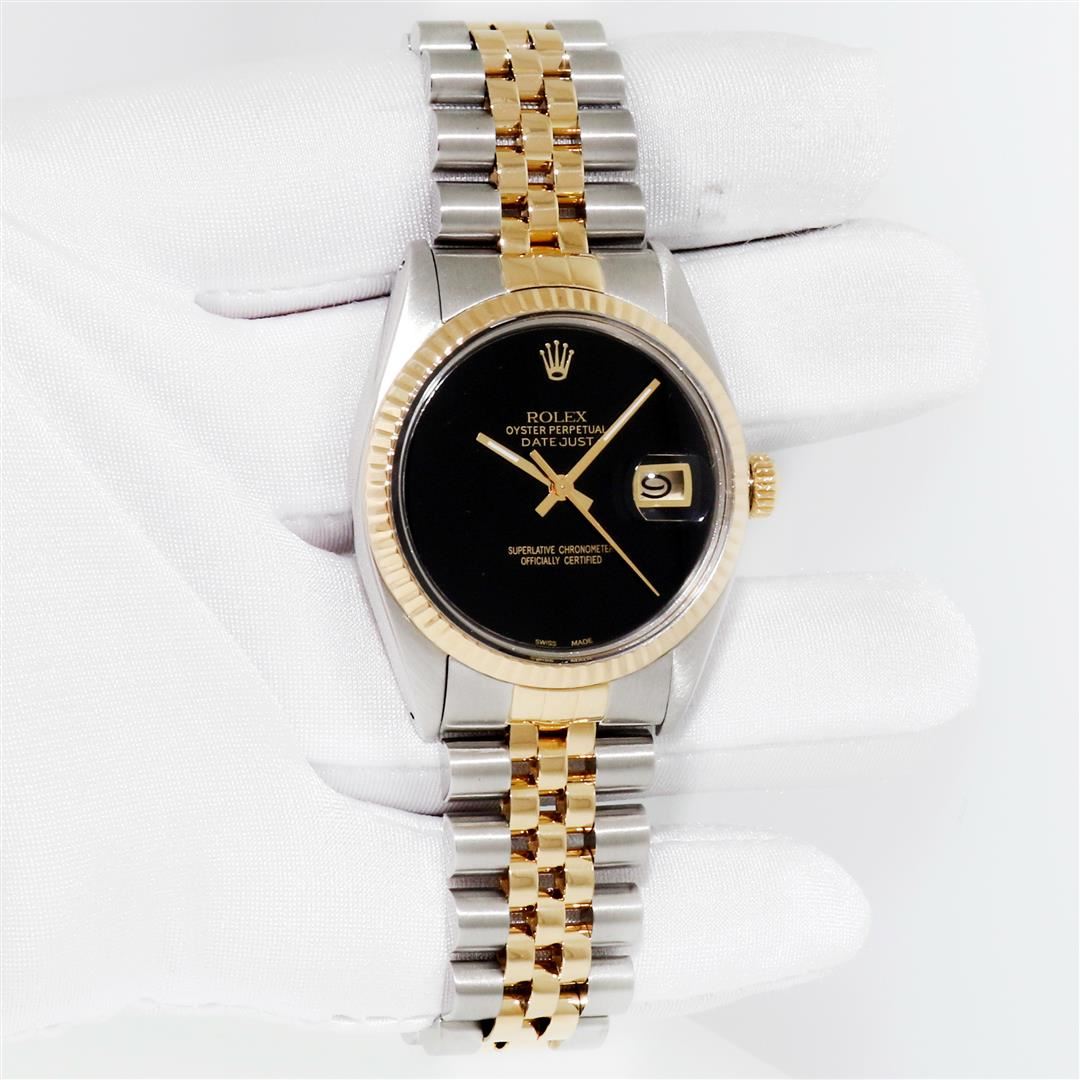 One Men's Pre Owned Yellow Gold Two Tone Rolex Datejust Polished, Serviced & Electronically Tested, Rolex Yellow Gold & Stainless Steel Case: 36mm, Rolex Yellow Gold Crown, Original Rolex Bezel: Yellow Gold Fluted Bezel. Custom Crystal: New Acrylic Crystal With Cyclops Lens. Custom Hands: New Luminescent Hands. Rolex Movement: Automatic Winding Movement. Custom Dial: Refinished To Black Onyx. Date Window: 3 O'Clock Position Date Display, Quickset, Model: Datejust. Condition: G-6 Extra Fine. Rolex Band: Yellow Gold And Stainless Steel Rolex Jubilee Band, 7.0 Inch Length. This Watch Has Been Serviced Time Tested And Is In Excellent Condition It Is Free Of All Scratches And Dents. This Watch Comes With A Rolex Box And Booklets.