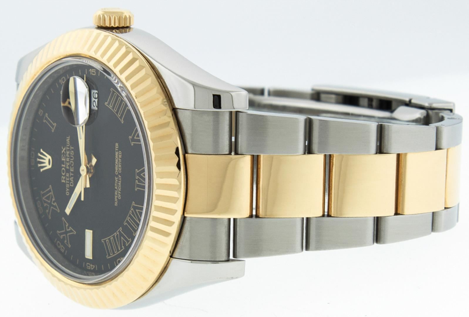 One Men's Rolex Datejust 2 41MM Polished, Serviced & Electronically Tested, Stainless Steel Case: 41mm, Rolex Yellow Gold Crown, Rolex Bezel: 18K Yellow Gold Fluted Bezel, Rolex Crystal: Sapphire With Magnified Date Window. Hands: Luminescent Hands. Rolex Movement: Automatic Winding Movement 3136. Rolex Dial: Black Roman With Dash Track, Date Window: 3 O'Clock Position Date Display, Quickset, Model: Datejust 2 116333. Condition: G-6 Extra Fine, Rolex Bracelet: 18K Yellow Gold And Stainless Oyster Band. Bright Polish & Satin Finish. 7.0 Inch Length, Adjustable. Standard Clasp, With Rolex Logo. This Watch Has Been Serviced Time Tested And Is In Excellent Condition It Is Free Of All Scratches And Dents.