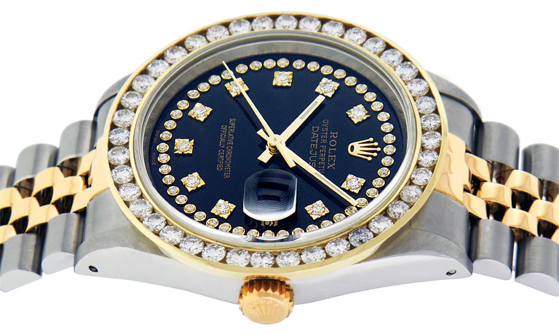One Men's Yellow Gold Rolex Datejust Polished Bright with Satin Finish, Serviced & Electronically Tested, Stainless Steel Case: 36mm, Yellow Gold Crown, Custom Bezel: New 18K Yellow Gold 3ct Channel Set Diamond Bezel, Diamond Count: 40 Diamonds, Total Weight 3.00 Carat, Clarity: SI-VS, Color: G to H. Custom Crystal: New Scratch Resistant Synthetic Sapphire Cyclops Lens. Custom Hands: New Luminescent Hands. Movement: Automatic Winding Movement. Custom Dial: Black String Diamond Dial, Diamond Count: 58 Diamonds In Dial, Color: G to H, Clarity: VS. Date Window: 3 O'clock Position Date Display, Quickset, Model: Datejust. Condition: G-6 Extra Fine. Bracelet: Yellow Gold And Stainless Steel Jubilee Band. Bright Polish & Satin Finish. 7.0 Inch Length, Adjustable. Standard Clasp, With Rolex Logo. This Watch Has Been Serviced And Polished It Is Free Of All Scratches And Dents.