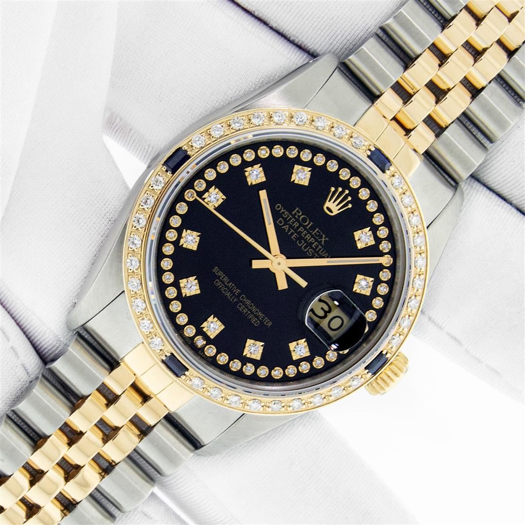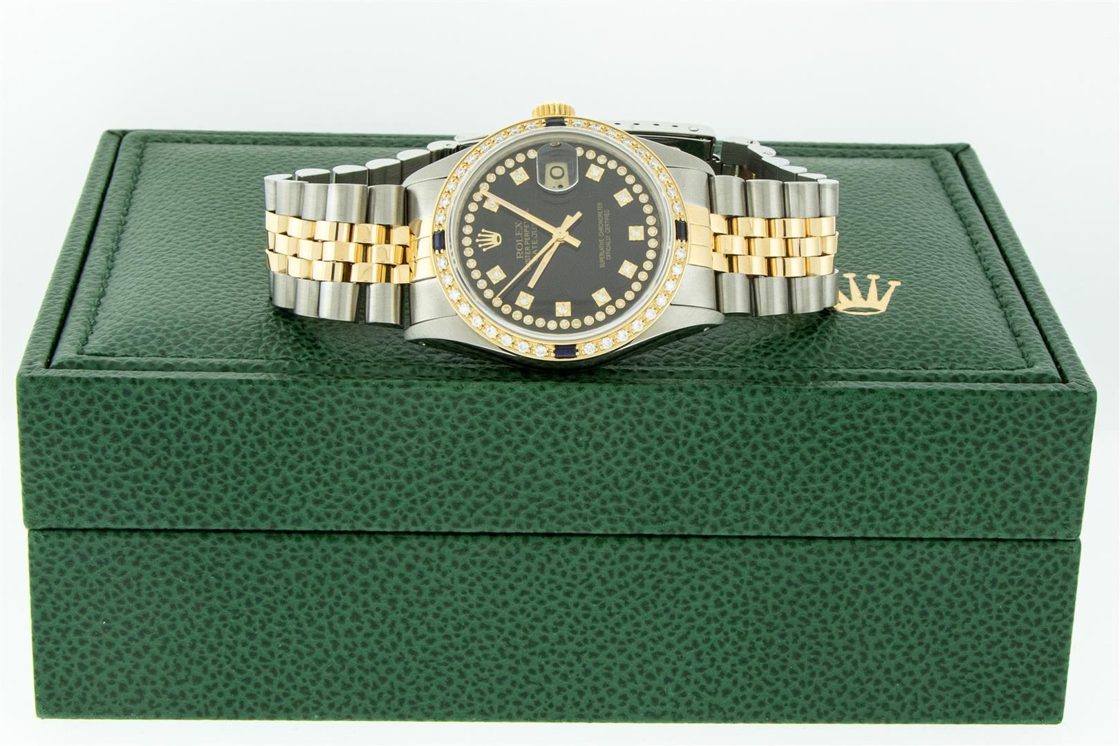 One Men's Yellow Gold Two Tone Rolex Datejust Polished, Serviced & Electronically Tested, Yellow Gold & Stainless Steel Case: 36mm, Rolex Yellow Gold Crown, Custom Bezel: New 18K Yellow Gold Sapphire Beadset Diamond Bezel, Diamond Count: 36 Diamonds + 4 Sapphires, Total Weight 1.0 Carat, Clarity: SI-VS, Color: G to H. Custom Crystal: New Sapphire With Magnified Date Window. Custom Hands: New Luminescent Hands. Rolex Movement: Automatic Winding Movement. Custom Dial: Refinished To Black With Added Diamonds, Diamond Count: 58 Diamonds In Dial, Color: G to H, Clarity: SI-VS Date Window: 3 O'clock Position Date Display, Quickset, Model: Datejust, Condition: G-6 Extra Fine. Rolex Bracelet: Two Tone Yellow Gold & Stainless Steel Jubilee Band. Bright Polish. 7.0 Inch Length, Adjustable. Standard Clasp, With Rolex Logo. This Pre Owned Watch Has Been Serviced Time Tested And Is In Excellent Condition It Is Free Of All Scratches And Dents. This Watch Comes With A Rolex Box.