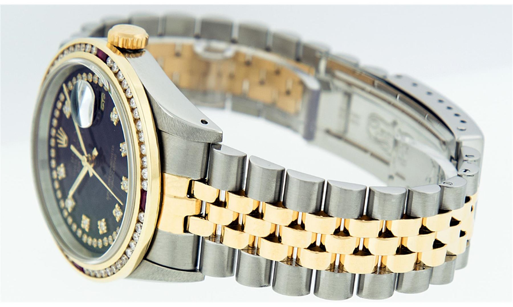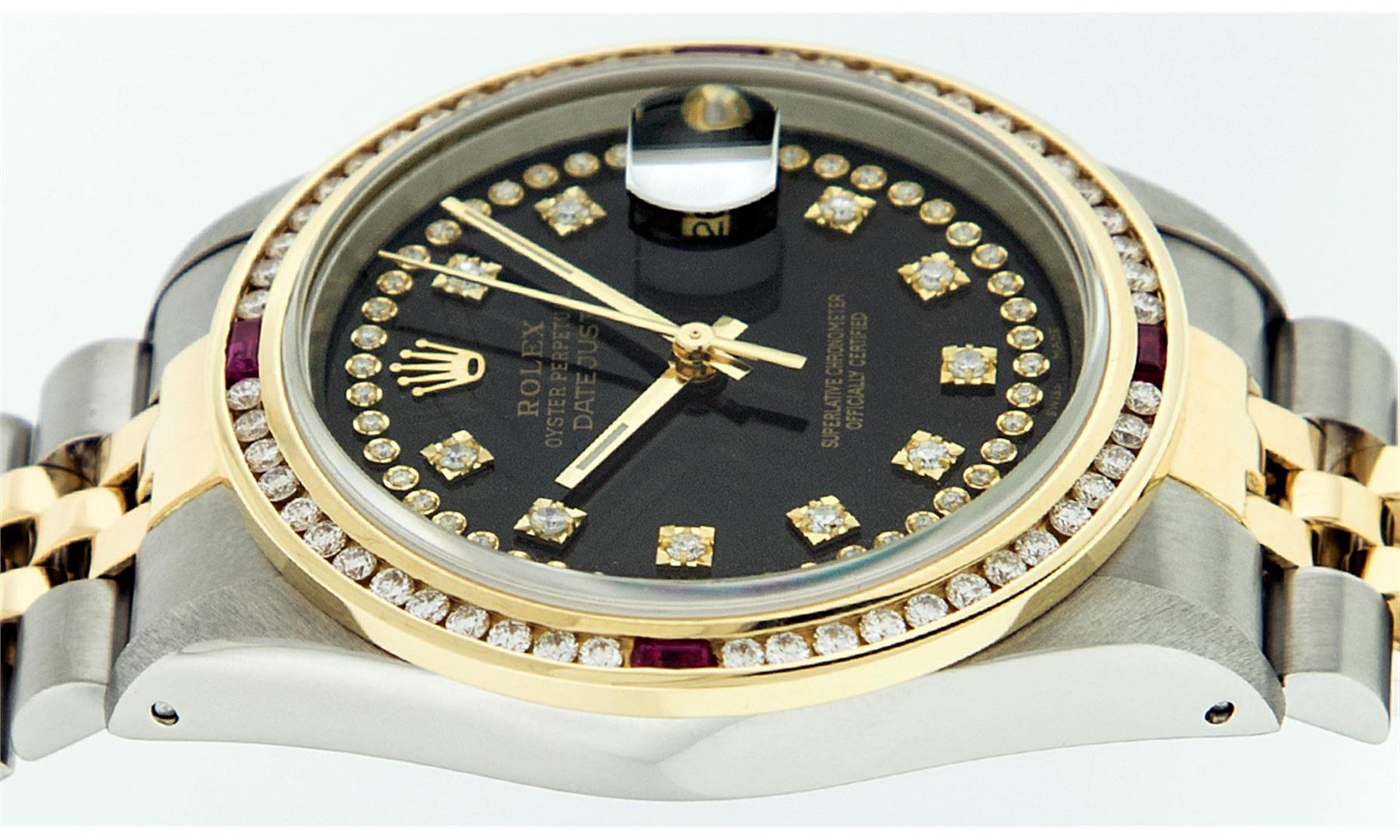 One Men's Two Tone Rolex Datejust Polished, Serviced & Electronically Tested, 14K Yellow Gold & Stainless Steel Case:36mm, 14K Yellow Gold Crown, Custom Bezel: 18K Yellow Gold Ruby Channel Set Diamond Bezel, Diamond Count: 52 Diamonds + 4 Ruby, Total Weight 1.30 Carat, Clarity: SI-VS, Color: G to H. Custom Crystal: Synthetic Sapphire Cyclops Lens. Movement: Automatic Winding Movement Caliber 3035. Custom Dial: Black String Diamond Dial VVS , Diamond Count: 58 Diamonds in Dial G To H In Color, VVS Clarity. Date Window: 3 O'clock Position Date Display, Quickset, Model: 16013 Condition: G-6 Extra Fine. Bracelet: Two Tone 14K Yellow Gold & Stainless Steel Jubilee. Bright Polish. 7.0 Inch Length, Adjustable. Standard Clasp, With Rolex Logo.