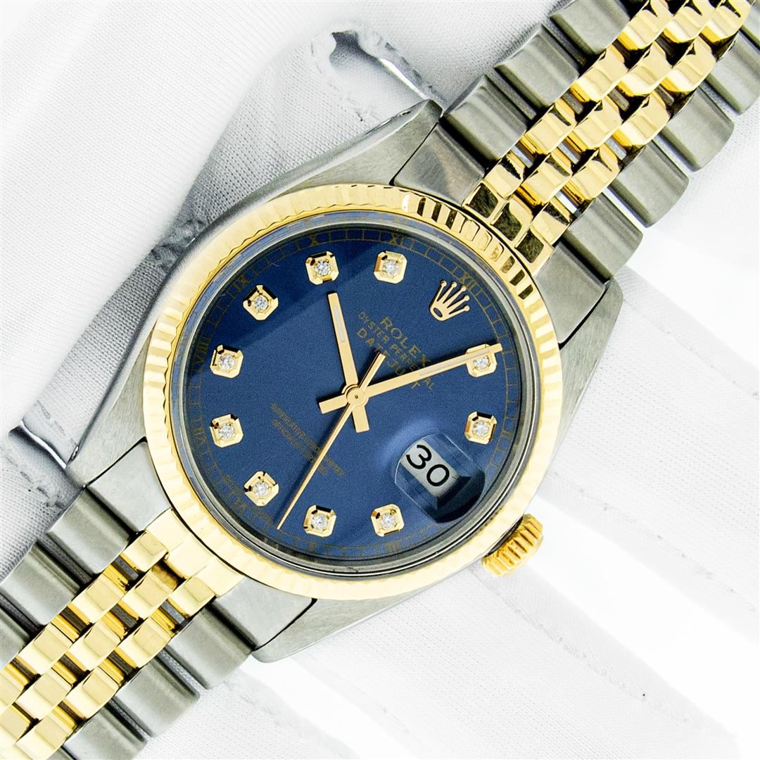 One Men's Yellow Gold Two Tone Rolex Datejust Polished, Serviced & Electronically Tested, Rolex Yellow Gold & Stainless Steel Case: 36mm, Rolex Yellow Gold Crown, Rolex Bezel: Yellow Gold Fluted Bezel. Custom Crystal: New Acrylic With Magnified Date Window. Custom Hands: New Luminescent Hands. Rolex Movement: Automatic Winding Movement. Custom Dial: Dial Refinished To Blue With Custom Added Genuine Diamond Hour Markers And Square Roman Track, Diamond Count: 10 Diamonds in Dial, G To H In Color, SI-VS Clarity. Date Window: 3 O'clock Position Date Display, Quickset, Model: Datejust, Condition: G-6 Extra Fine. Rolex Bracelet: Two Tone Yellow Gold & Stainless Steel Jubilee Band. Bright Polish. 7.0 Inch Length, Adjustable. Standard Clasp, With Rolex Logo. This Watch Has Been Serviced And Polished It Is Free Of All Scratches And Dents. This Pre Owned Watch Comes With A Rolex Box.
