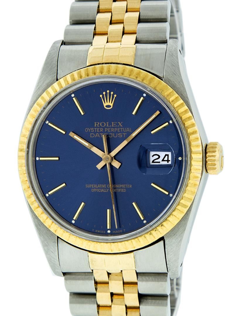 One Men's Rolex Pre Owned Two Tone 14K Yellow Gold And Stainless Steel Datejust Polished, Serviced & Electronically Tested, Rolex Yellow Gold & Stainless Steel Case: 36mm, Rolex Yellow Gold Crown, Rolex Bezel: 14K Yellow Gold Fluted Bezel. Custom Crystal: New Acrylic With Magnified Date Window. Rolex Hands: Luminescent Hands. Rolex Movement: Automatic Winding Movement 3035. Rolex Dial: Blue Index Dial With Index Track. Date Window: 3 O'Clock Position Date Display, Quickset, Model: Datejust. Condition: G-6 Extra Fine. Rolex Bracelet: Two Tone 14K Yellow Gold & Stainless Steel Jubilee Band. Bright Polish. 7.0 Inch Length, Adjustable. Standard Clasp, With Rolex Logo. This Watch Has Been Serviced Time Tested And Is In Excellent Condition It Is Free Of All Scratches And Dents.