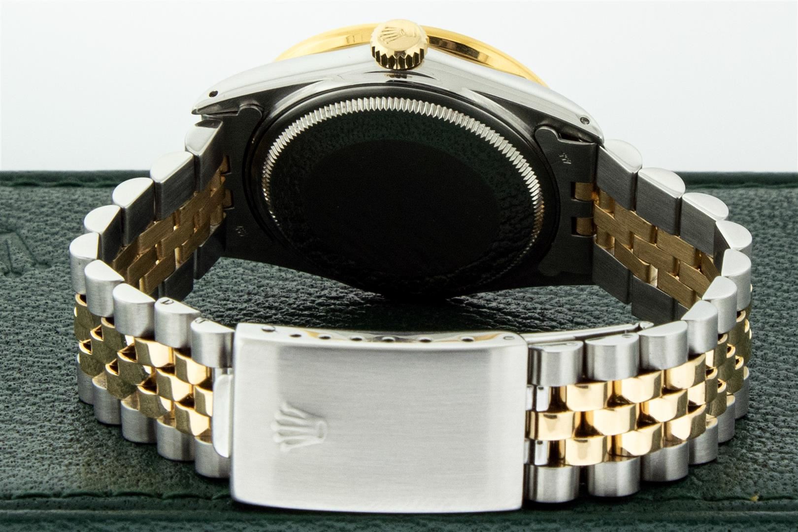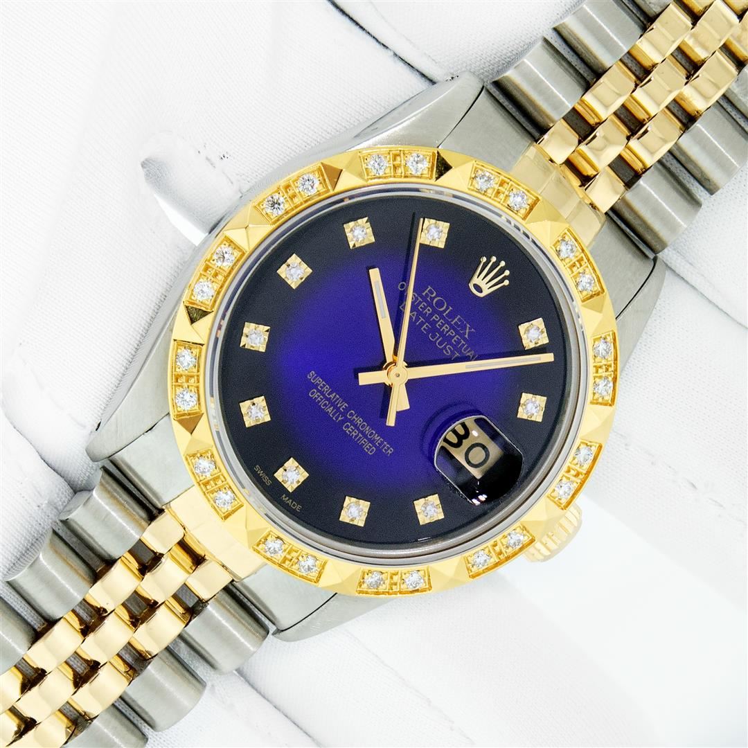One Men's Yellow Gold Rolex Datejust Polished Bright with Satin Finish, Serviced & Electronically Tested, Stainless Steel Case: 36mm, Rolex Yellow Gold Crown, Custom Bezel: New 18K Yellow Gold Pyramid Diamond Bezel, Diamond Count: 24 Diamonds In Bezel, Total Weight 0.75 Carat, Clarity: SI-VS, Color: G to H. Custom Crystal: New Sapphire With Magnified Date Window. Custom Hands: New Luminescent Hands. Rolex Movement: Automatic Winding Movement. Custom Dial: Refinished To Blue Vignette With Added Diamond Diamonds, Diamond Count: 10 Diamonds In Dial, Color: G to H, Clarity: VS. Date Window: 3 O'clock Position Date Display, Quickset, Model: Datejust. Condition: G-6 Extra Fine. Rolex Bracelet: Yellow Gold And Stainless Steel Jubilee Band. Bright Polish & Satin Finish. 7.0 Inch Length, Adjustable. Standard Clasp, With Rolex Logo. This Pre Watch Has Been Serviced And Polished It Is Free Of All Scratches And Dents. This Watch Comes With A Rolex Box.