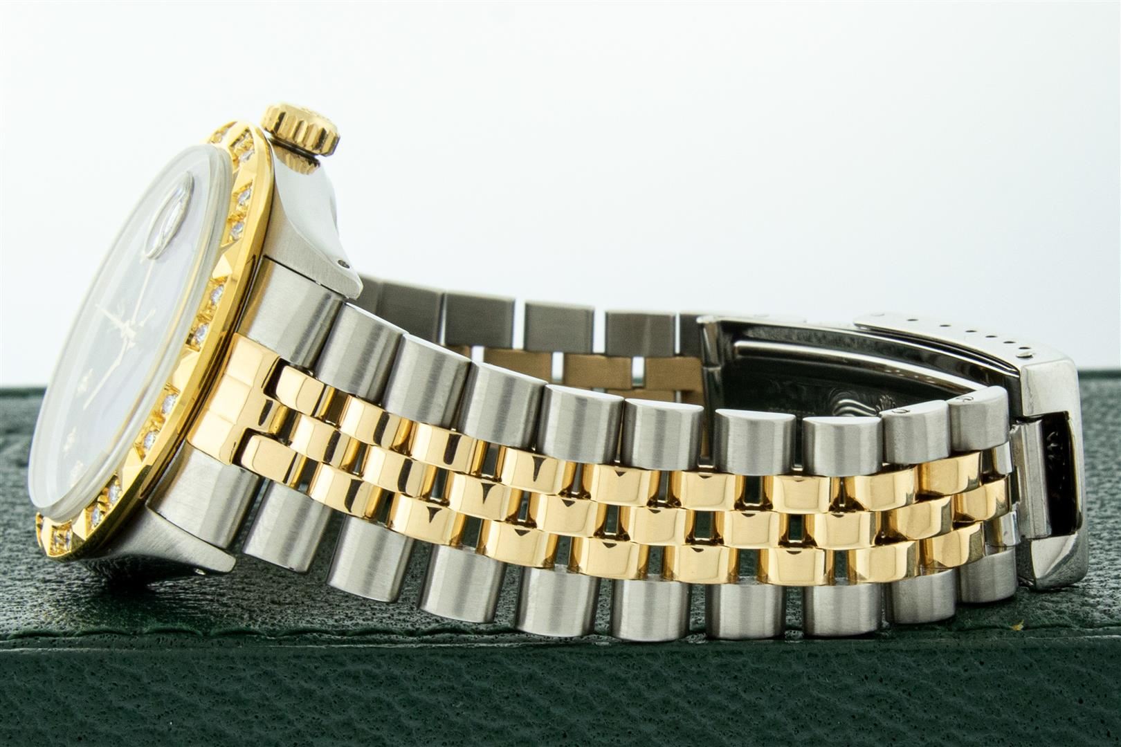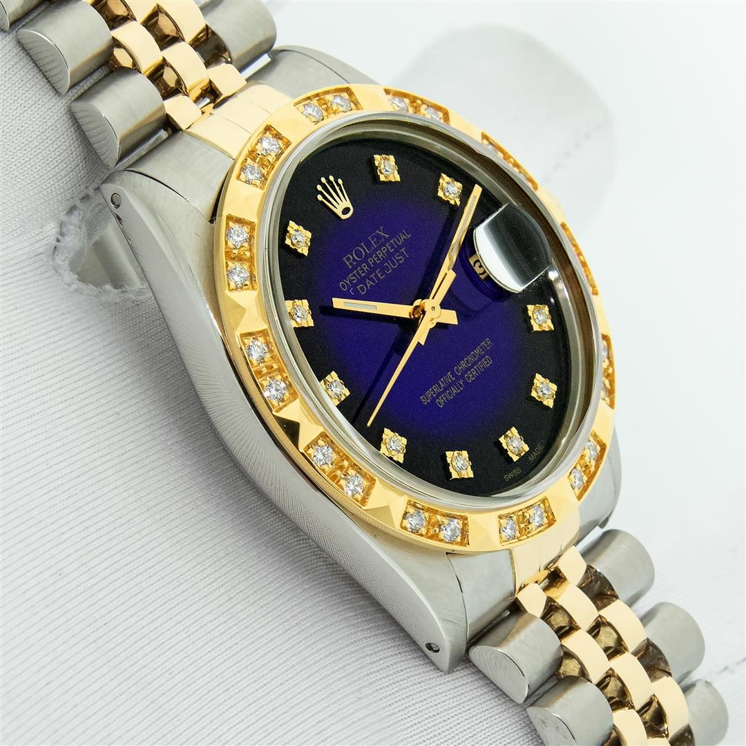 One Men's Yellow Gold Rolex Datejust Polished Bright with Satin Finish, Serviced & Electronically Tested, Stainless Steel Case: 36mm, Rolex Yellow Gold Crown, Custom Bezel: New 18K Yellow Gold Pyramid Diamond Bezel, Diamond Count: 24 Diamonds In Bezel, Total Weight 0.75 Carat, Clarity: SI-VS, Color: G to H. Custom Crystal: New Sapphire With Magnified Date Window. Custom Hands: New Luminescent Hands. Rolex Movement: Automatic Winding Movement. Custom Dial: Refinished To Blue Vignette With Added Diamond Diamonds, Diamond Count: 10 Diamonds In Dial, Color: G to H, Clarity: VS. Date Window: 3 O'clock Position Date Display, Quickset, Model: Datejust. Condition: G-6 Extra Fine. Rolex Bracelet: Yellow Gold And Stainless Steel Jubilee Band. Bright Polish & Satin Finish. 7.0 Inch Length, Adjustable. Standard Clasp, With Rolex Logo. This Pre Watch Has Been Serviced And Polished It Is Free Of All Scratches And Dents. This Watch Comes With A Rolex Box.