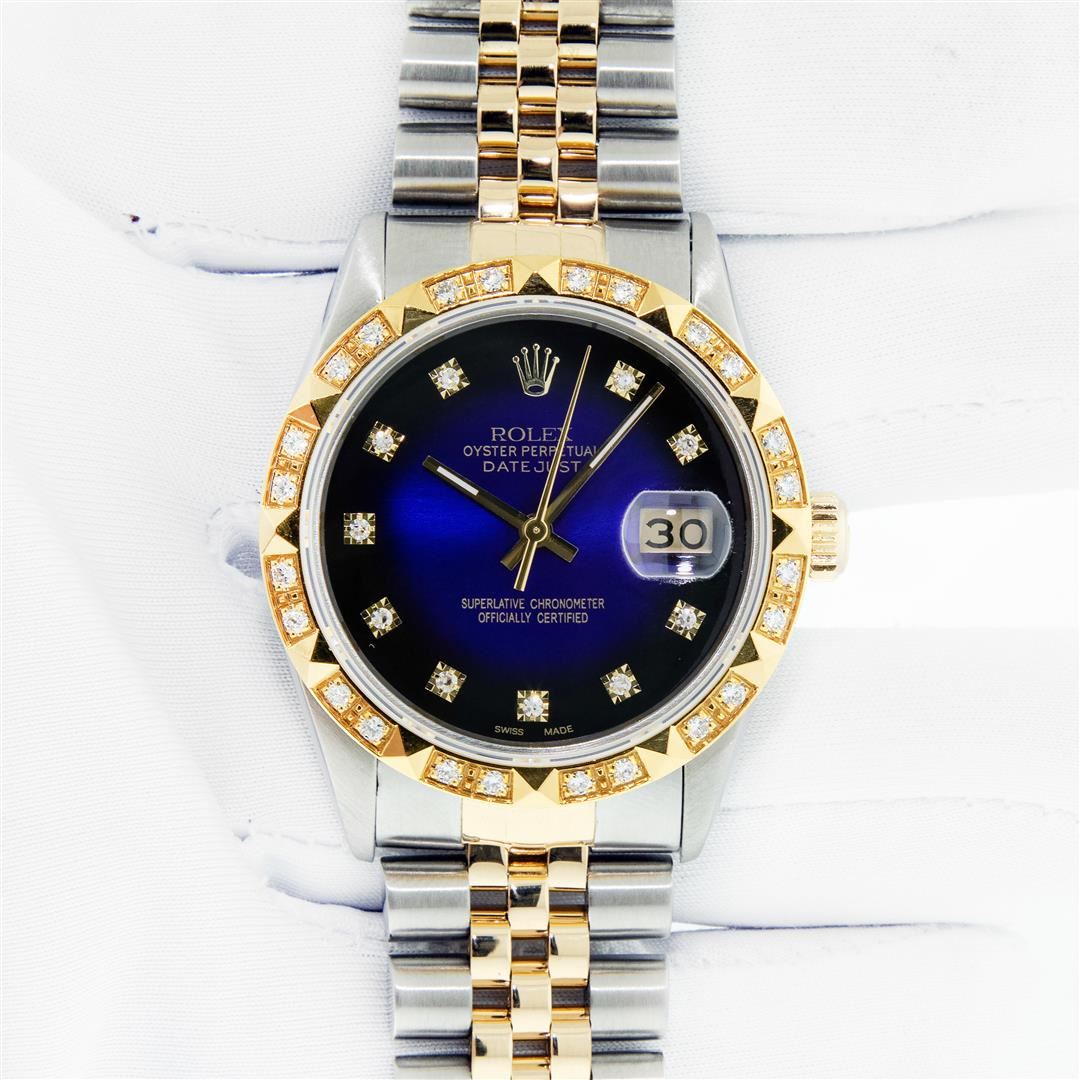 One Men's Yellow Gold Rolex Datejust Polished Bright with Satin Finish, Serviced & Electronically Tested, Stainless Steel Case: 36mm, Rolex Yellow Gold Crown, Custom Bezel: New 18K Yellow Gold Pyramid Diamond Bezel, Diamond Count: 24 Diamonds In Bezel, Total Weight 0.75 Carat, Clarity: SI-VS, Color: G to H. Custom Crystal: New Sapphire With Magnified Date Window. Custom Hands: New Luminescent Hands. Rolex Movement: Automatic Winding Movement. Custom Dial: Refinished To Blue Vignette With Added Diamond Diamonds, Diamond Count: 10 Diamonds In Dial, Color: G to H, Clarity: VS. Date Window: 3 O'clock Position Date Display, Quickset, Model: Datejust. Condition: G-6 Extra Fine. Rolex Bracelet: Yellow Gold And Stainless Steel Jubilee Band. Bright Polish & Satin Finish. 7.0 Inch Length, Adjustable. Standard Clasp, With Rolex Logo. This Pre Watch Has Been Serviced And Polished It Is Free Of All Scratches And Dents. This Watch Comes With A Rolex Box.