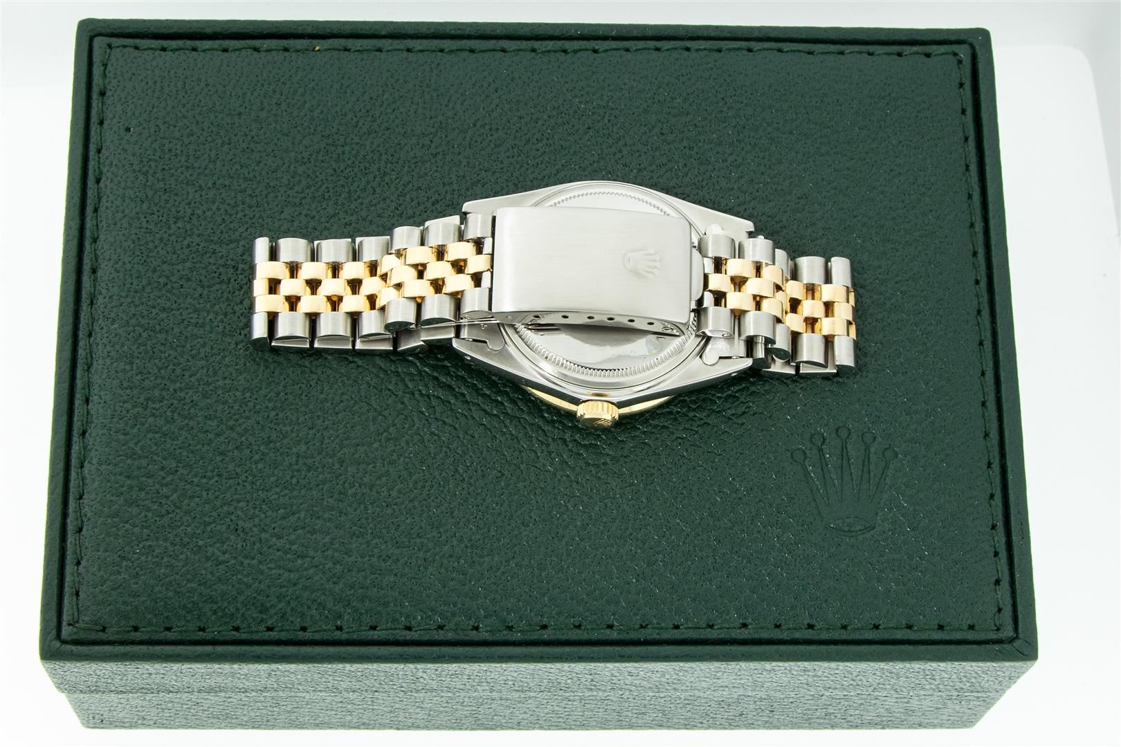 One Men's Yellow Gold Rolex Datejust Polished Bright with Satin Finish, Serviced & Electronically Tested, Rolex Stainless Steel Case: 36mm, Rolex Yellow Gold Crown, Custom Bezel: New 18K Yellow Gold Pyramid Diamond Bezel, Diamond Count: 24 Diamonds, Total Weight .75 Carat, Clarity: SI-VS, Color: G to H. Custom Crystal: New Sapphire With Magnified Date Window. Custom Hands: New Luminescent Hands. Rolex Movement: Automatic Winding Movement. Custom Dial: Refinished To Blue Vignette String With Added Diamonds, Diamond Count: 58 Diamonds In Dial, Color: G to H, Clarity: VS. Date Window: 3 O'clock Position Date Display, Quickset, Model: Datejust. Condition: G-6 Extra Fine. Rolex Bracelet: Yellow Gold And Stainless Steel Jubilee Band. Bright Polish & Satin Finish. 7.0 Inch Length, Adjustable. Standard Clasp, With Rolex Logo. This Pre Owned Watch Has Been Serviced And Polished It Is Free Of All Scratches And Dents. This Watch Comes With A Rolex Box.