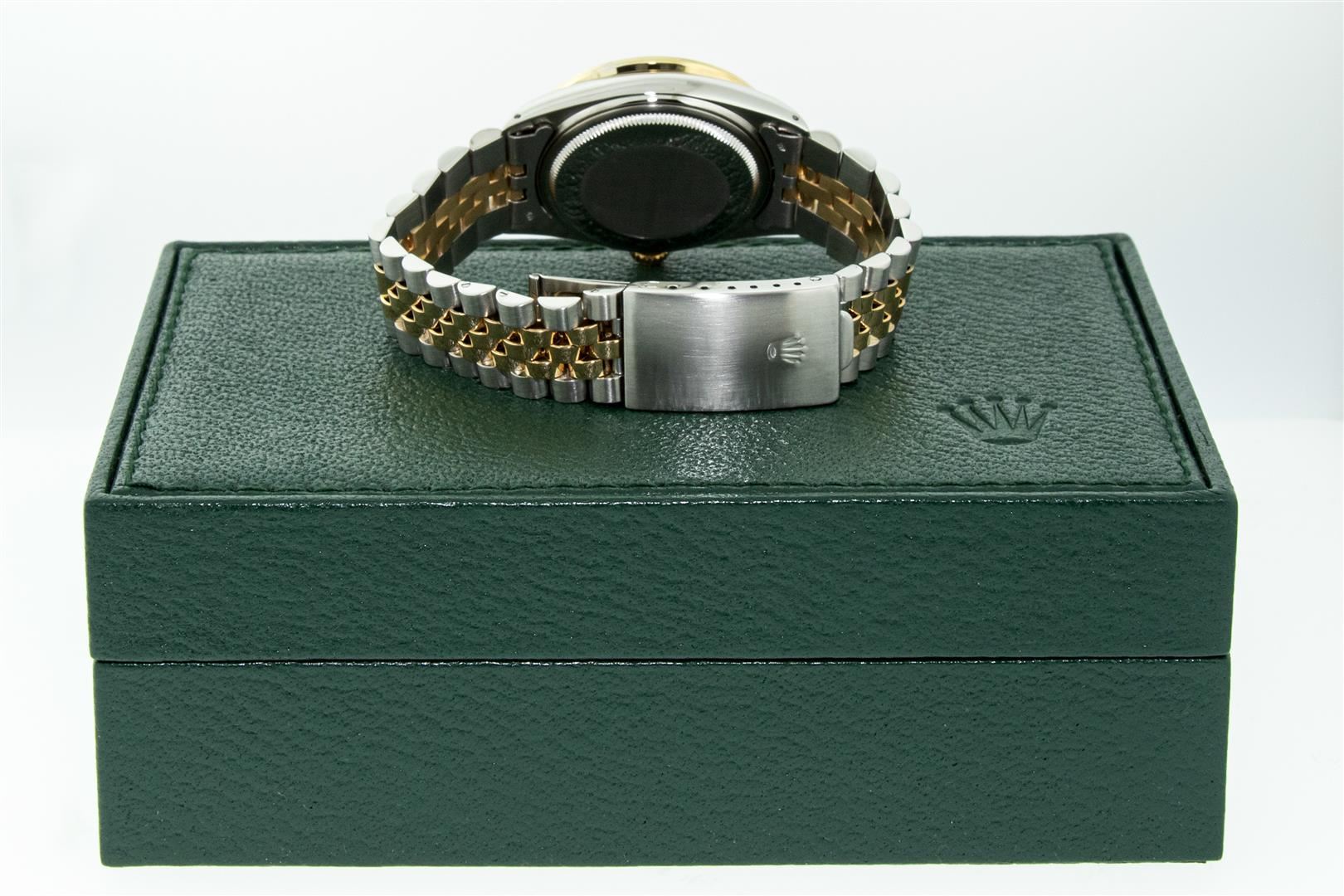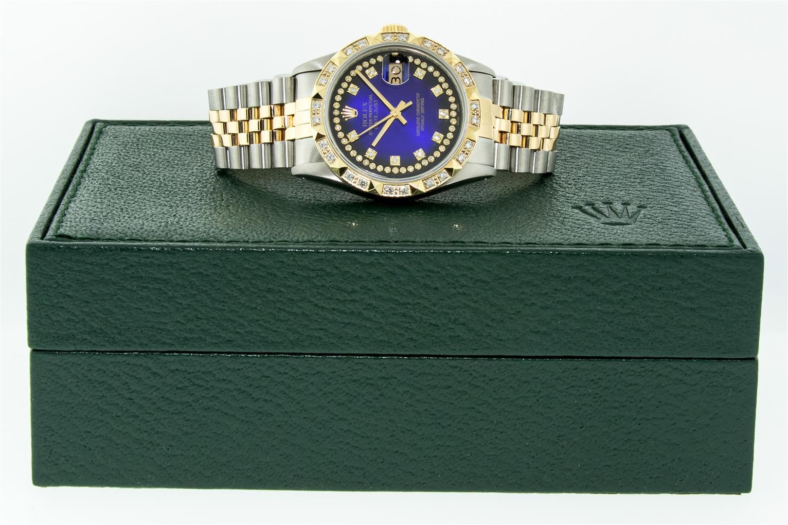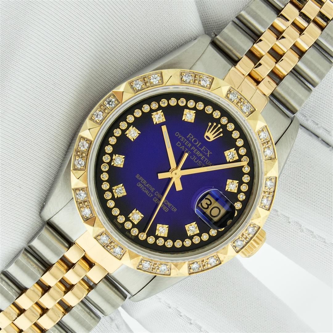 One Men's Yellow Gold Rolex Datejust Polished Bright with Satin Finish, Serviced & Electronically Tested, Rolex Stainless Steel Case: 36mm, Rolex Yellow Gold Crown, Custom Bezel: New 18K Yellow Gold Pyramid Diamond Bezel, Diamond Count: 24 Diamonds, Total Weight .75 Carat, Clarity: SI-VS, Color: G to H. Custom Crystal: New Sapphire With Magnified Date Window. Custom Hands: New Luminescent Hands. Rolex Movement: Automatic Winding Movement. Custom Dial: Refinished To Blue Vignette String With Added Diamonds, Diamond Count: 58 Diamonds In Dial, Color: G to H, Clarity: VS. Date Window: 3 O'clock Position Date Display, Quickset, Model: Datejust. Condition: G-6 Extra Fine. Rolex Bracelet: Yellow Gold And Stainless Steel Jubilee Band. Bright Polish & Satin Finish. 7.0 Inch Length, Adjustable. Standard Clasp, With Rolex Logo. This Pre Owned Watch Has Been Serviced And Polished It Is Free Of All Scratches And Dents. This Watch Comes With A Rolex Box.