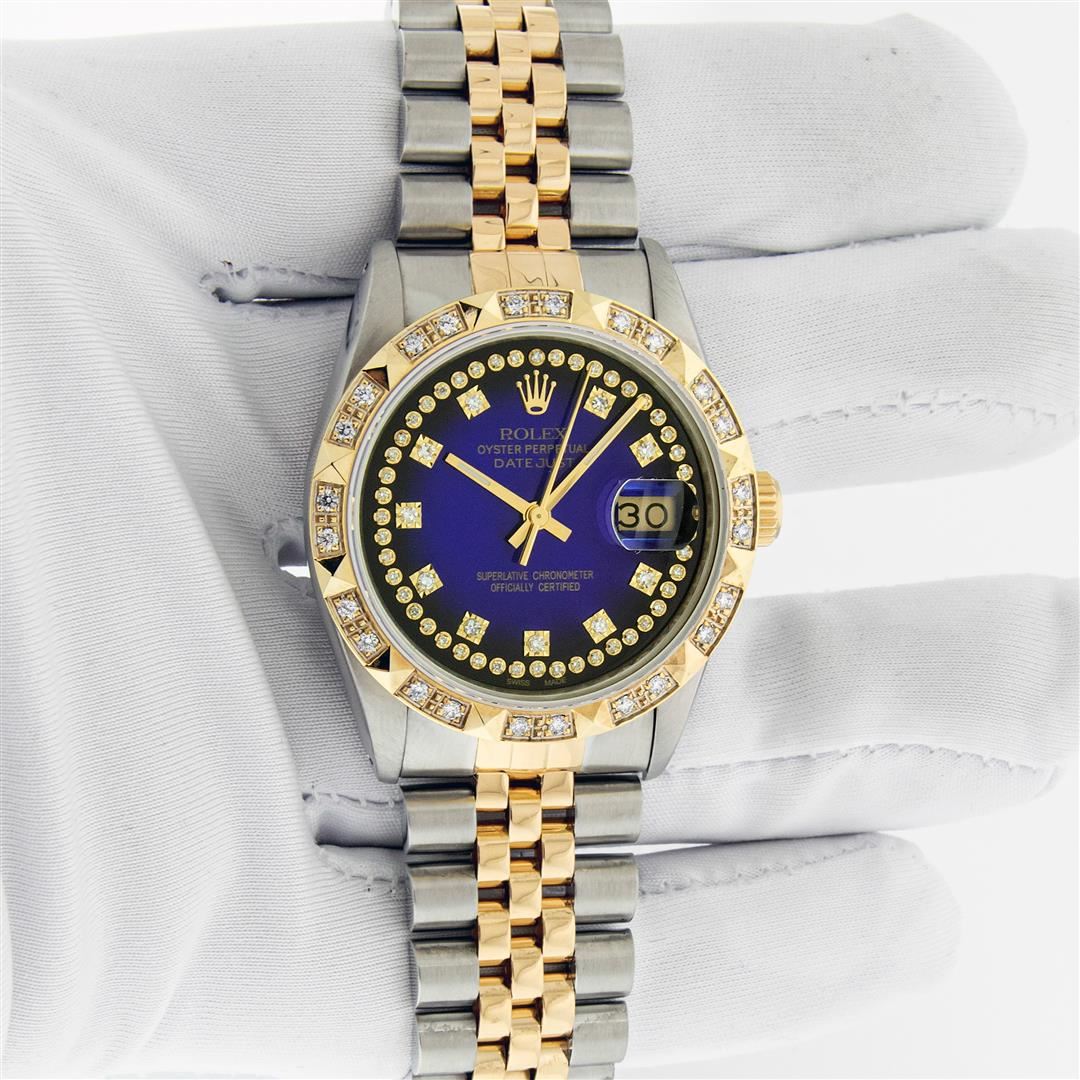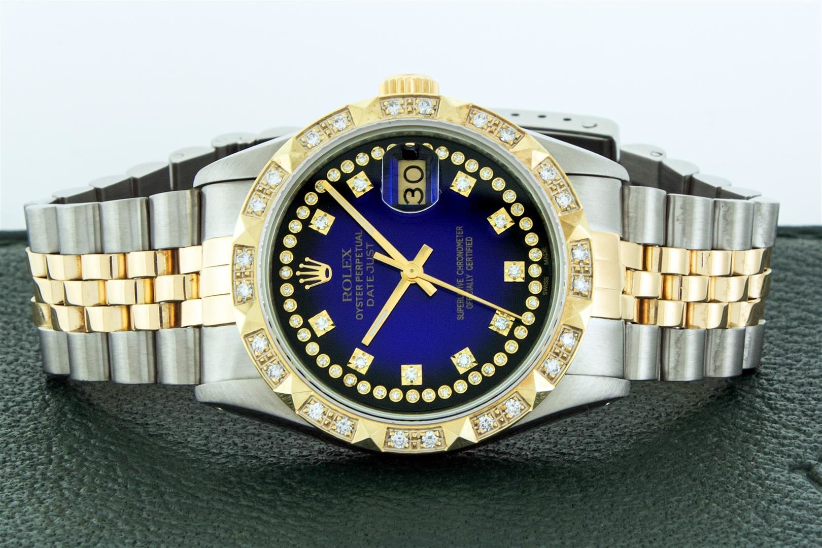 One Men's Yellow Gold Rolex Datejust Polished Bright with Satin Finish, Serviced & Electronically Tested, Rolex Stainless Steel Case: 36mm, Rolex Yellow Gold Crown, Custom Bezel: New 18K Yellow Gold Pyramid Diamond Bezel, Diamond Count: 24 Diamonds, Total Weight .75 Carat, Clarity: SI-VS, Color: G to H. Custom Crystal: New Sapphire With Magnified Date Window. Custom Hands: New Luminescent Hands. Rolex Movement: Automatic Winding Movement. Custom Dial: Refinished To Blue Vignette String With Added Diamonds, Diamond Count: 58 Diamonds In Dial, Color: G to H, Clarity: VS. Date Window: 3 O'clock Position Date Display, Quickset, Model: Datejust. Condition: G-6 Extra Fine. Rolex Bracelet: Yellow Gold And Stainless Steel Jubilee Band. Bright Polish & Satin Finish. 7.0 Inch Length, Adjustable. Standard Clasp, With Rolex Logo. This Pre Owned Watch Has Been Serviced And Polished It Is Free Of All Scratches And Dents. This Watch Comes With A Rolex Box.