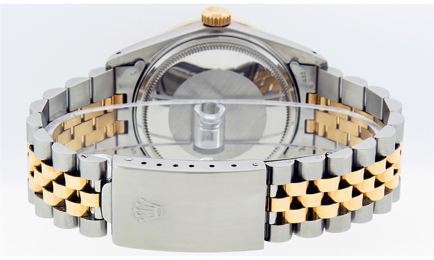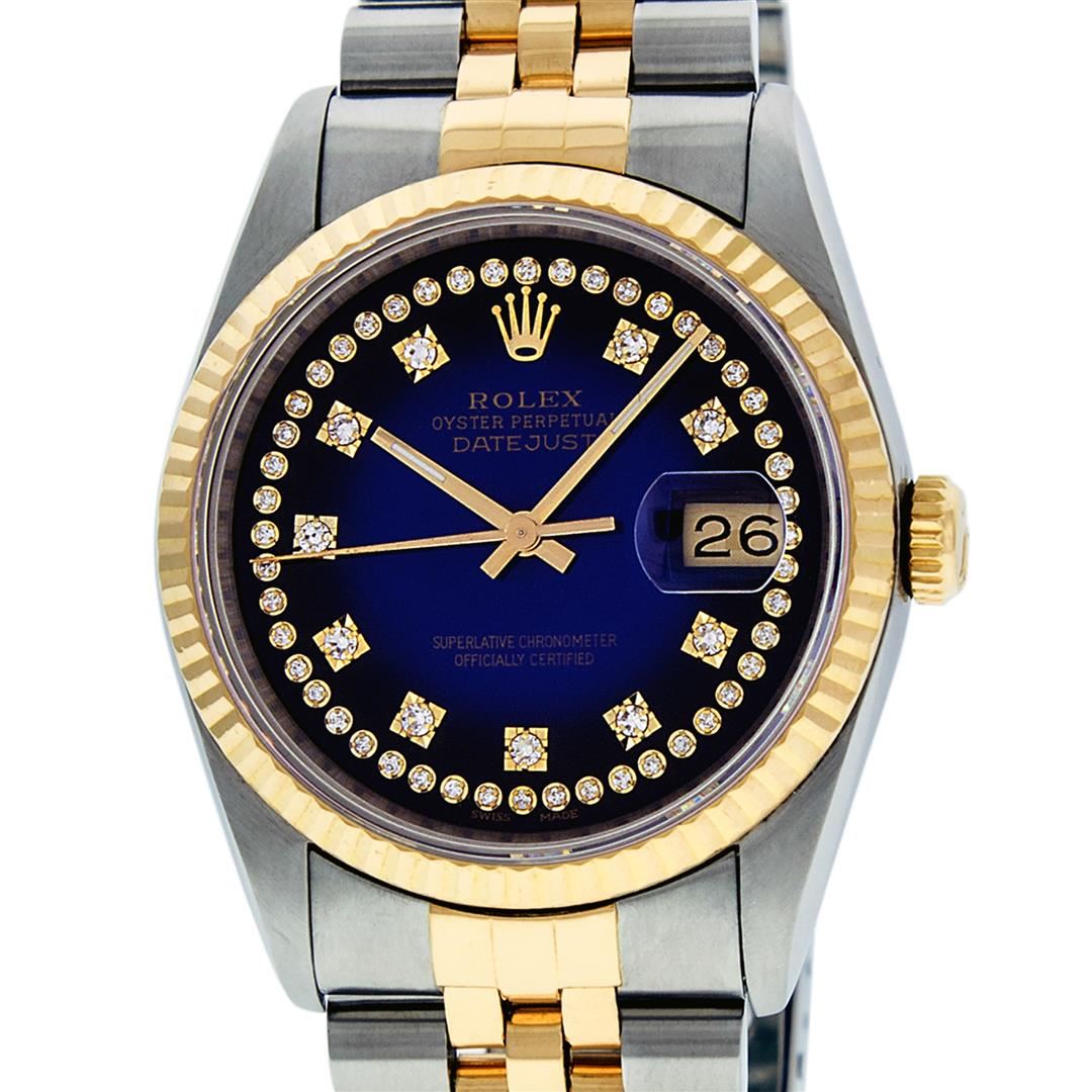 One Men's Yellow Gold Two Tone Rolex Datejust Polished, Serviced & Electronically Tested, Yellow Gold & Stainless Steel Case: 36mm, Yellow Gold Crown, Bezel: Yellow Gold Fluted Bezel. Custom Crystal: New Acrylic Cyclops Lens. Custom Hands: New Luminescent Hands. Movement: Automatic Winding Movement . Custom Dial: Blue Vignette String Dial Set With VS Diamond Hour Markers, Diamond Count: 58 Diamonds in Dial, G To H In Color, SI-VS Clarity. Date Window: 3 O'clock Position Date Display, Quickset, Model: Datejust, Condition: G-6 Extra Fine. Bracelet: Two Tone Yellow Gold & Stainless Steel Jubilee. Bright Polish. 7.0 Inch Length, Adjustable. Standard Clasp, With Rolex Logo. This Watch Has Been Serviced And Polished It Is Free Of All Scratches And Dents.