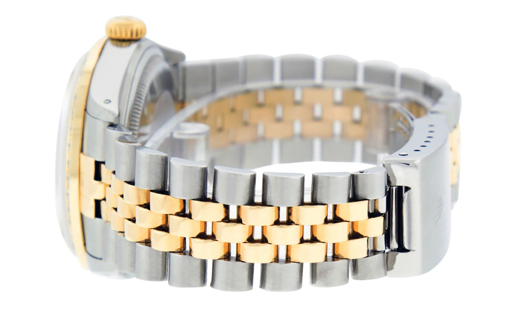 One Men's Yellow Gold Two Tone Rolex Datejust Polished, Serviced & Electronically Tested, 18K Yellow Gold & Stainless Steel Case: 36mm, 18K Yellow Gold Crown, Custom Bezel: New 18K Yellow Gold Beadset Diamond Bezel, Diamond Count: 44 Diamonds, Total Weight 1.00 Carat, Clarity: SI-VS, Color: G to H. Crystal: New Synthetic Sapphire Cyclops Lens. Custom Hands: New Luminescent Hands. Movement: Automatic Winding Movement.. Custom Dial: Champagne and Baguette Diamond Hour Markers On 6 and 9, Diamond Count: 8 + 2 Baguette Diamonds in Dial G To H In Color, Clarity: VS2-SI1, Date Window: 3 O'clock Position Date Display, Quickset, Model: 16013 Condition: G-6 Extra Fine. Bracelet: Two Tone Yellow Gold & Stainless Steel Jubilee. Bright Polish. 7.0 Inch Length, Adjustable. Standard Clasp, With Rolex Logo. This Watch Has Been Serviced Time Tested And Is In Excellent Condition It Is Free Of All Scratches And Dents.