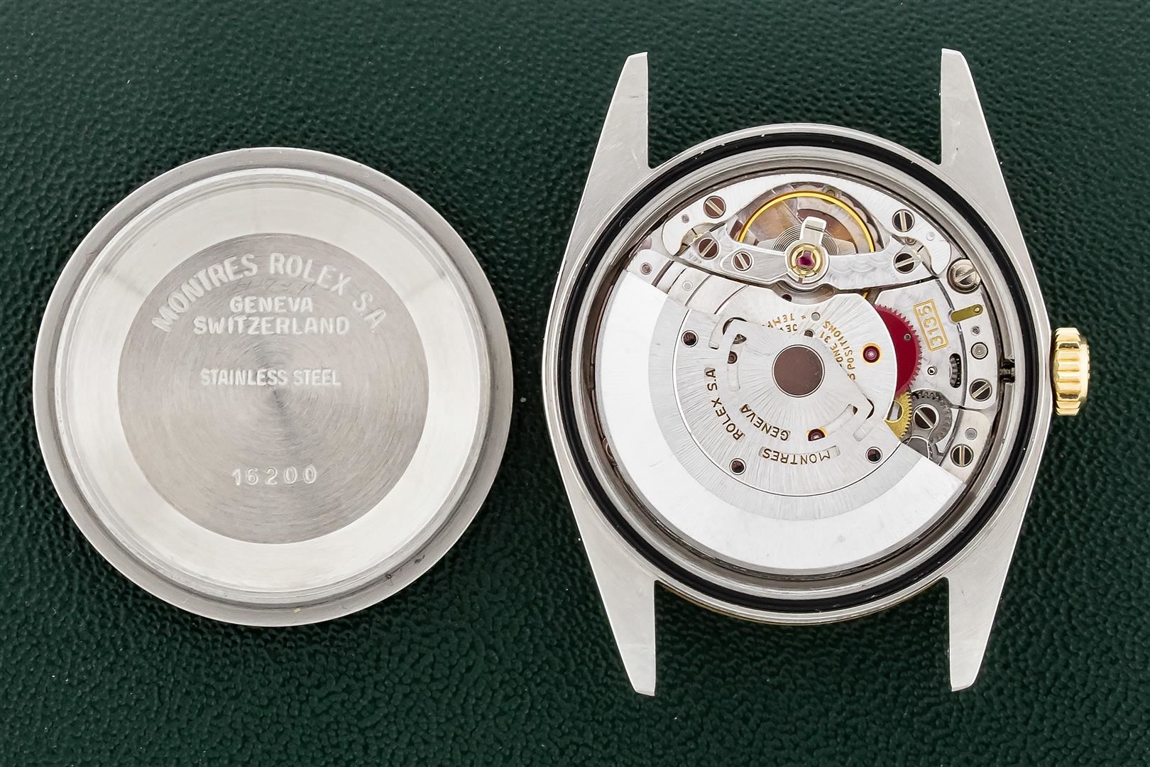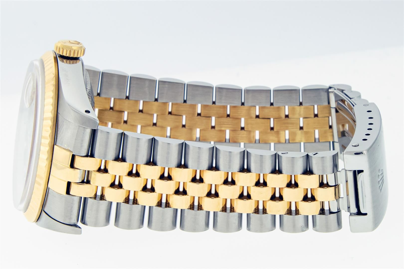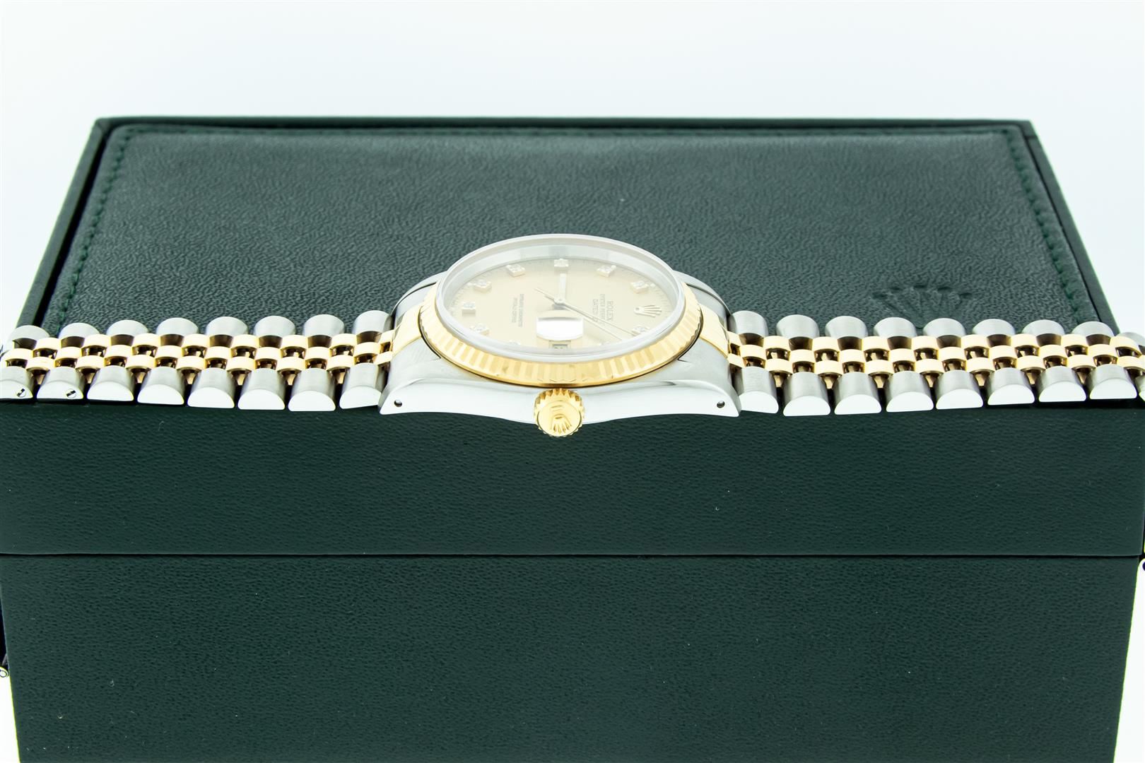 One Men's Pre Owned 18K Yellow Gold & Stainless Steel Two Tone Rolex Oyster Perpetual Datejust Polished, Serviced & Electronically Tested, Rolex 18K Yellow Gold & Stainless, Rolex Steel Case: 36mm, Original 18K Yellow Gold Crown, Rolex Bezel: Rolex 18K Yellow Gold Fluted Bezel. Rolex Crystal: Sapphire Crystal Lens. Rolex Hands: Genuine Rolex Luminescent Hands. Rolex Movement: Automatic Winding Movement 3135. Rolex Dial: Rolex Factory Champagne Dial with Diamond Hour Markers Dash Track & Lumi Dots, Diamond Count: 10 Diamonds in Dial, Clarity: VVS Date Window: 3 O'clock Position Date Display, Sapphire Quickset, Model: Sapphire Datejust 16233, Condition: G-6 Extra Fine. Rolex Bracelet: Two Tone 18K Yellow Gold & Stainless Steel Jubilee Band. Bright Polish. 7.0 Inch Length, Adjustable. Standard Clasp, With Rolex Logo. This Pre Owned Watch Has Been Serviced And Polished It Is Free Of All Scratches And Dents. This Watch Comes With A Rolex Box.