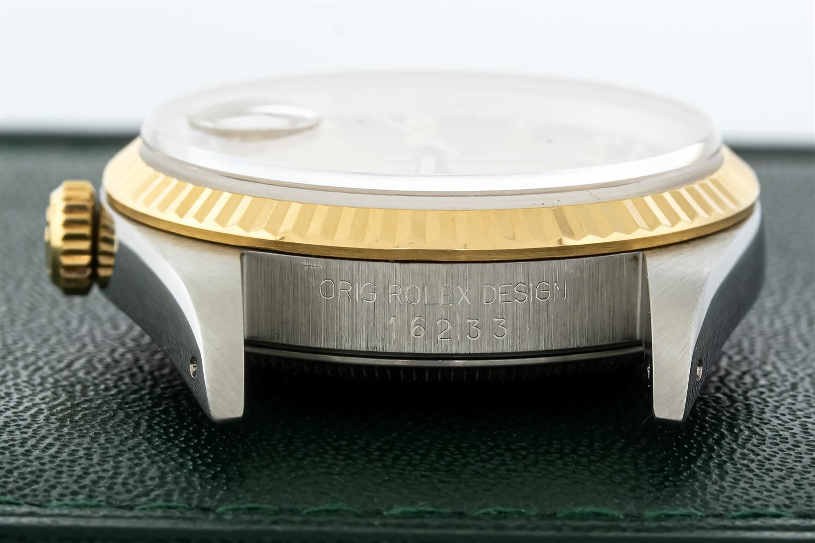 One Men's Pre Owned 18K Yellow Gold & Stainless Steel Two Tone Rolex Oyster Perpetual Datejust Polished, Serviced & Electronically Tested, Rolex 18K Yellow Gold & Stainless, Rolex Steel Case: 36mm, Original 18K Yellow Gold Crown, Rolex Bezel: Rolex 18K Yellow Gold Fluted Bezel. Rolex Crystal: Sapphire Crystal Lens. Rolex Hands: Genuine Rolex Luminescent Hands. Rolex Movement: Automatic Winding Movement 3135. Rolex Dial: Rolex Factory Champagne Dial with Diamond Hour Markers Dash Track & Lumi Dots, Diamond Count: 10 Diamonds in Dial, Clarity: VVS Date Window: 3 O'clock Position Date Display, Sapphire Quickset, Model: Sapphire Datejust 16233, Condition: G-6 Extra Fine. Rolex Bracelet: Two Tone 18K Yellow Gold & Stainless Steel Jubilee Band. Bright Polish. 7.0 Inch Length, Adjustable. Standard Clasp, With Rolex Logo. This Pre Owned Watch Has Been Serviced And Polished It Is Free Of All Scratches And Dents. This Watch Comes With A Rolex Box.