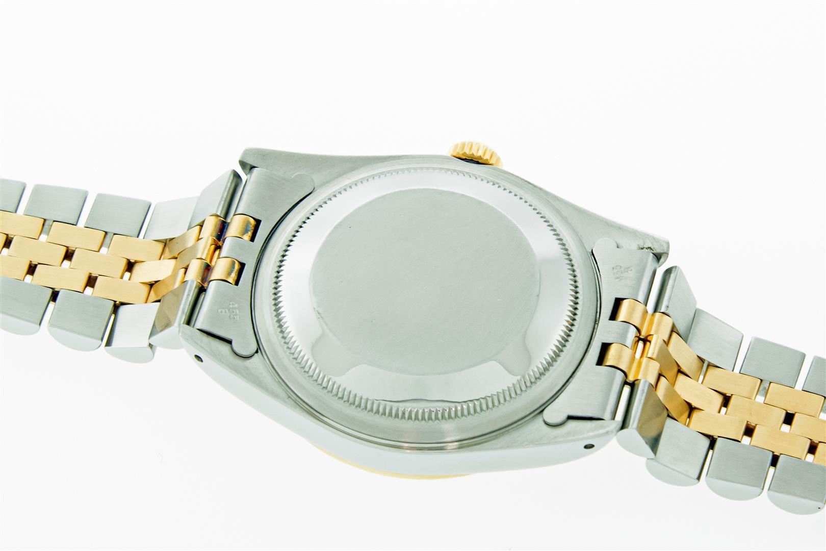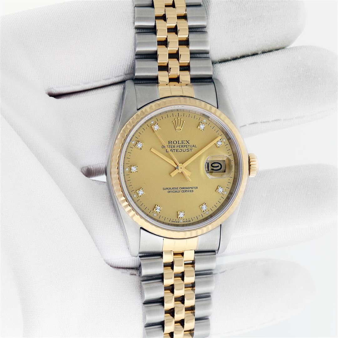 One Men's 18K Yellow Gold & Stainless Steel Two Tone Rolex Oyster Perpetual Datejust Polished, Serviced & Electronically Tested, Rolex 18K Yellow Gold & Stainless Steel Case: 36mm, Rolex Original Bezel: 18K Yellow Gold Fluted Bezel, Custom Crystal: New Sapphire With Magnified Date Window. Custom Hands: New Yellow Hands. Rolex Movement: Automatic Winding Movement 3135. Rolex Dial: Original Rolex Factory Champagne Dial with Diamond Hour Markers Dash Track & Lumi Dots, Diamond Count: 10 Diamonds in Dial, Clarity: VVS Date Window: 3 O'clock Position Date Display, Quickset, Model: Datejust, Condition: G-6 Extra Fine. Rolex Bracelet: Two Tone 18K Yellow Gold & Stainless Steel Jubilee Band. 7.0 Inch Length, Adjustable. Standard Clasp, With Rolex Logo. This Pre Owned Watch Has Been Serviced And Polished It Is Free Of All Scratches And Dents. This Watch Comes With The Following Accessories: Rolex Box, Rolex Booklets, and Rolex Wallet.