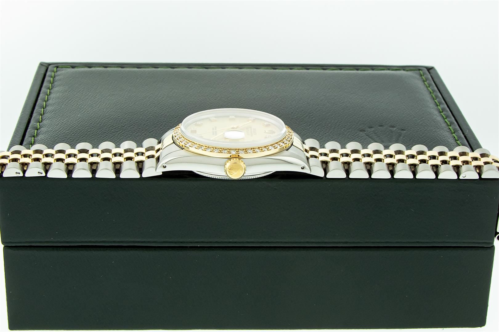 One Men's Pre Owned Yellow Gold & Stainless Steel Two Tone Rolex Oyster Perpetual Datejust Polished, Serviced & Electronically Tested, Rolex 18K Yellow Gold & Stainless Steel Case: 36mm, Rolex 18K Yellow Gold Crown, Custom Bezel: New 18K Yellow Gold Beadset Diamond Bezel, Diamond Count: 44 Diamonds, Total Weight 1.00 Carat, Clarity: SI-VS, Color: G to H. Custom Crystal: New Sapphire With Magnified Date Window. Custom Hands: Yellow Hands Rolex Movement: Automatic Winding Movement 3035. Rolex Dial: Original Rolex Factory Champagne Dial with Diamond Hour Markers Dash Track & Lumi Dots, Diamond Count: 10 Diamonds in Dial, Clarity: VVS Date Window: 3 O'clock Position Date Display, Quickset, Model: Datejust, Condition: G-6 Extra Fine. Rolex Bracelet: Two Tone Yellow Gold & Stainless Steel Jubilee Band. Bright Polish. 7.0 Inch Length, Adjustable. Standard Clasp, With Rolex Logo. This Pre Owned Watch Has Been Serviced And Polished It Is Free Of All Scratches And Dents. This Watch Comes With A Rolex Box.