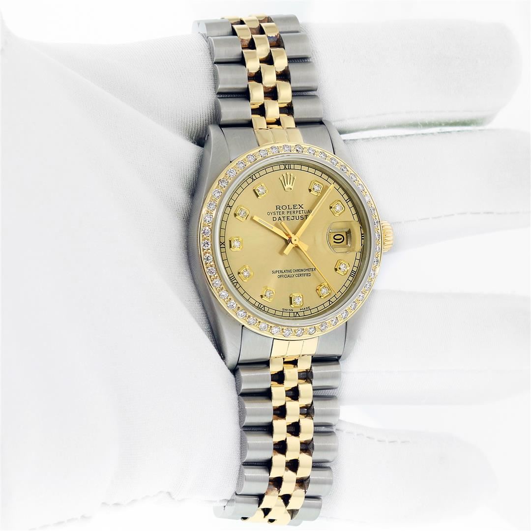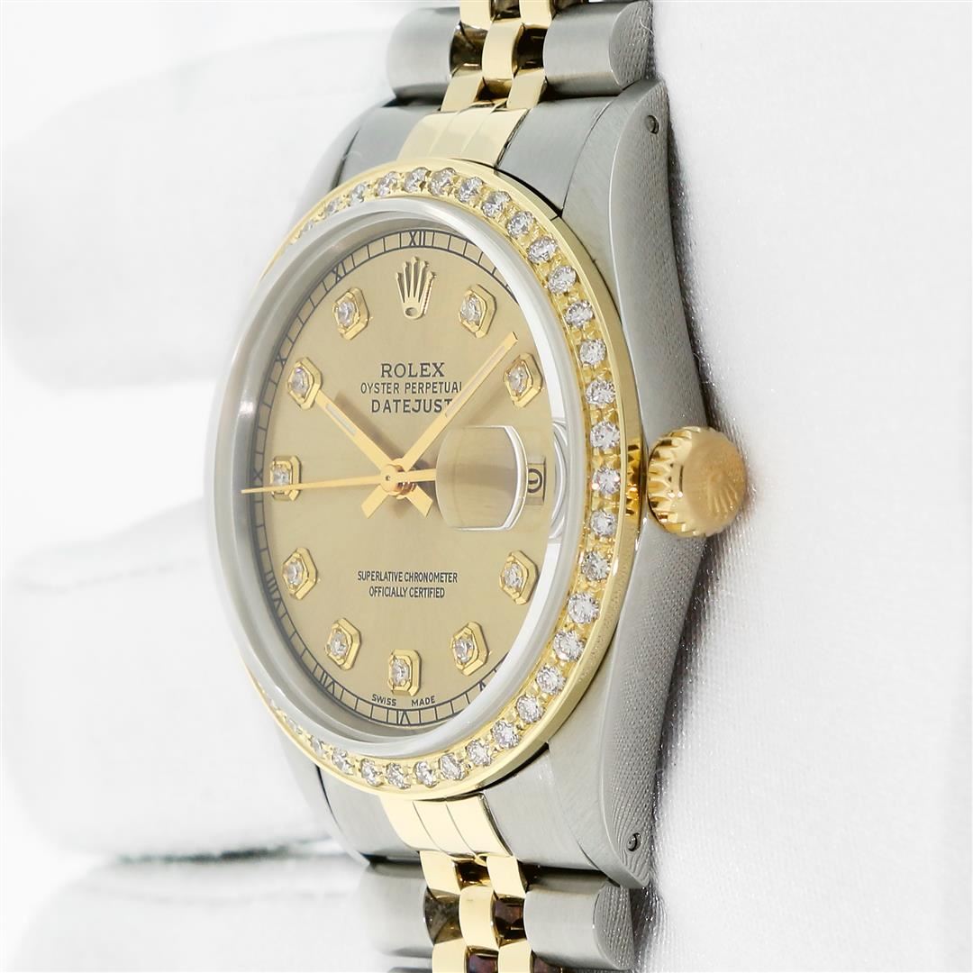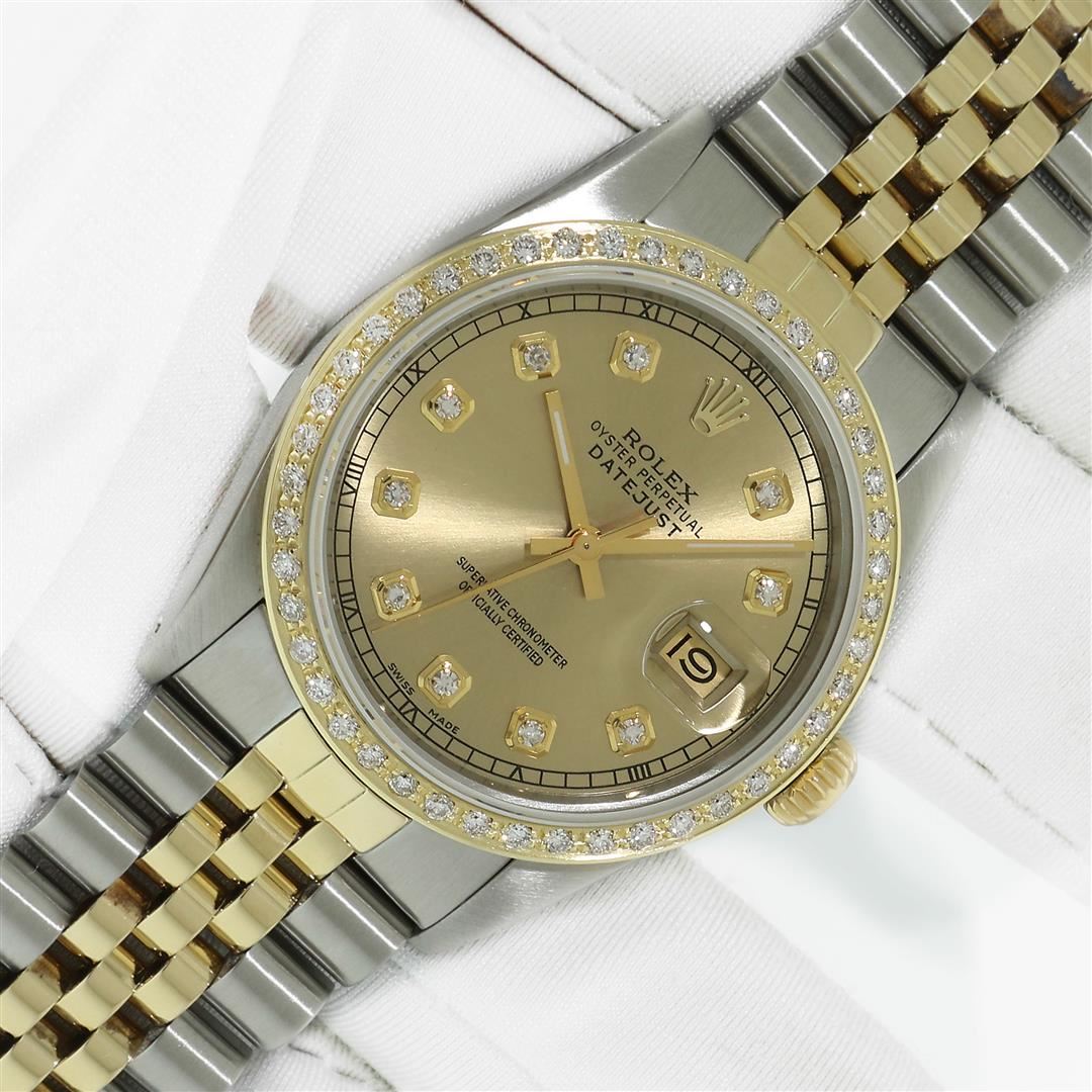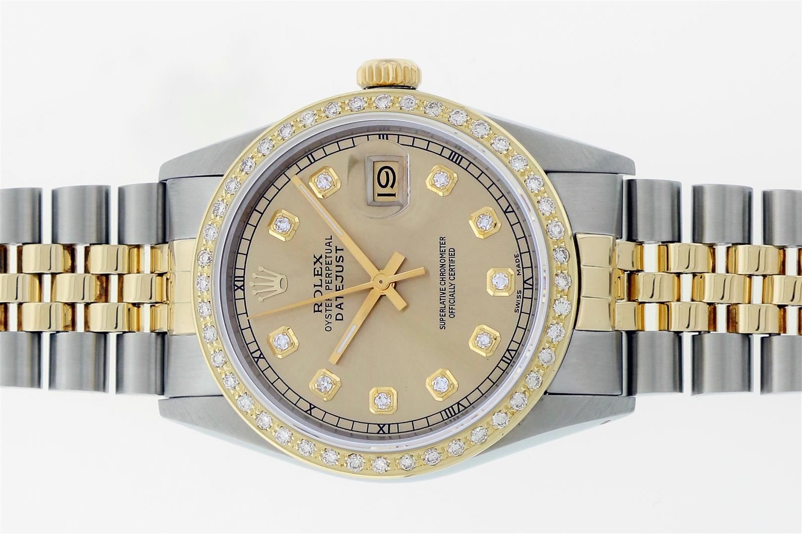 One Men's Yellow Gold Two Tone Rolex Datejust Polished, Serviced & Electronically Tested, Rolex Yellow Gold & Stainless Steel Case: 36mm, Rolex Yellow Gold Crown, Custom Bezel: 18K Yellow Gold Beadset Diamond Bezel, Diamond Count: 44 Diamonds, Clarity: SI-VS, Color: G to H. Custom Crystal: New Sapphire With Magnified Date Window. Custom Hands: New Luminescent Hands. Rolex Movement: Automatic Winding Movement. Custom Dial: Refinished To Champagne With Added Diamonds, Diamond Count: 10 Diamonds in Dial, G To H In Color, VS In Clarity. Date Window: 3 O'clock Position Date Display, Quickset, Model: Datejust. Condition: G-6 Extra Fine. Rolex Bracelet: Two Tone Yellow Gold & Stainless Steel Jubilee Band. Bright Polish. 7.0 Inch Length, Adjustable. Standard Clasp, With Rolex Logo. This Pre Owned Watch Has Been Serviced Time Tested And Is In Excellent Condition It Is Free Of All Scratches And Dents.