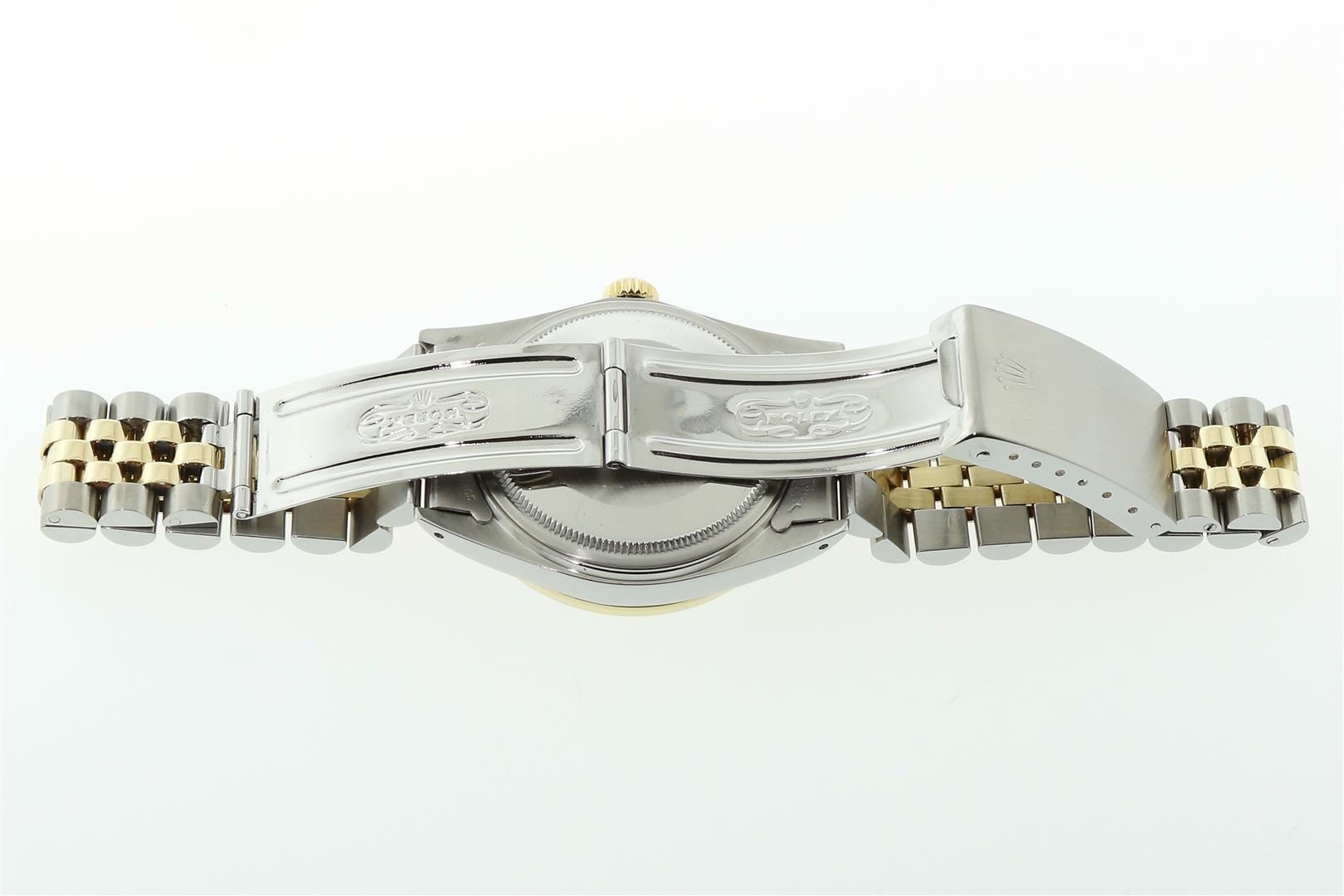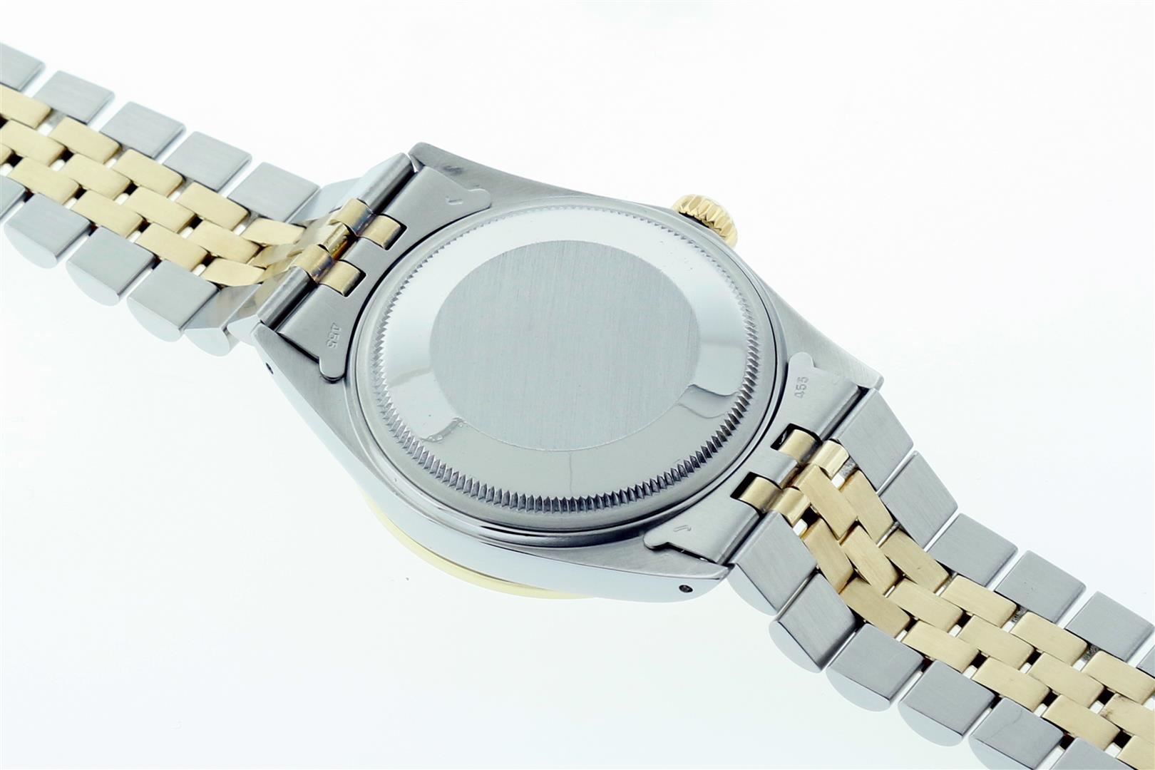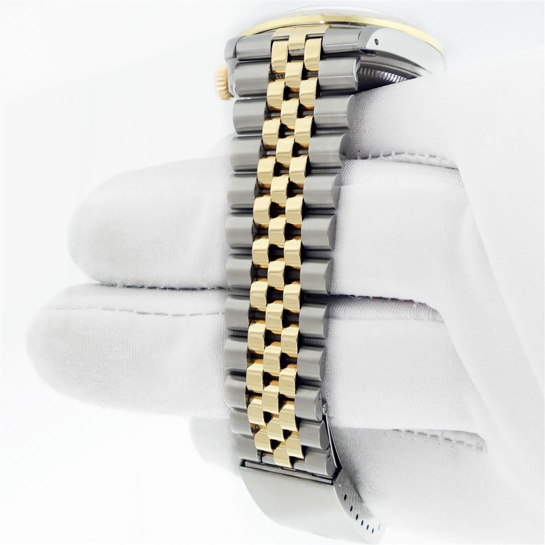 One Men's Yellow Gold Two Tone Rolex Datejust Polished, Serviced & Electronically Tested, Rolex Yellow Gold & Stainless Steel Case: 36mm, Rolex Yellow Gold Crown, Custom Bezel: 18K Yellow Gold Beadset Diamond Bezel, Diamond Count: 44 Diamonds, Clarity: SI-VS, Color: G to H. Custom Crystal: New Sapphire With Magnified Date Window. Custom Hands: New Luminescent Hands. Rolex Movement: Automatic Winding Movement. Custom Dial: Refinished To Champagne With Added Diamonds, Diamond Count: 10 Diamonds in Dial, G To H In Color, VS In Clarity. Date Window: 3 O'clock Position Date Display, Quickset, Model: Datejust. Condition: G-6 Extra Fine. Rolex Bracelet: Two Tone Yellow Gold & Stainless Steel Jubilee Band. Bright Polish. 7.0 Inch Length, Adjustable. Standard Clasp, With Rolex Logo. This Pre Owned Watch Has Been Serviced Time Tested And Is In Excellent Condition It Is Free Of All Scratches And Dents.