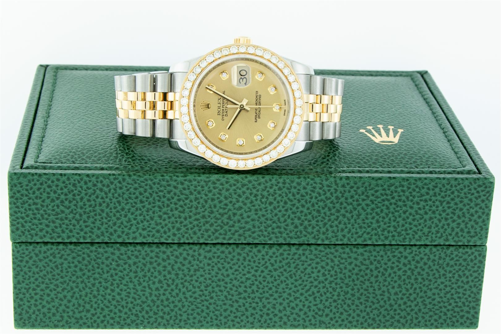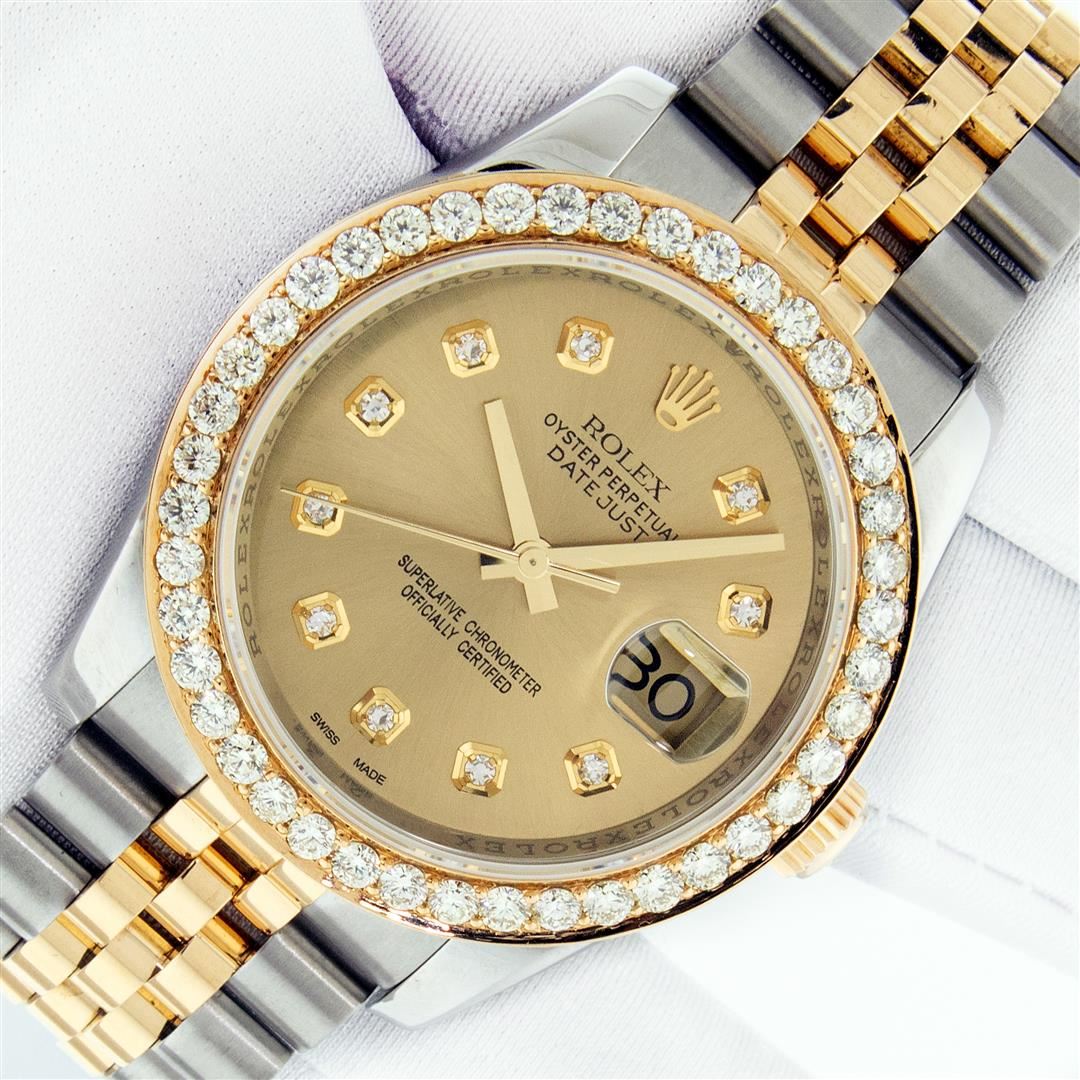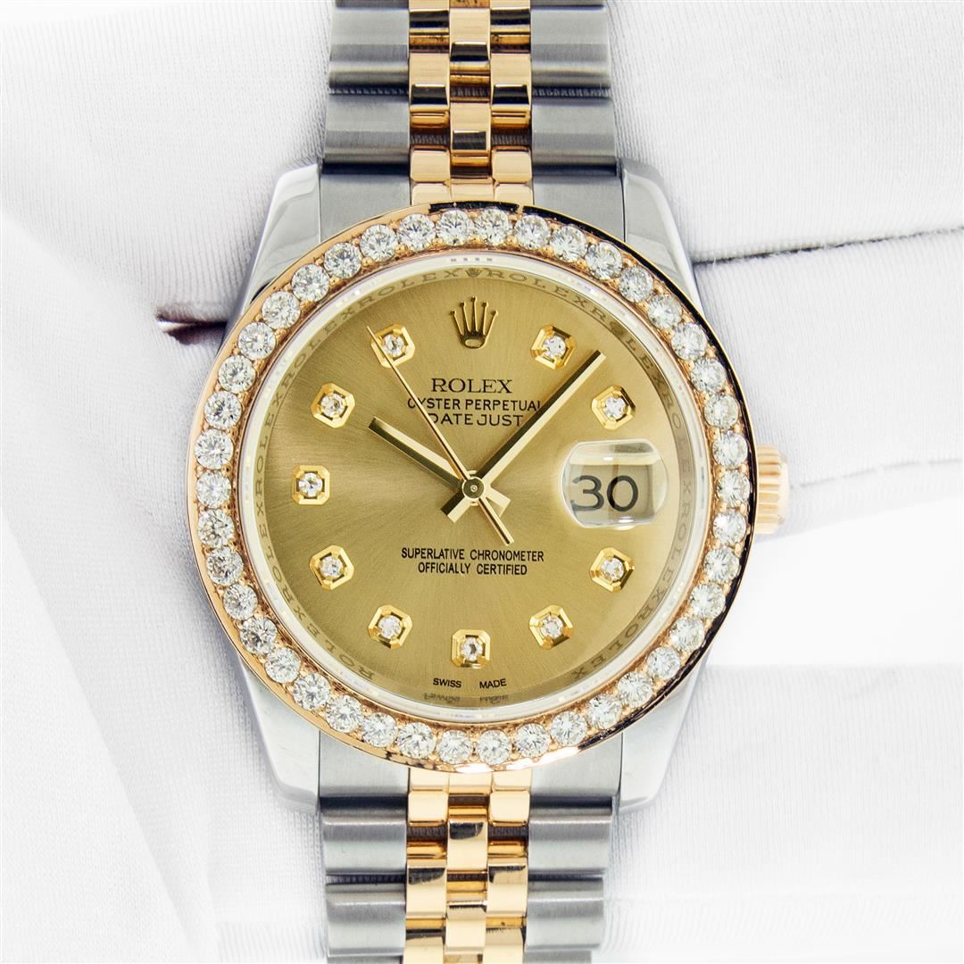 One Mens 18K Yellow Gold And Stainless Steel Rolex Datejust Polished, Serviced & Electronically Tested, Yellow Gold & Stainless Steel Case: 36mm, Yellow Gold Crown, Custom Bezel: New 18K Yellow Gold Beadset Diamond Bezel, Total Weight 2.60 Carat, Clarity: SI-VS, Color: G to H. Crystal: Sapphire With Magnified Date Window. Hands: Non Luminescent Hands. Rolex Movement: Automatic Winding Movement. Dial: Original Rolex Factory Champagne Dial With Diamond Hour Markers. Diamond Count: 10 Diamonds In Dial, Clarity: VVS, Date Window: 3 O'Clock Position Date Display, Quickset, Model: Quickset Datejust 116233. Condition: G-6 Extra Fine. Rolex Bracelet: Stainless Steel and Yellow Gold Jubilee Band. Bright Polish & Satin Finish. 7.0 Inch Length, Adjustable. Standard Clasp, With Rolex Logo. This Watch Comes With A Rolex Box.