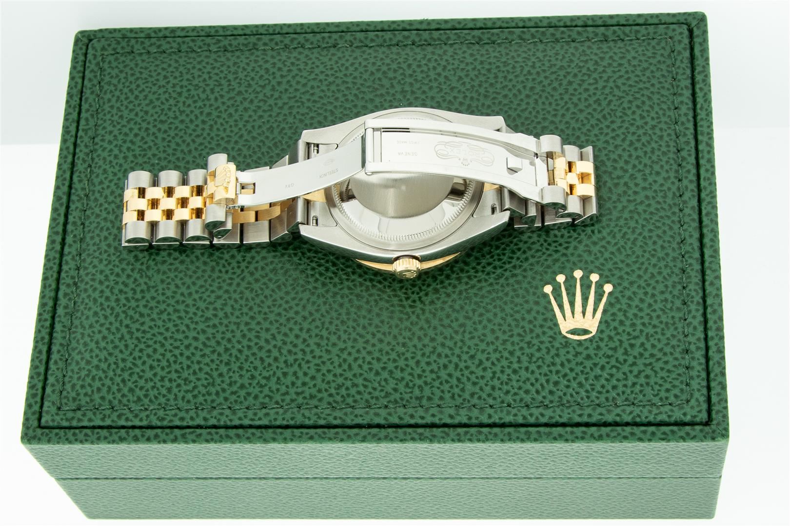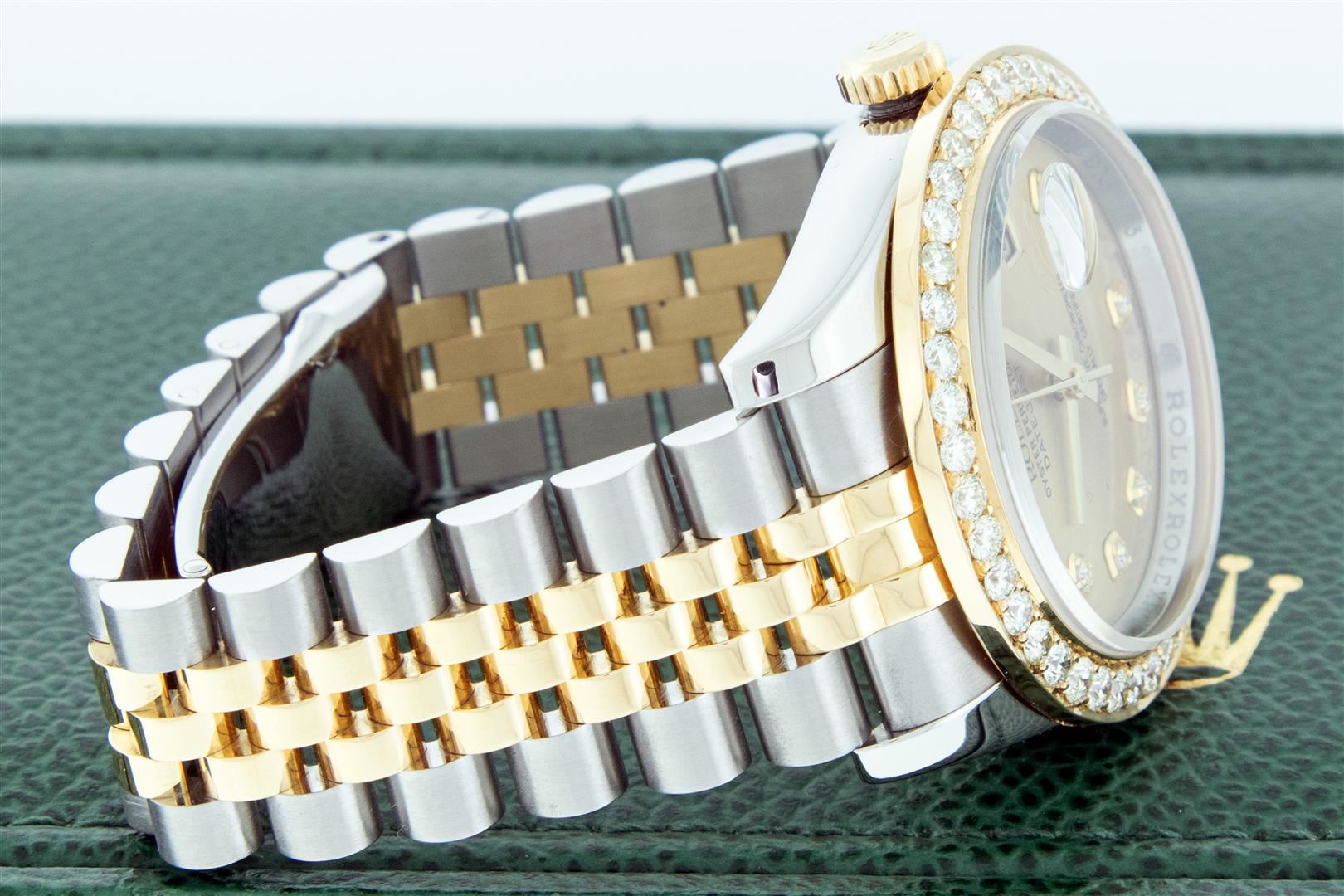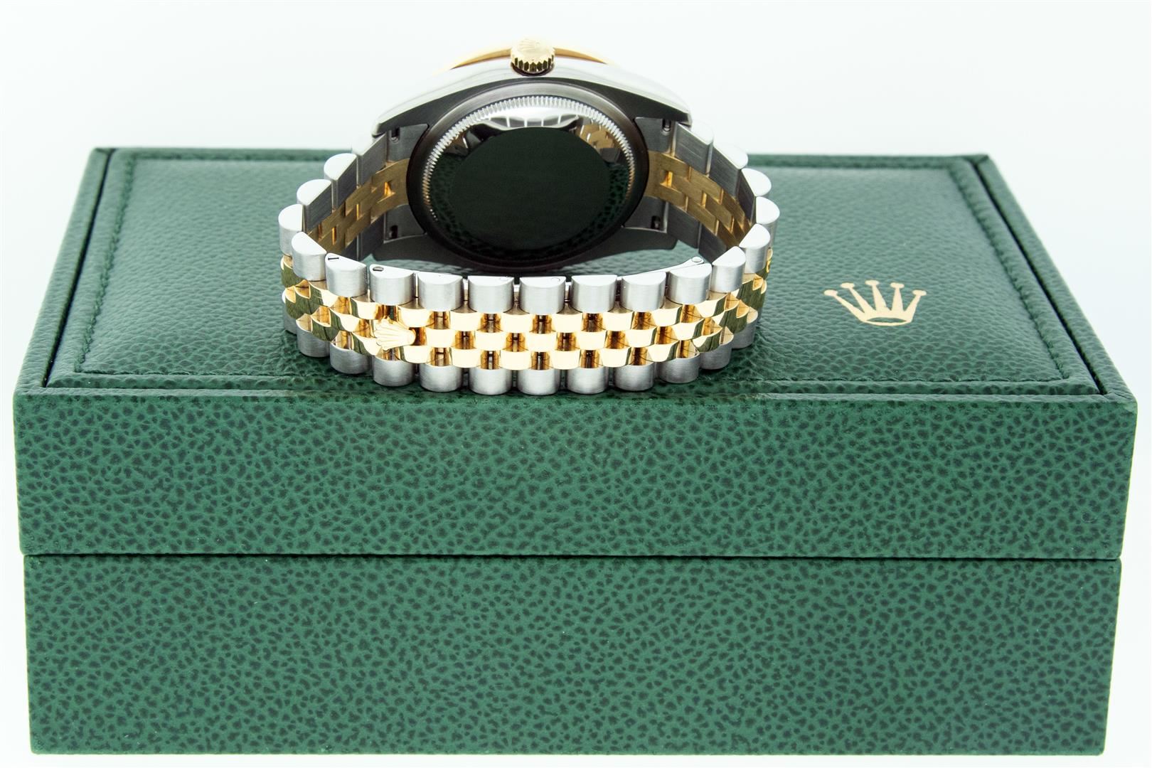 One Mens 18K Yellow Gold And Stainless Steel Rolex Datejust Polished, Serviced & Electronically Tested, Yellow Gold & Stainless Steel Case: 36mm, Yellow Gold Crown, Custom Bezel: New 18K Yellow Gold Beadset Diamond Bezel, Total Weight 2.60 Carat, Clarity: SI-VS, Color: G to H. Crystal: Sapphire With Magnified Date Window. Hands: Non Luminescent Hands. Rolex Movement: Automatic Winding Movement. Dial: Original Rolex Factory Champagne Dial With Diamond Hour Markers. Diamond Count: 10 Diamonds In Dial, Clarity: VVS, Date Window: 3 O'Clock Position Date Display, Quickset, Model: Quickset Datejust 116233. Condition: G-6 Extra Fine. Rolex Bracelet: Stainless Steel and Yellow Gold Jubilee Band. Bright Polish & Satin Finish. 7.0 Inch Length, Adjustable. Standard Clasp, With Rolex Logo. This Watch Comes With A Rolex Box.