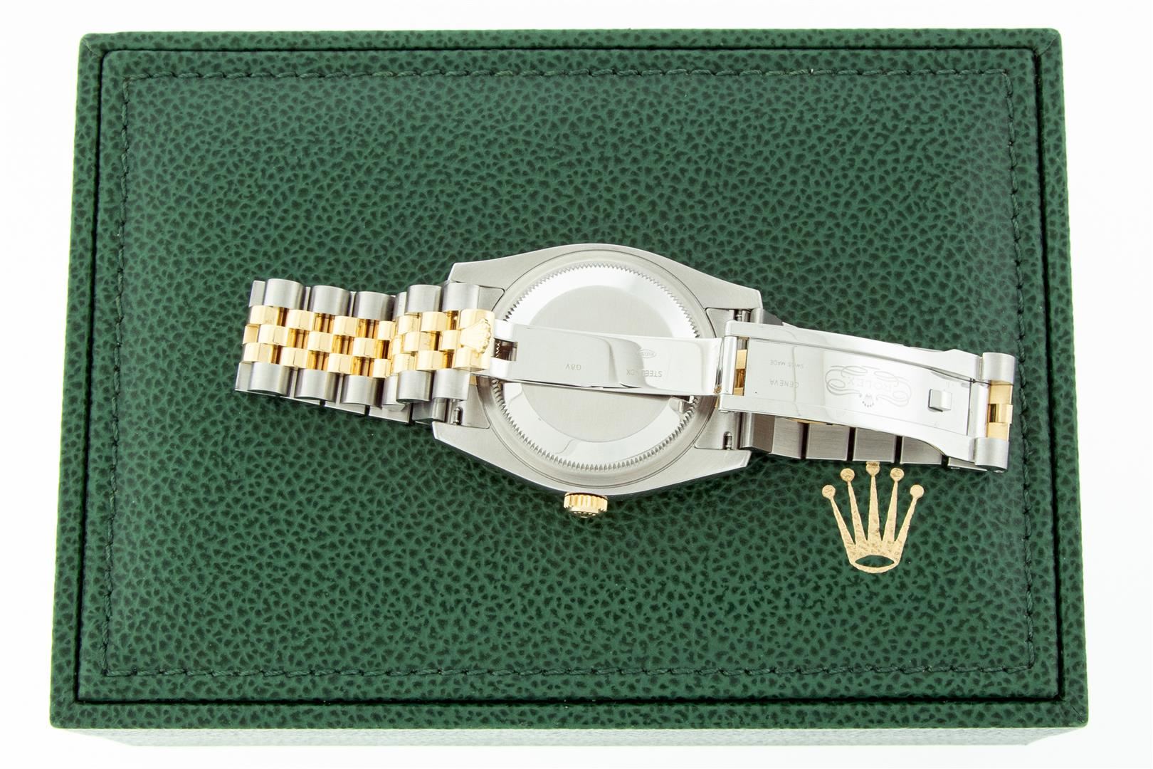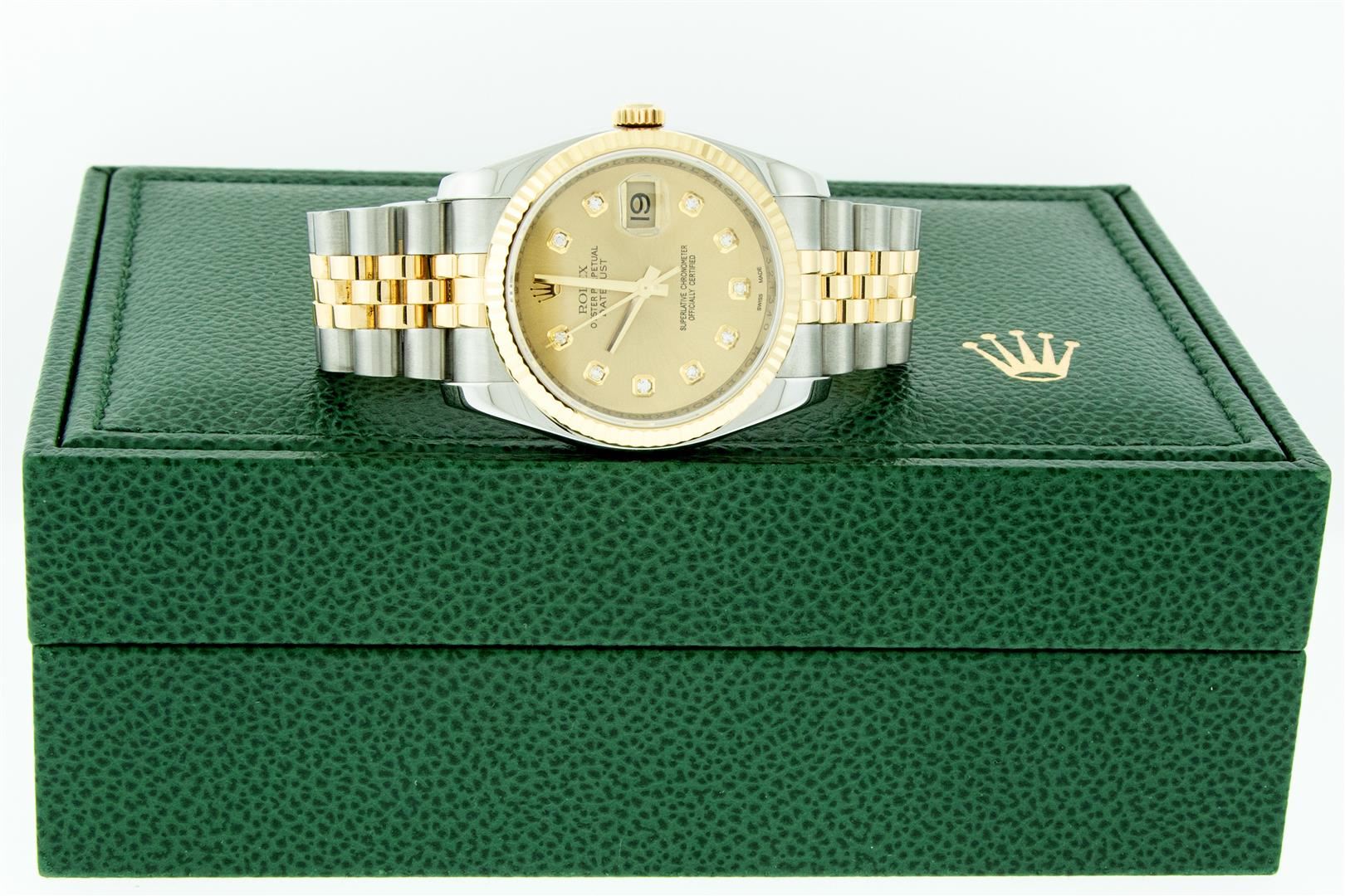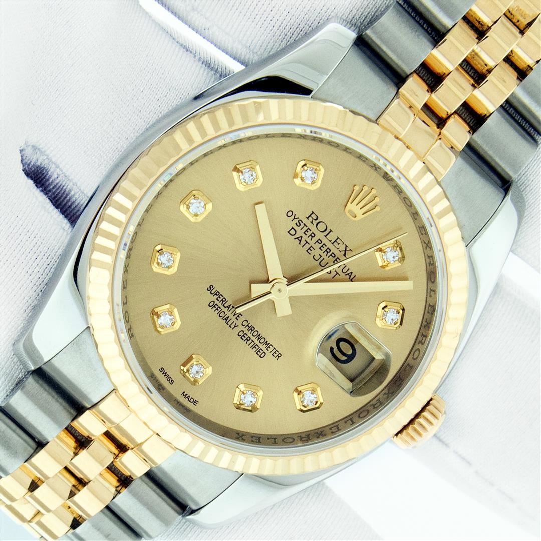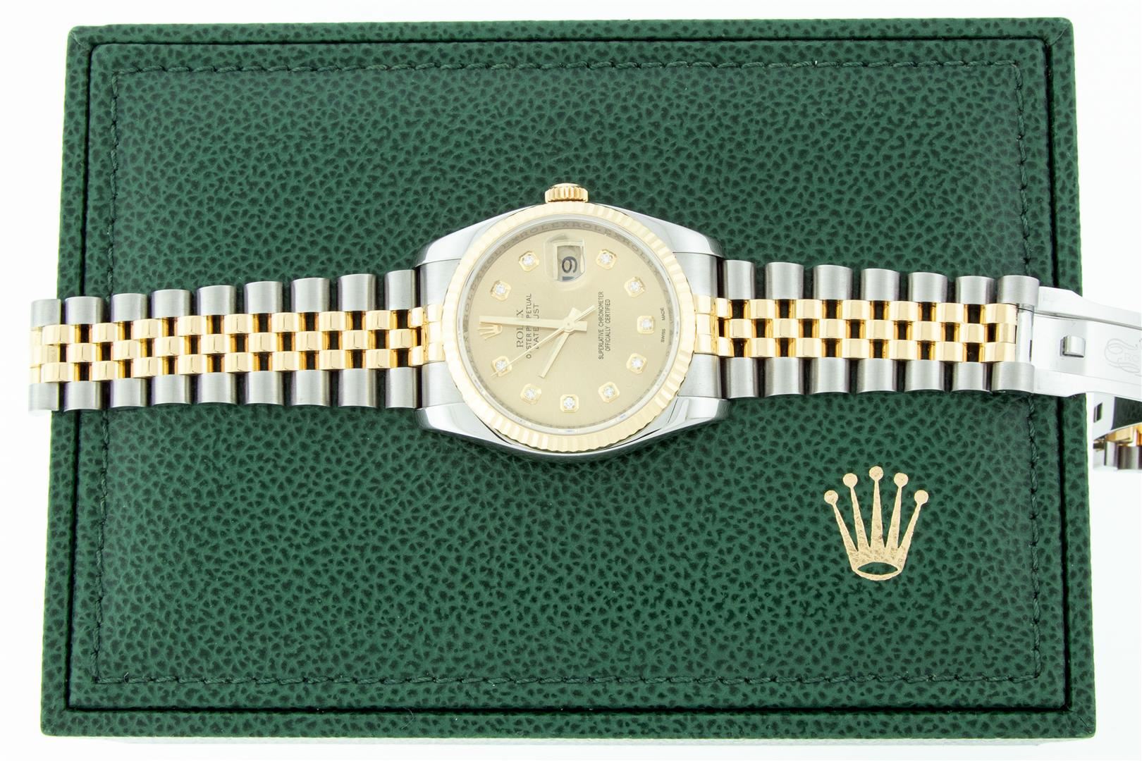 One Mens Pre Owned 18K Yellow Gold and Stainless Steel Two Tone Rolex Datejust Polished, Serviced & Electronically Tested, Rolex Yellow Gold & Stainless Steel Case: 36mm, Rolex Yellow Gold Crown, Rolex Bezel: Rolex 18K Yellow Gold Fluted Bezel. Crystal: Sapphire With Cyclops Lens. Hands: Rolex Hands. Rolex Dial: Rolex Factory Champagne Dial With Diamond Hour Markers. Diamond Count: 10 Diamonds In Dial, Clarity: VVS, Date Window: 3 O'Clock Position Date Display, Quickset, Model: Quickset Datejust 116233. Condition: G-6 Extra Fine. Rolex Bracelet: 18K Yellow Gold and Stainless Steel Jubilee Band. Bright Polish & Satin Finish. 7.0 Inch Length, Adjustable. Standard Clasp, With Rolex Logo. This Watch Comes With A Rolex Box.