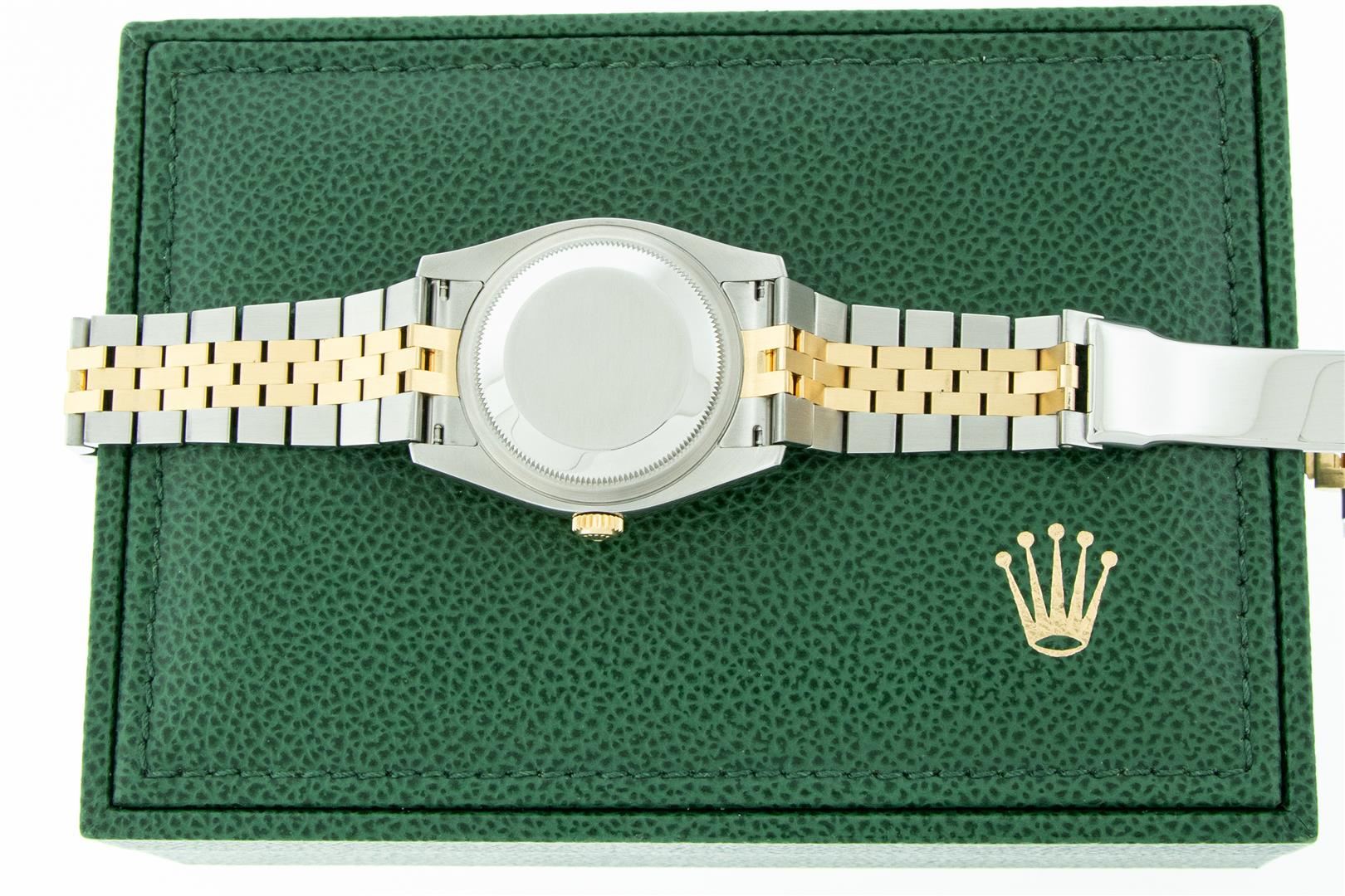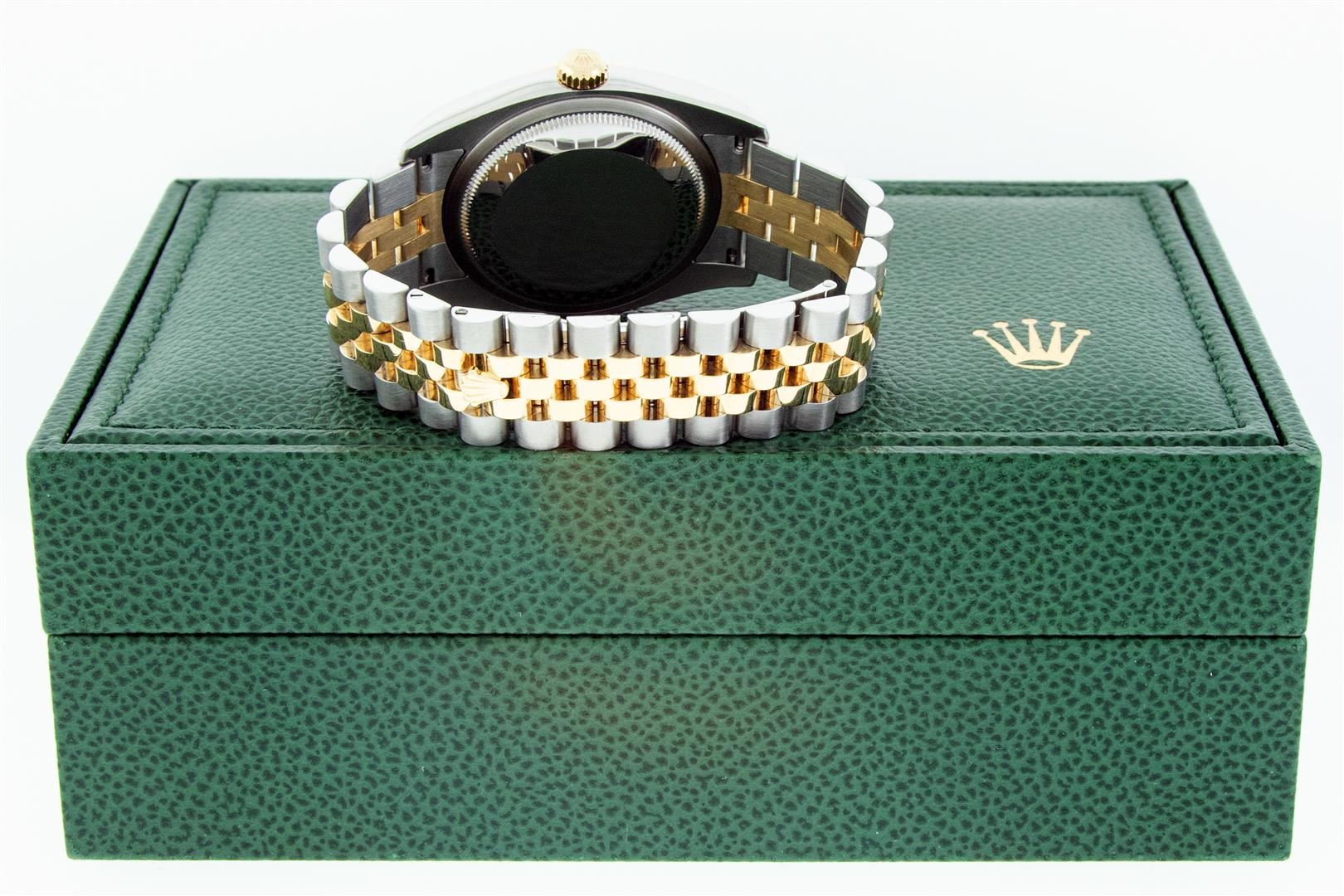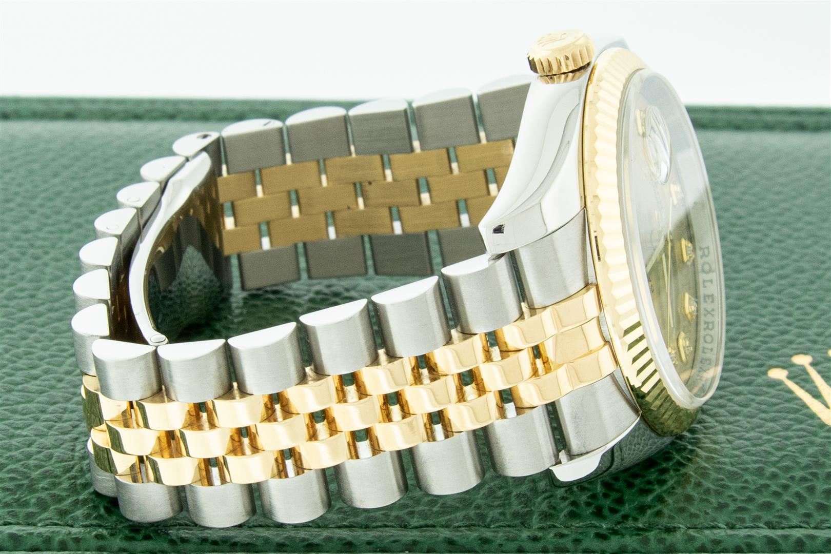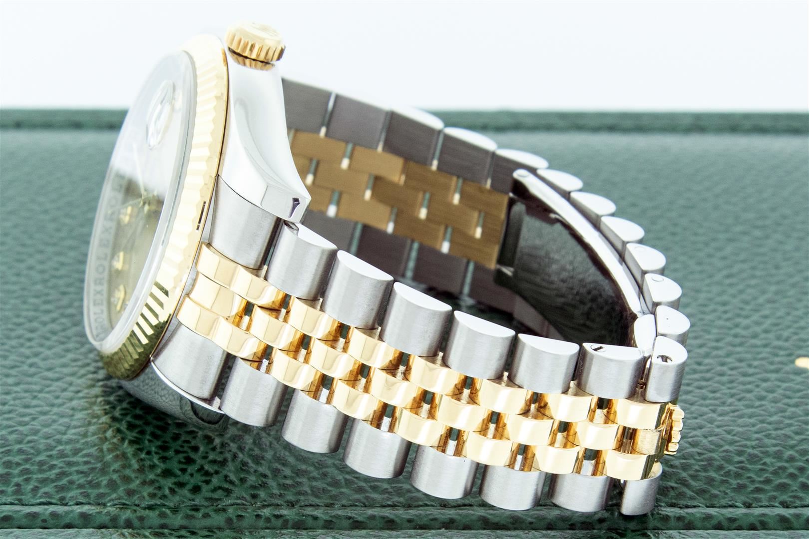 One Mens Pre Owned 18K Yellow Gold and Stainless Steel Two Tone Rolex Datejust Polished, Serviced & Electronically Tested, Rolex Yellow Gold & Stainless Steel Case: 36mm, Rolex Yellow Gold Crown, Rolex Bezel: Rolex 18K Yellow Gold Fluted Bezel. Crystal: Sapphire With Cyclops Lens. Hands: Rolex Hands. Rolex Dial: Rolex Factory Champagne Dial With Diamond Hour Markers. Diamond Count: 10 Diamonds In Dial, Clarity: VVS, Date Window: 3 O'Clock Position Date Display, Quickset, Model: Quickset Datejust 116233. Condition: G-6 Extra Fine. Rolex Bracelet: 18K Yellow Gold and Stainless Steel Jubilee Band. Bright Polish & Satin Finish. 7.0 Inch Length, Adjustable. Standard Clasp, With Rolex Logo. This Watch Comes With A Rolex Box.