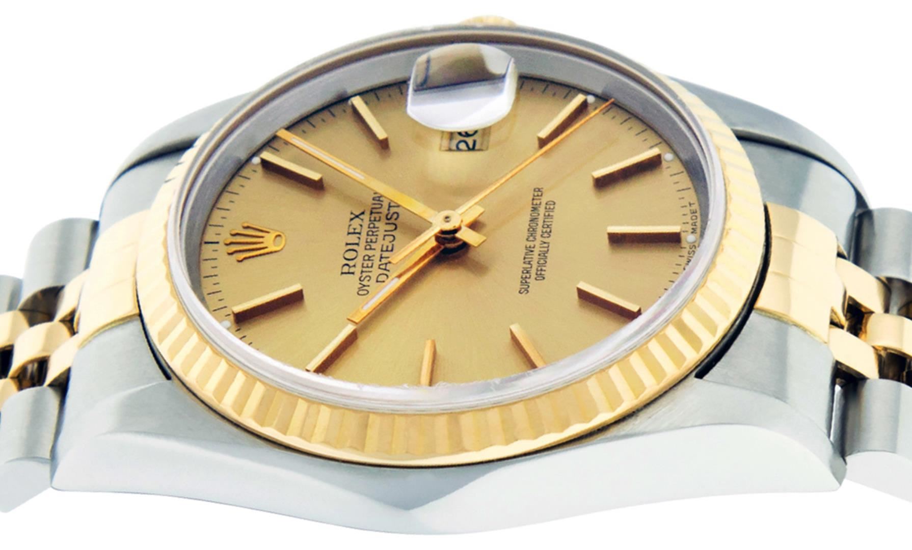 One Men's Rolex Two Tone 18K Yellow Gold And Stainless Steel Datejust Polished, Serviced & Electronically Tested, Yellow Gold & Stainless Steel Case: 36mm, 18K Yellow Gold Crown, Rolex Bezel: 18K Yellow Gold Fluted Bezel. Crystal: Sapphire With Magnified Date Window. Hands: Luminescent Hands. Rolex Movement: Automatic Winding Movement 3135. Rolex Dial: Champagne Dial With Index Hour Markers and Track With Lumi Dots. Date Window: 3 O'Clock Position Date Display, Quickset, Model: Datejust. Condition: G-6 Extra Fine. Rolex Bracelet: Two Tone 18K Yellow Gold & Stainless Steel Jubilee Band. Bright Polish. 7.0 Inch Length, Adjustable. Standard Clasp, With Rolex Logo. This Watch Has Been Serviced Time Tested And Is In Excellent Condition It Is Free Of All Scratches And Dents.