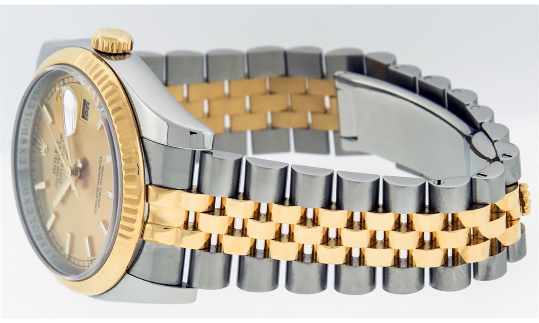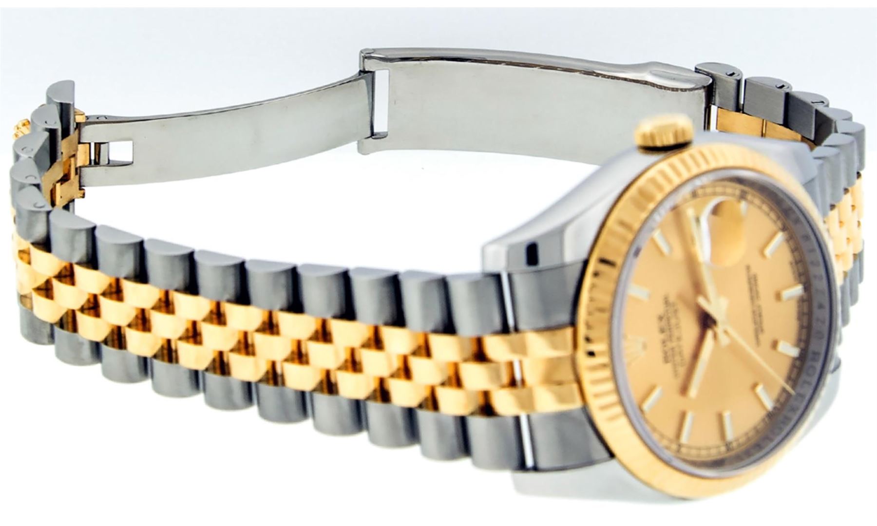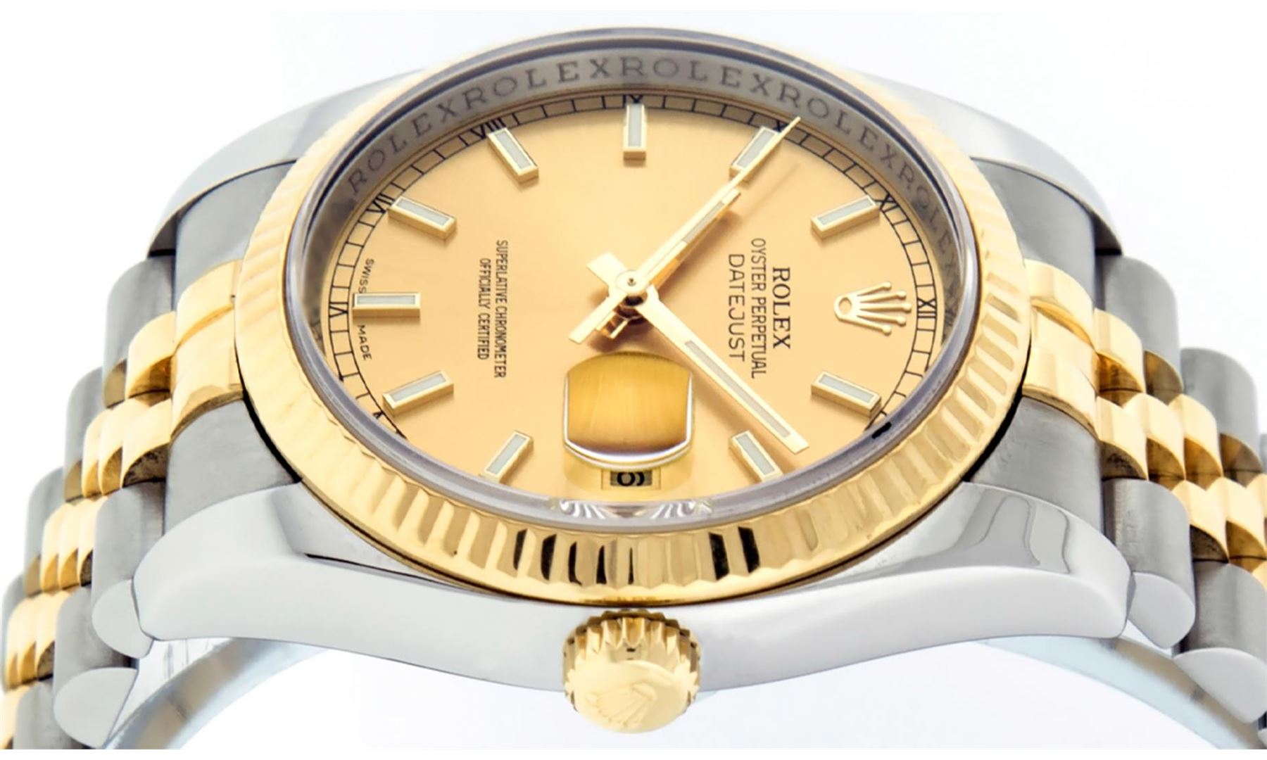 One Men's Rolex Two Tone 18K Yellow Gold And Stainless Steel Datejust, Polished Bright with Satin Finish, Serviced & Electronically Tested, Stainless Steel Case: 36mm, Rolex Yellow Gold Crown, Rolex Bezel: 18K Yellow Gold Fluted Bezel. Crystal: Sapphire With Cyclops Lens. Rolex Movement: Automatic Winding Movement Caliber 3135. Rolex Dial: Champagne Index With Square Roman Track. Date Window: 3 O'Clock Position Date Display, Quickset, Model: Quickset Datejust 116233. Condition: G-6 Extra Fine. Rolex Bracelet: 18K Yellow Gold And Stainless Steel Jubilee Band. Bright Polish & Satin Finish. 7.0 Inch Length, Adjustable. Standard Clasp, With Rolex Logo. This Pre Owned Watch Has Been Serviced Time Tested And Is In Excellent Condition It Is Free Of All Scratches And Dents.