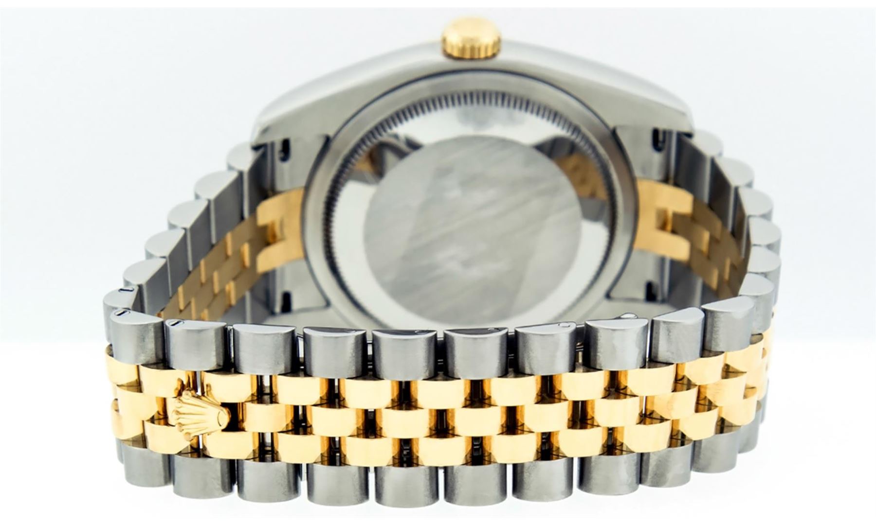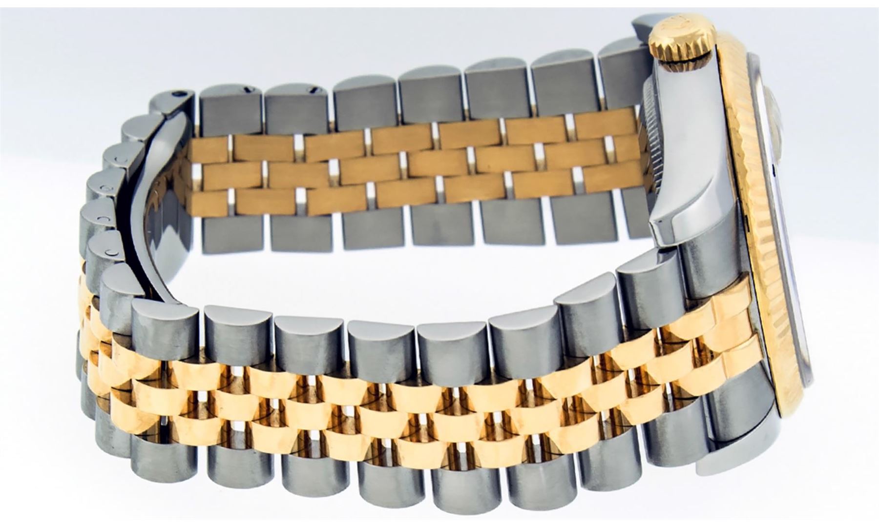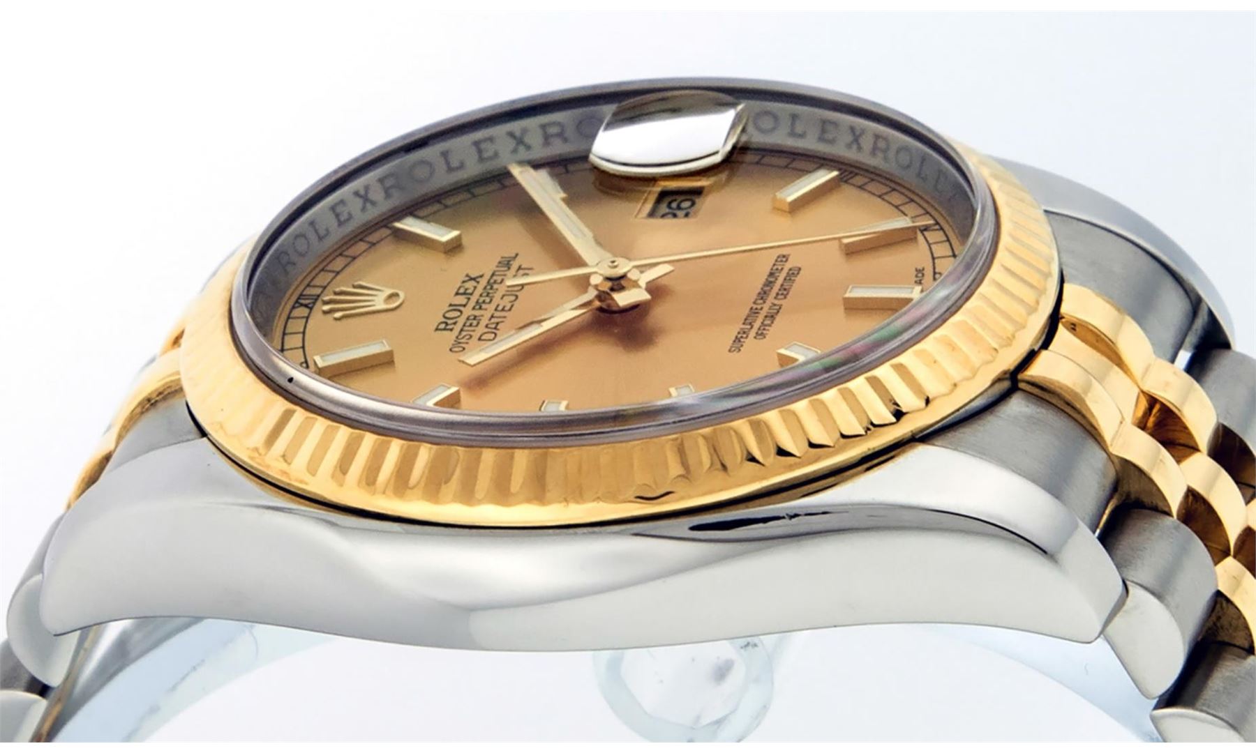 One Men's Rolex Two Tone 18K Yellow Gold And Stainless Steel Datejust, Polished Bright with Satin Finish, Serviced & Electronically Tested, Stainless Steel Case: 36mm, Rolex Yellow Gold Crown, Rolex Bezel: 18K Yellow Gold Fluted Bezel. Crystal: Sapphire With Cyclops Lens. Rolex Movement: Automatic Winding Movement Caliber 3135. Rolex Dial: Champagne Index With Square Roman Track. Date Window: 3 O'Clock Position Date Display, Quickset, Model: Quickset Datejust 116233. Condition: G-6 Extra Fine. Rolex Bracelet: 18K Yellow Gold And Stainless Steel Jubilee Band. Bright Polish & Satin Finish. 7.0 Inch Length, Adjustable. Standard Clasp, With Rolex Logo. This Pre Owned Watch Has Been Serviced Time Tested And Is In Excellent Condition It Is Free Of All Scratches And Dents.