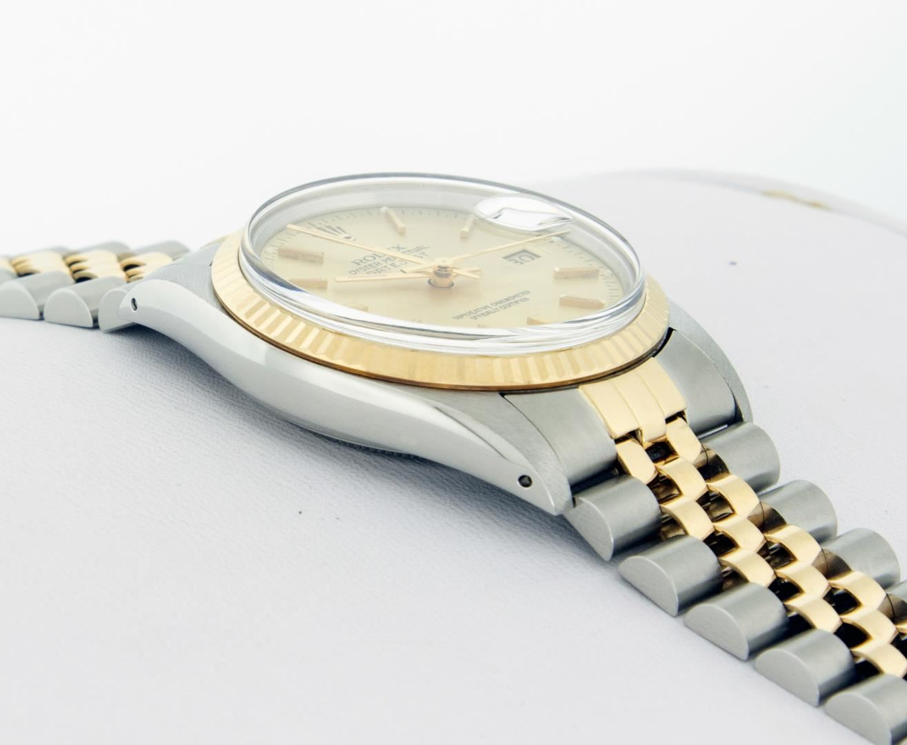 One Men's Rolex Pre Owned 14K Two Tone Yellow Gold And Stainless Steel Datejust Polished, Serviced & Electronically Tested, Yellow Gold & Stainless Steel Case: 36mm, Yellow Gold Crown, Rolex Bezel: 14K Yellow Gold Fluted Bezel. Custom Crystal: New Acrylic With Magnified Date Window. Custom Hands: New Luminescent Hands. Rolex Movement: Automatic Winding Movement 3035. Rolex Dial: Champagne Index Dial With Dash Track & Lumi Dots. Date Window: 3 O'Clock Position Date Display, Quickset, Model: Datejust. Condition: G-6 Extra Fine. Rolex Bracelet: Two Tone 14K Yellow Gold And Stainless Steel Jubilee Band. Bright Polish. 7.0 Inch Length, Adjustable. Standard Clasp, With Rolex Logo. This Watch Has Been Serviced Time Tested And Is In Excellent Condition It Is Free Of All Scratches And Dents.