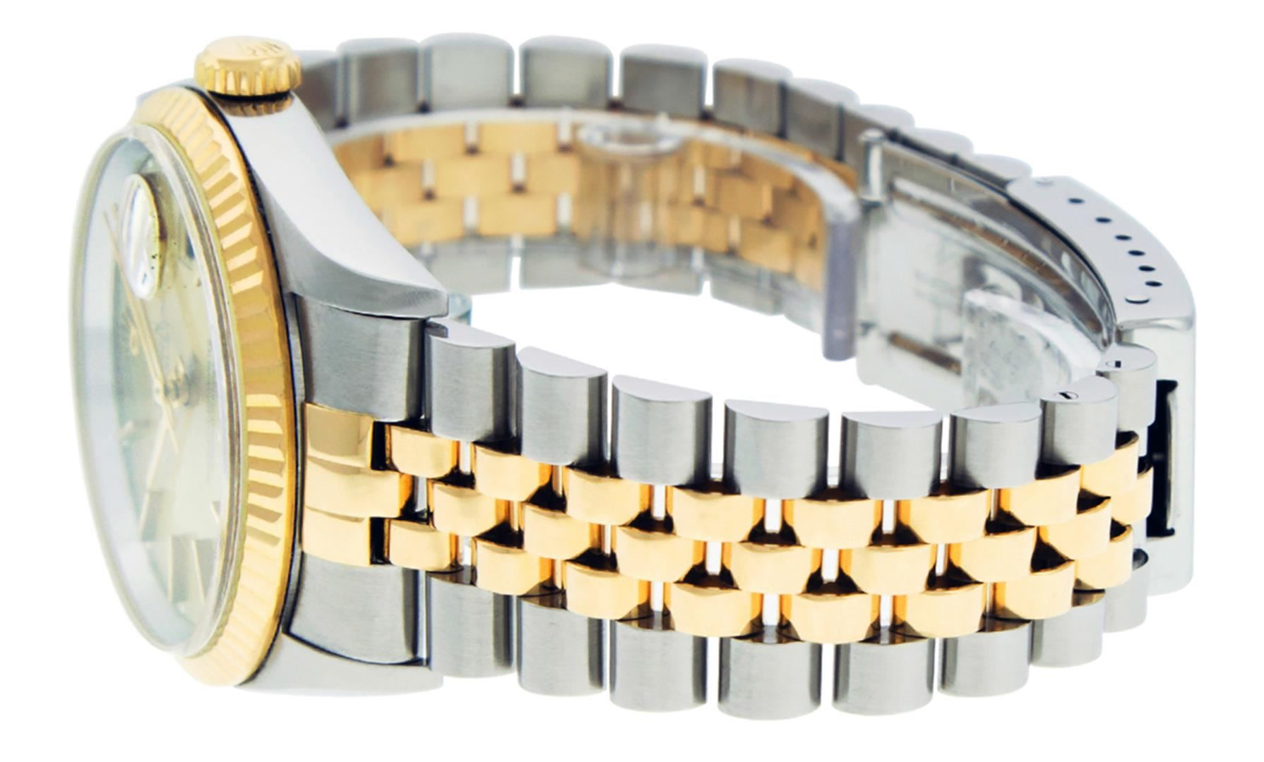 One Men's Rolex Two Tone 18K Yellow Gold And Stainless Steel Datejust Polished, Serviced & Electronically Tested, Yellow Gold & Stainless Steel Case: 36mm, 18K Yellow Gold Crown, Rolex Bezel: 18K Yellow Gold Fluted Bezel. Crystal: Sapphire With Magnified Date Window. Hands: Luminescent Hands. Rolex Movement: Automatic Winding Movement 3135. Rolex Dial: Champagne Dial With Index Hour Markers and Track With Lumi Dots. Date Window: 3 O'Clock Position Date Display, Quickset, Model: Datejust. Condition: G-6 Extra Fine. Rolex Bracelet: Two Tone 18K Yellow Gold & Stainless Steel Jubilee Band. Bright Polish. 7.0 Inch Length, Adjustable. Standard Clasp, With Rolex Logo. This Watch Has Been Serviced Time Tested And Is In Excellent Condition It Is Free Of All Scratches And Dents.
