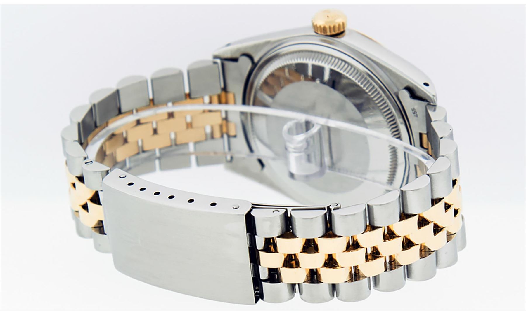 One Men's Rolex Pre Owned 14K Two Tone Yellow Gold And Stainless Steel Datejust Polished, Serviced & Electronically Tested, Yellow Gold & Stainless Steel Case: 36mm, Yellow Gold Crown, Rolex Bezel: 14K Yellow Gold Fluted Bezel. Custom Crystal: New Acrylic With Magnified Date Window. Hands: Luminescent Hands. Rolex Movement: Automatic Winding Movement 3035. Rolex Dial: Champagne Index Dial With Dash Track & Lumi Dots. Date Window: 3 O'Clock Position Date Display, Quickset, Model: Datejust. Condition: G-6 Extra Fine. Rolex Bracelet: Two Tone 14K Yellow Gold And Stainless Steel Jubilee Band. Bright Polish. 7.0 Inch Length, Adjustable. Standard Clasp, With Rolex Logo. This Watch Has Been Serviced Time Tested And Is In Excellent Condition It Is Free Of All Scratches And Dents.