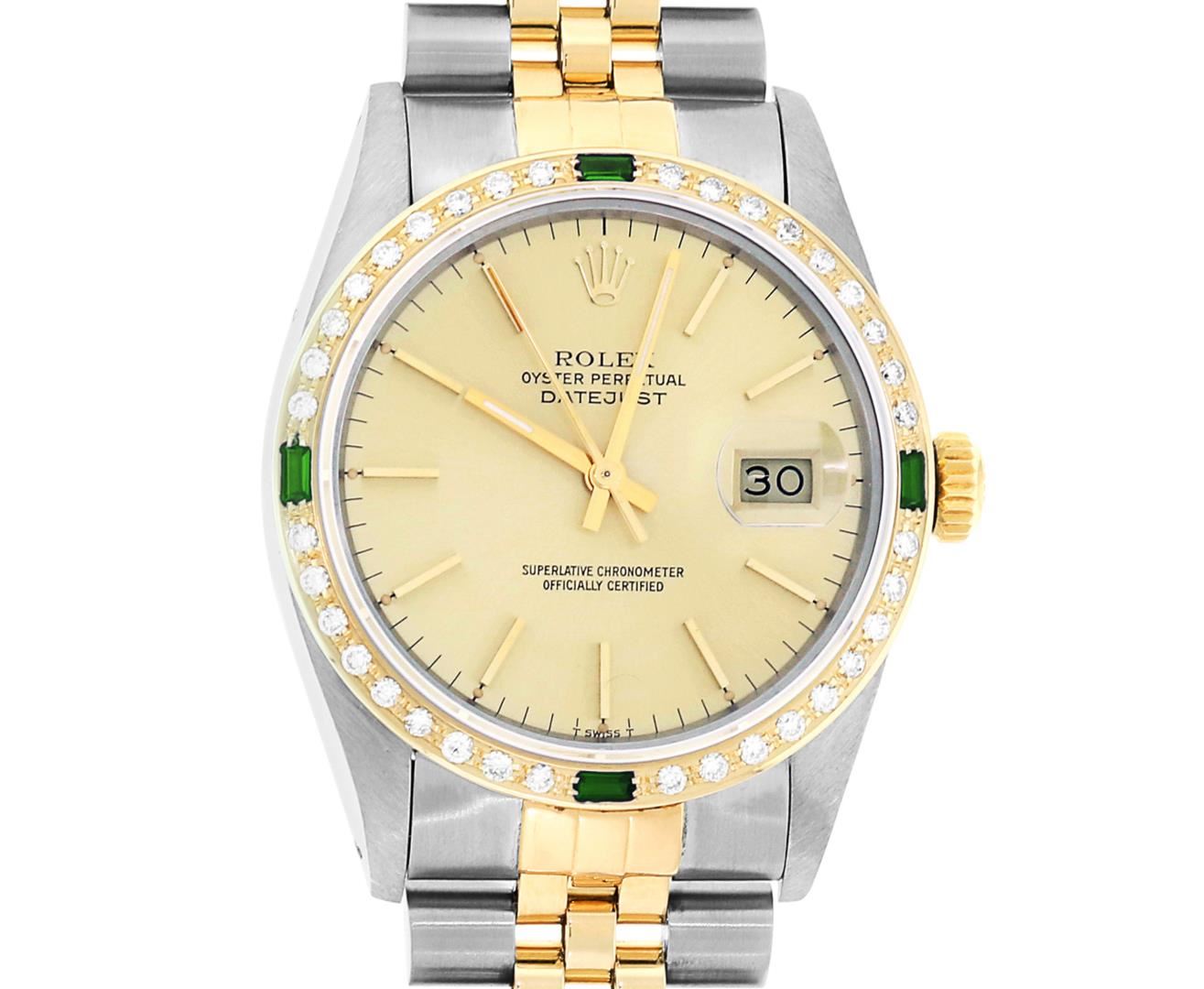 One Men's Rolex Quickset Pre Owned Two Tone 14K Yellow Gold And Stainless Steel Datejust Polished, Serviced & Electronically Tested, Rolex Yellow Gold & Stainless Steel Case: 36mm, Rolex 14K Yellow Gold Crown, Custom Bezel: New 18K Yellow Diamond + Emerald Beadset Bezel, Stone Count: 36 Diamonds + 4 Emeralds, Total Weight .75 Carat, Clarity: SI-VS, Color: G to H. Custom Crystal: New Sapphire With Magnified Date Window. Custom Hands: New Luminescent Hands. Rolex Movement: Automatic Winding Movement 3035. Rolex Dial: Champagne Dial With Index Hour Markers Dash Track And Lumi Dots. Date Window: 3 O'Clock Position Date Display, Quickset, Model: Datejust. Condition: G-6 Extra Fine. Rolex Bracelet: Two Tone 14K Yellow Gold & Stainless Steel Jubilee Band. Bright Polish. 7.0 Inch Length, Adjustable. Standard Clasp, With Rolex Logo. This Watch Has Been Serviced Time Tested And Is In Excellent Condition It Is Free Of All Scratches And Dents.