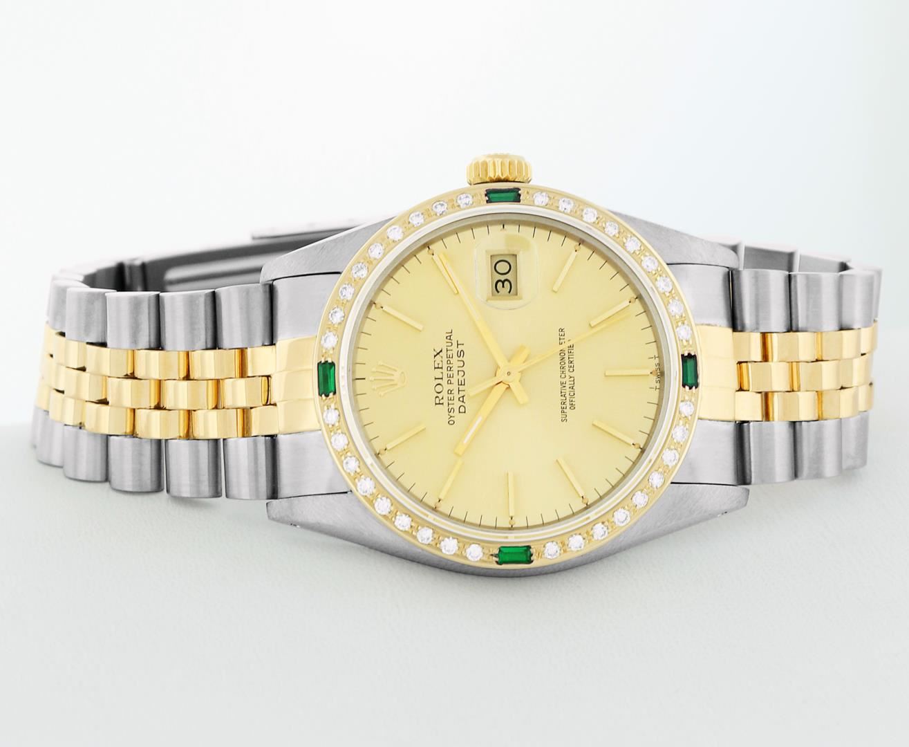 One Men's Rolex Quickset Pre Owned Two Tone 14K Yellow Gold And Stainless Steel Datejust Polished, Serviced & Electronically Tested, Rolex Yellow Gold & Stainless Steel Case: 36mm, Rolex 14K Yellow Gold Crown, Custom Bezel: New 18K Yellow Diamond + Emerald Beadset Bezel, Stone Count: 36 Diamonds + 4 Emeralds, Total Weight .75 Carat, Clarity: SI-VS, Color: G to H. Custom Crystal: New Sapphire With Magnified Date Window. Custom Hands: New Luminescent Hands. Rolex Movement: Automatic Winding Movement 3035. Rolex Dial: Champagne Dial With Index Hour Markers Dash Track And Lumi Dots. Date Window: 3 O'Clock Position Date Display, Quickset, Model: Datejust. Condition: G-6 Extra Fine. Rolex Bracelet: Two Tone 14K Yellow Gold & Stainless Steel Jubilee Band. Bright Polish. 7.0 Inch Length, Adjustable. Standard Clasp, With Rolex Logo. This Watch Has Been Serviced Time Tested And Is In Excellent Condition It Is Free Of All Scratches And Dents.