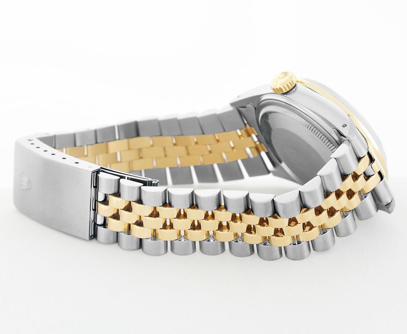 One Men's Rolex Quickset Pre Owned Two Tone 14K Yellow Gold And Stainless Steel Datejust Polished, Serviced & Electronically Tested, Rolex Yellow Gold & Stainless Steel Case: 36mm, Rolex 14K Yellow Gold Crown, Custom Bezel: New 18K Yellow Diamond + Emerald Beadset Bezel, Stone Count: 36 Diamonds + 4 Emeralds, Total Weight .75 Carat, Clarity: SI-VS, Color: G to H. Custom Crystal: New Sapphire With Magnified Date Window. Custom Hands: New Luminescent Hands. Rolex Movement: Automatic Winding Movement 3035. Rolex Dial: Champagne Dial With Index Hour Markers Dash Track And Lumi Dots. Date Window: 3 O'Clock Position Date Display, Quickset, Model: Datejust. Condition: G-6 Extra Fine. Rolex Bracelet: Two Tone 14K Yellow Gold & Stainless Steel Jubilee Band. Bright Polish. 7.0 Inch Length, Adjustable. Standard Clasp, With Rolex Logo. This Watch Has Been Serviced Time Tested And Is In Excellent Condition It Is Free Of All Scratches And Dents.