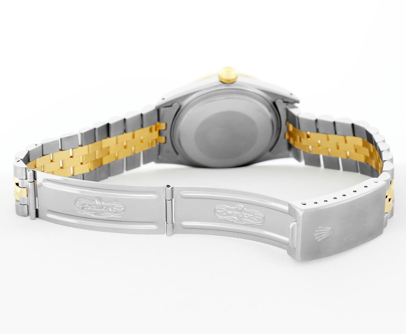 One Men's Rolex Quickset Pre Owned Two Tone 14K Yellow Gold And Stainless Steel Datejust Polished, Serviced & Electronically Tested, Rolex Yellow Gold & Stainless Steel Case: 36mm, Rolex 14K Yellow Gold Crown, Custom Bezel: New 18K Yellow Diamond + Emerald Beadset Bezel, Stone Count: 36 Diamonds + 4 Emeralds, Total Weight .75 Carat, Clarity: SI-VS, Color: G to H. Custom Crystal: New Sapphire With Magnified Date Window. Custom Hands: New Luminescent Hands. Rolex Movement: Automatic Winding Movement 3035. Rolex Dial: Champagne Dial With Index Hour Markers Dash Track And Lumi Dots. Date Window: 3 O'Clock Position Date Display, Quickset, Model: Datejust. Condition: G-6 Extra Fine. Rolex Bracelet: Two Tone 14K Yellow Gold & Stainless Steel Jubilee Band. Bright Polish. 7.0 Inch Length, Adjustable. Standard Clasp, With Rolex Logo. This Watch Has Been Serviced Time Tested And Is In Excellent Condition It Is Free Of All Scratches And Dents.