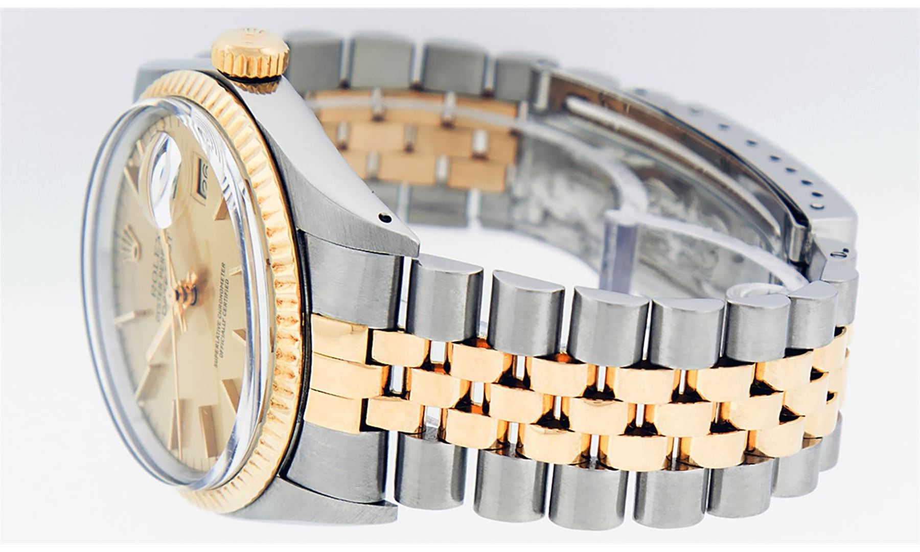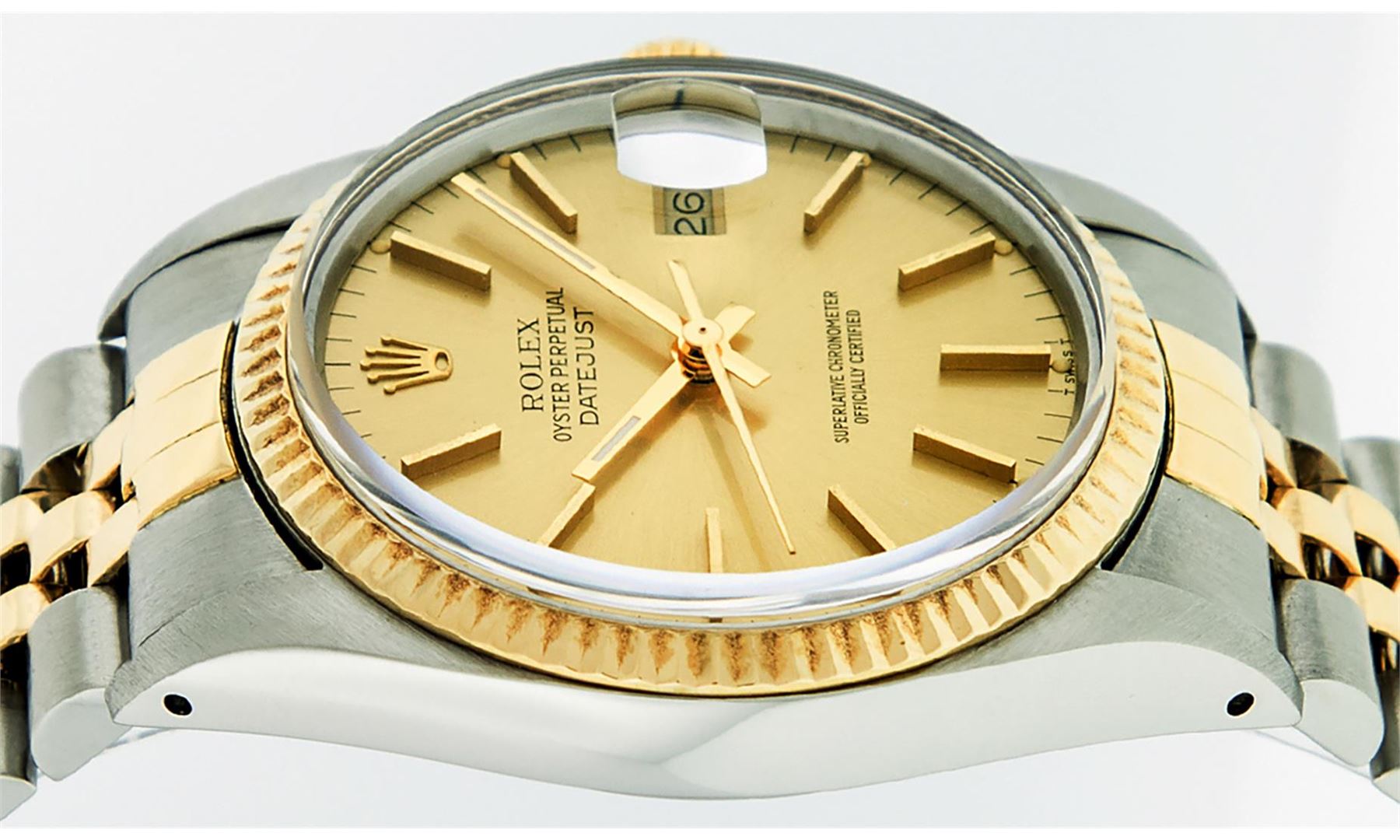 One Men's Yellow Gold Two Tone Rolex Datejust Polished, Serviced & Electronically Tested, Yellow Gold & Stainless Steel Case: 36mm,14K Yellow Gold Crown, Bezel: Yellow Gold Fluted Bezel. Custom Crystal: New Acrylic Cyclops Lens. Custom Hands: New Luminescent Hands. Movement: Automatic Winding Movement. Dial: Champagne Dial With Index Hour Markers and Small Track. Date Window: 3 O'clock Position Date Display, Quickset, Model: Condition: G-6 Extra Fine. Bracelet: Two Tone Yellow Gold & Stainless Steel Jubilee. Bright Polish. 7.0 Inch Length, Adjustable. Standard Clasp, With Rolex Logo. This Watch Has Been Serviced Time Tested And Is In Excellent Condition It Is Free Of All Scratches And Dents.