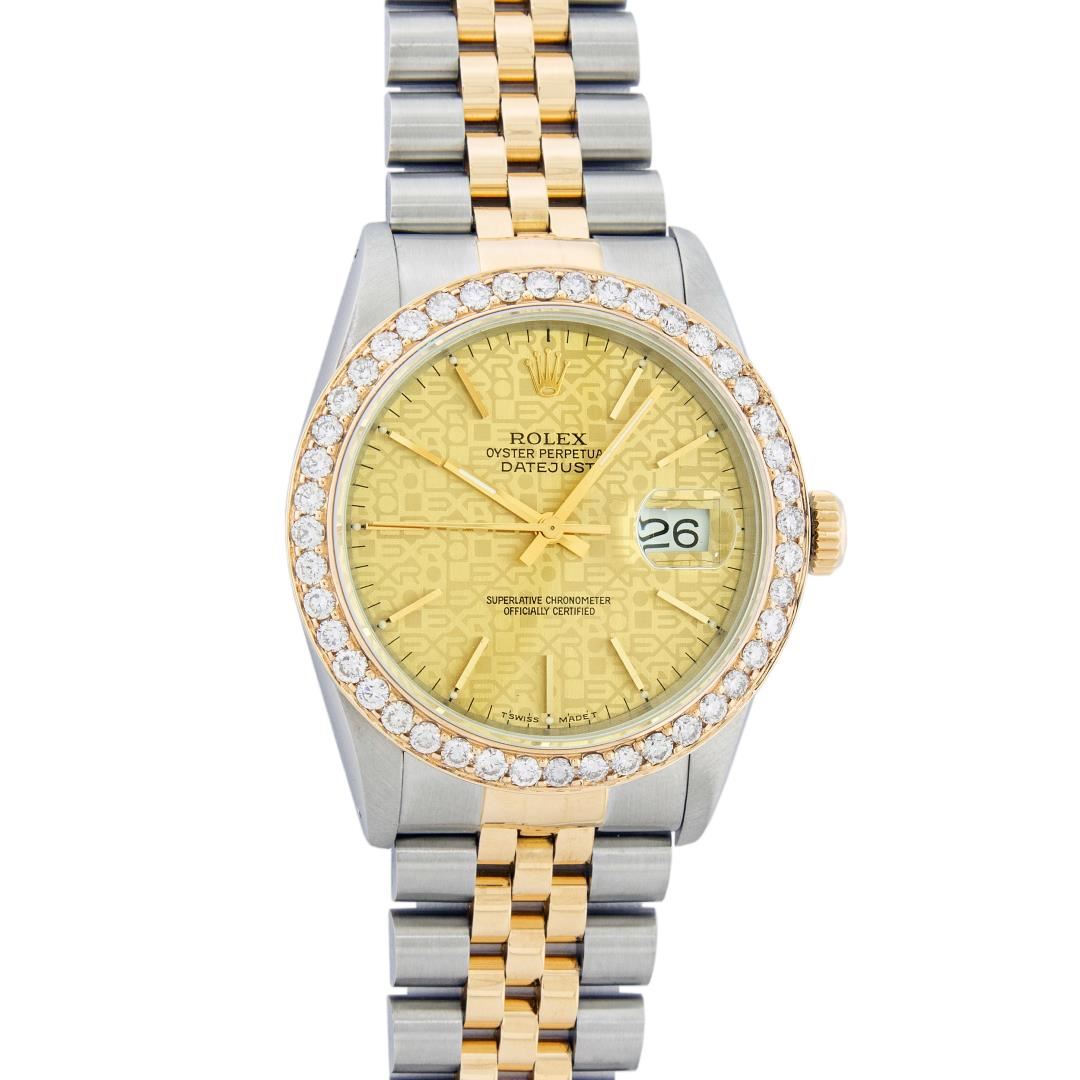 One Men's Rolex Quickset Pre Owned Two Tone 14K Yellow Gold And Stainless Steel Datejust Polished, Serviced & Electronically Tested, Rolex Yellow Gold & Stainless Steel Case: 36mm, Rolex Yellow Gold Crown, Custom Bezel: New 18K Yellow Gold Beadset Diamond Bezel, Diamond Count: 40 Diamonds On Bezel, Total Bezel Weight 2.5 Carat, Clarity: SI-VS, Color: G to H. Custom Crystal: New Sapphire With Magnified Date Window. Custom Hands: New Luminescent Hands. Rolex Movement: Automatic Winding Movement 3035. Rolex Dial: Champagne Jubilee Dial With Index Hour Markers and Small Track With Lumi Dots. Date Window: 3 O'Clock Position Date Display, Quickset, Model: Datejust. Condition: G-6 Extra Fine. Rolex Bracelet: Two Tone 14K Yellow Gold & Stainless Steel Jubilee Band. Bright Polish. 7.0 Inch Length, Adjustable. Standard Clasp, With Rolex Logo. This Watch Has Been Serviced Time Tested And Is In Excellent Condition It Is Free Of All Scratches And Dents.