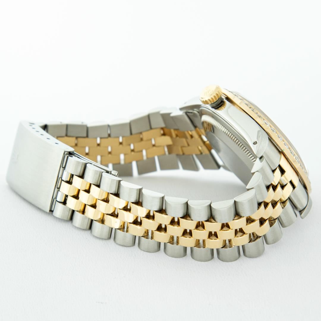 One Men's Rolex Quickset Pre Owned Two Tone 14K Yellow Gold And Stainless Steel Datejust Polished, Serviced & Electronically Tested, Rolex Yellow Gold & Stainless Steel Case: 36mm, Rolex Yellow Gold Crown, Custom Bezel: New 18K Yellow Gold Beadset Diamond Bezel, Diamond Count: 40 Diamonds On Bezel, Total Bezel Weight 2.5 Carat, Clarity: SI-VS, Color: G to H. Custom Crystal: New Sapphire With Magnified Date Window. Custom Hands: New Luminescent Hands. Rolex Movement: Automatic Winding Movement 3035. Rolex Dial: Champagne Jubilee Dial With Index Hour Markers and Small Track With Lumi Dots. Date Window: 3 O'Clock Position Date Display, Quickset, Model: Datejust. Condition: G-6 Extra Fine. Rolex Bracelet: Two Tone 14K Yellow Gold & Stainless Steel Jubilee Band. Bright Polish. 7.0 Inch Length, Adjustable. Standard Clasp, With Rolex Logo. This Watch Has Been Serviced Time Tested And Is In Excellent Condition It Is Free Of All Scratches And Dents.